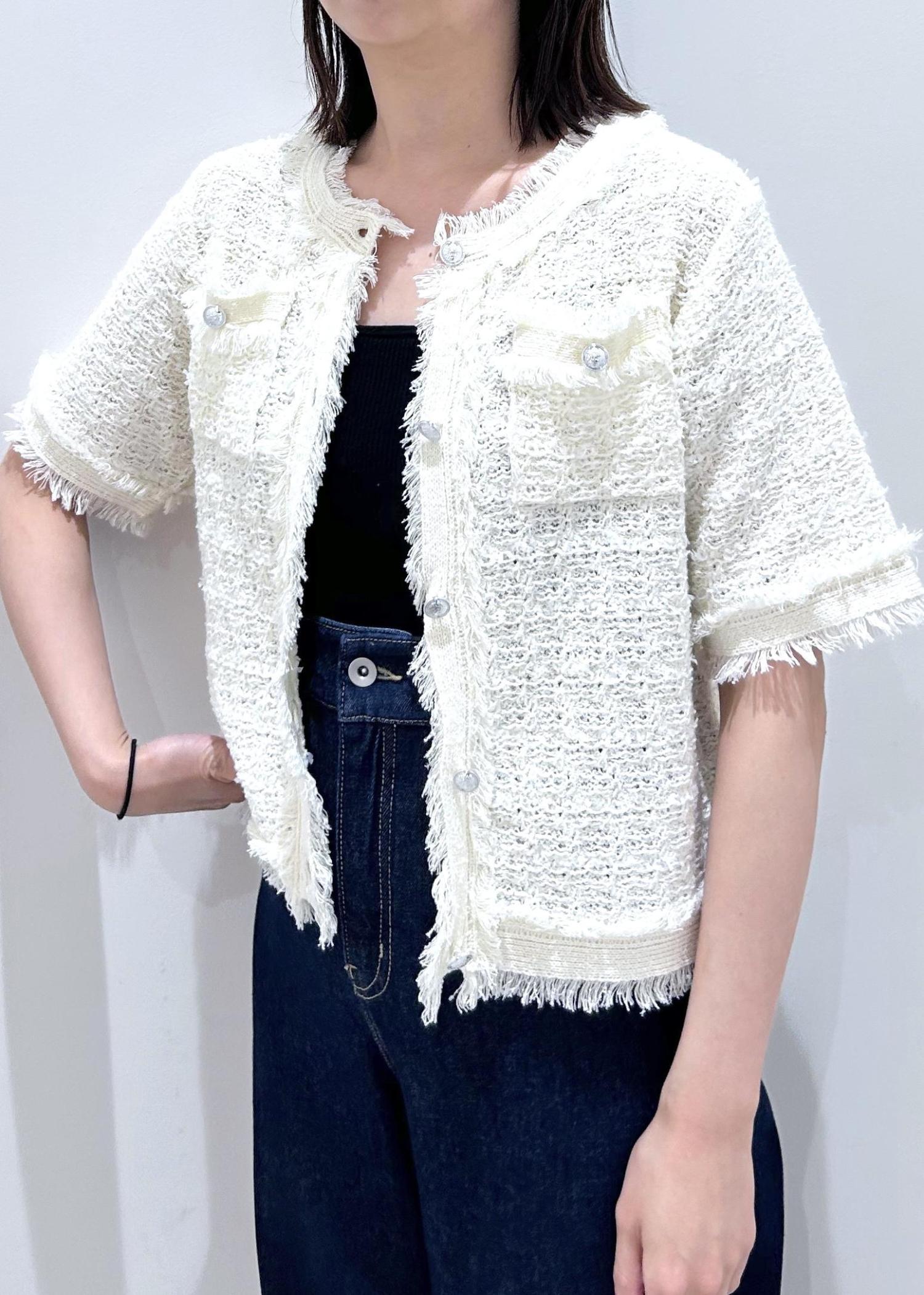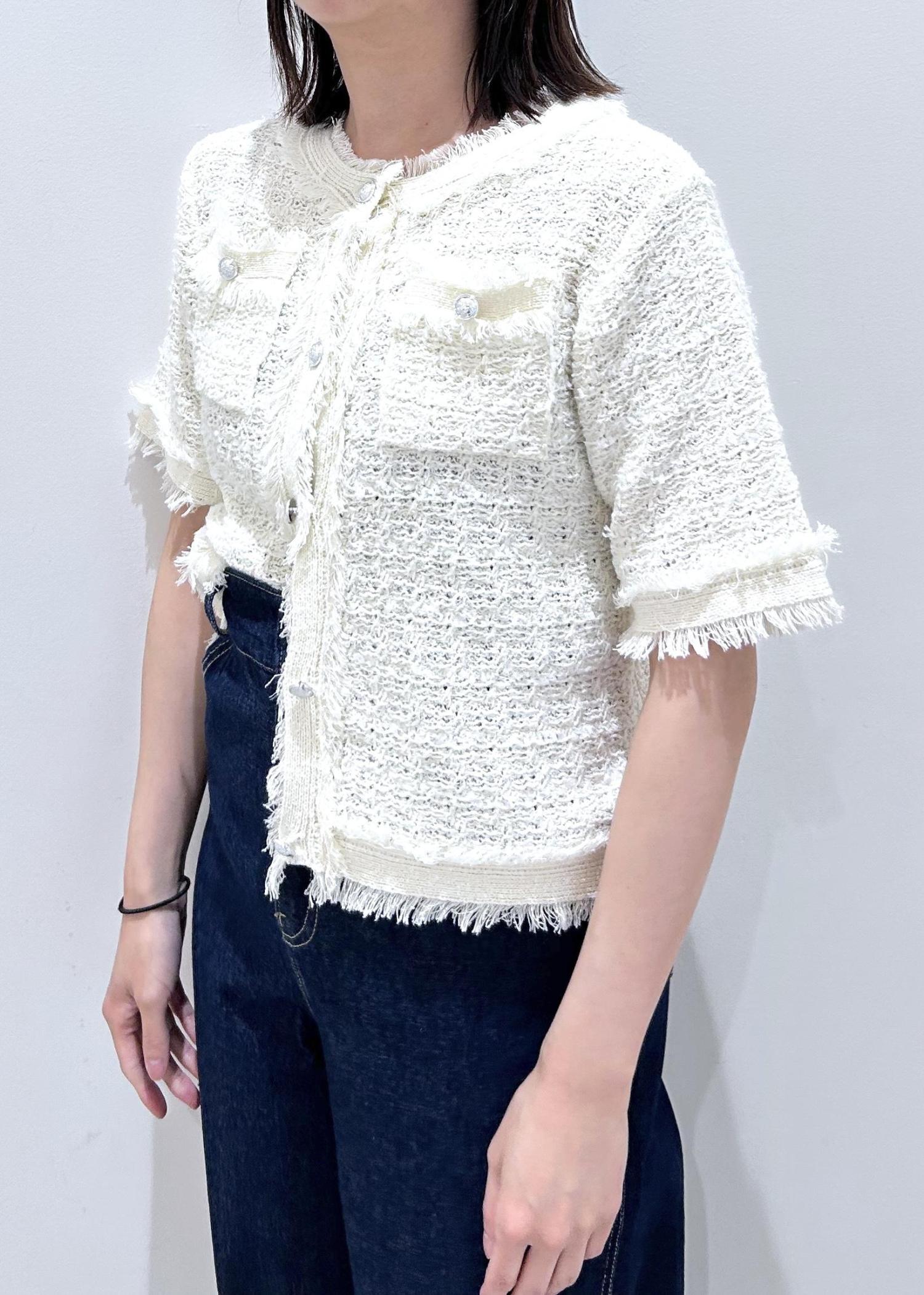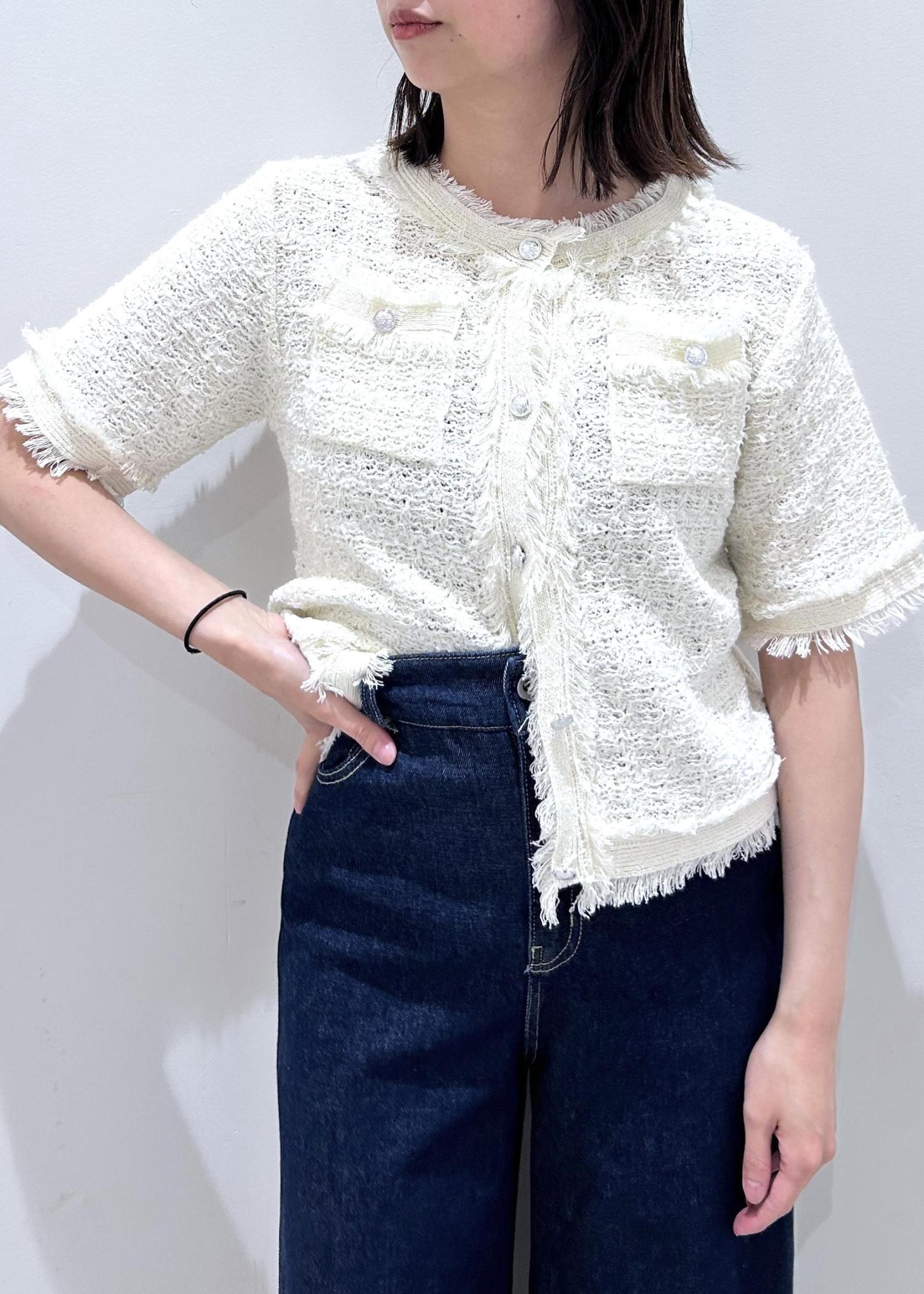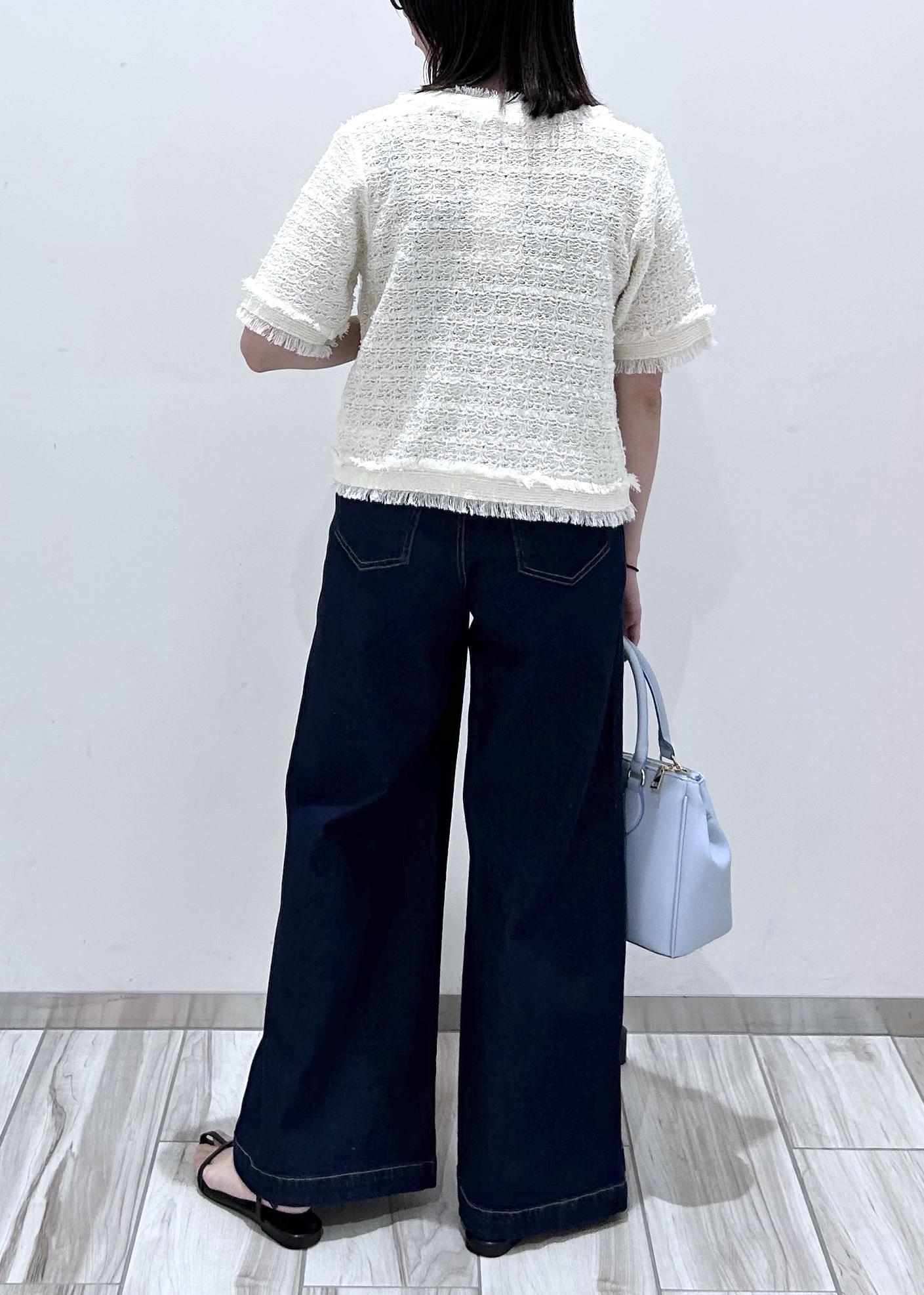 ツイード素材が上品な印象を与える白の半袖ニットに、あえてデニムを合わせた大人のきれいめカジュアルコーデ。