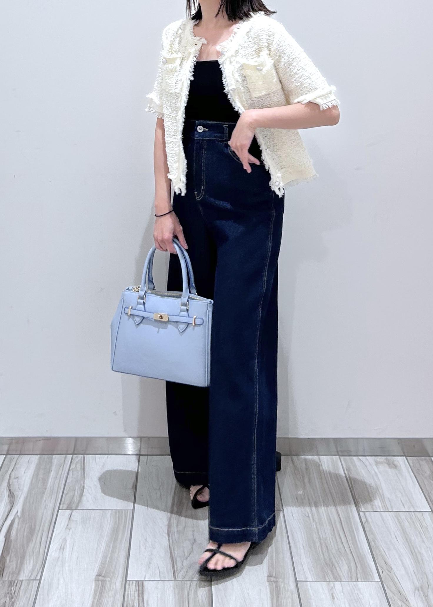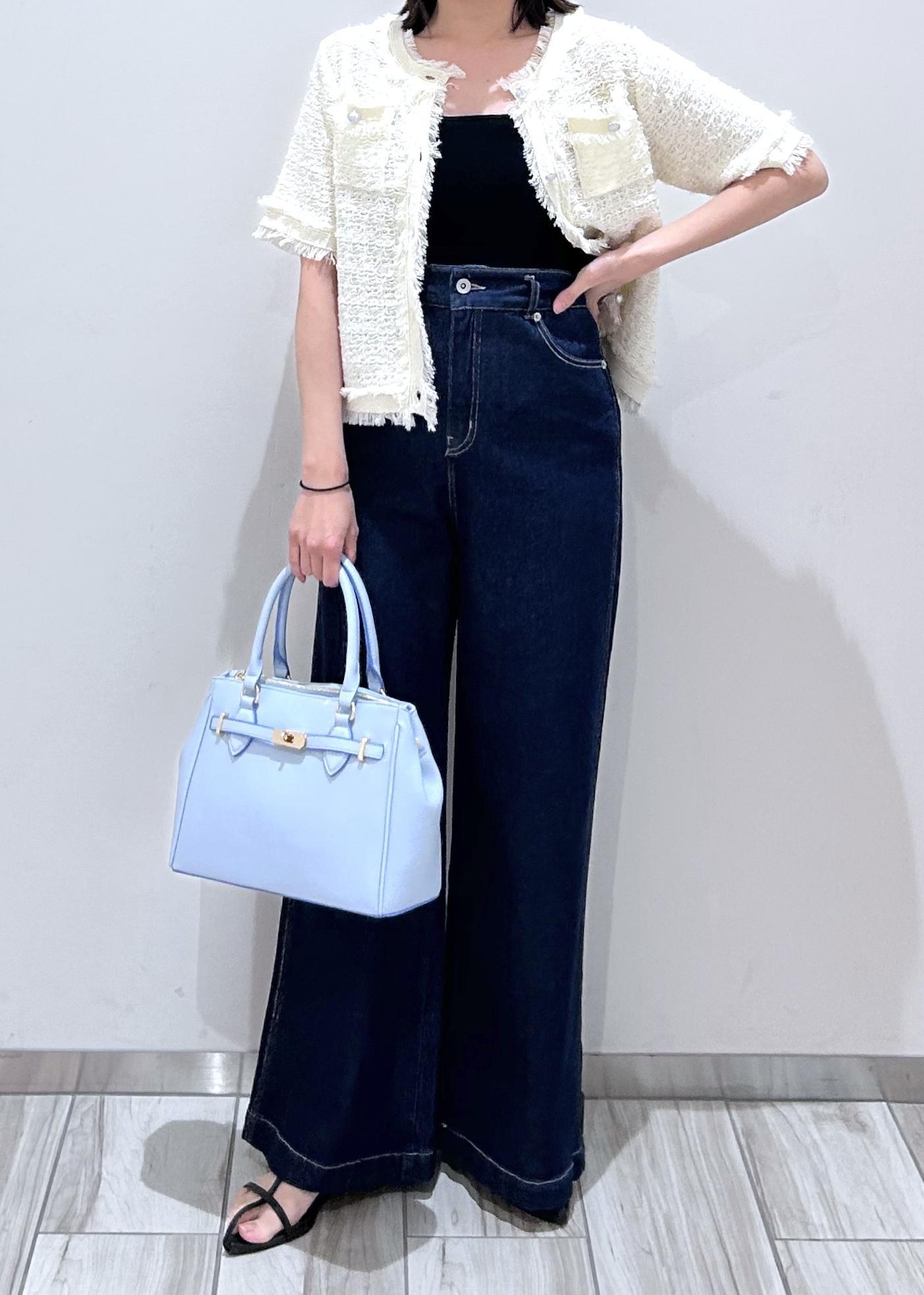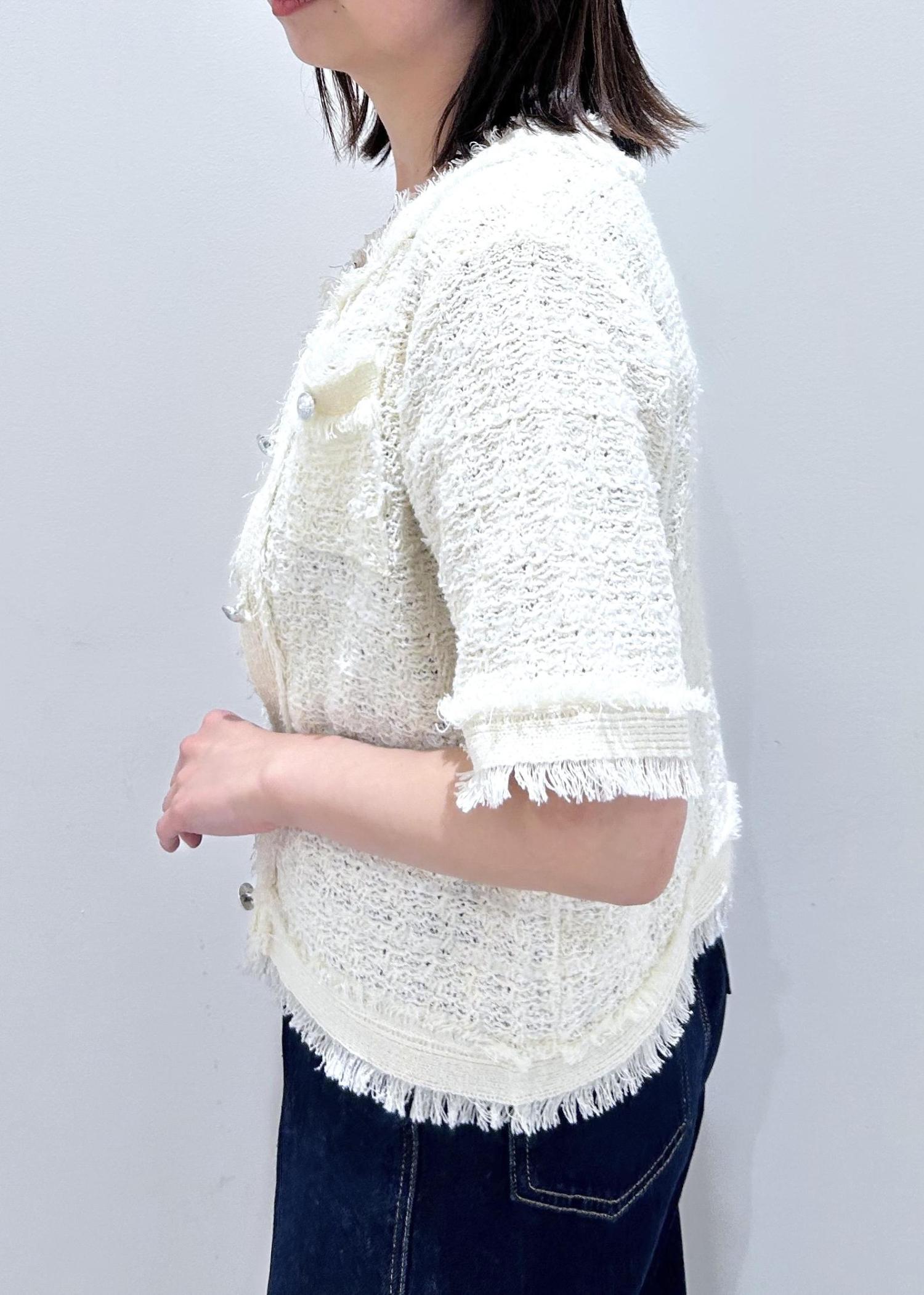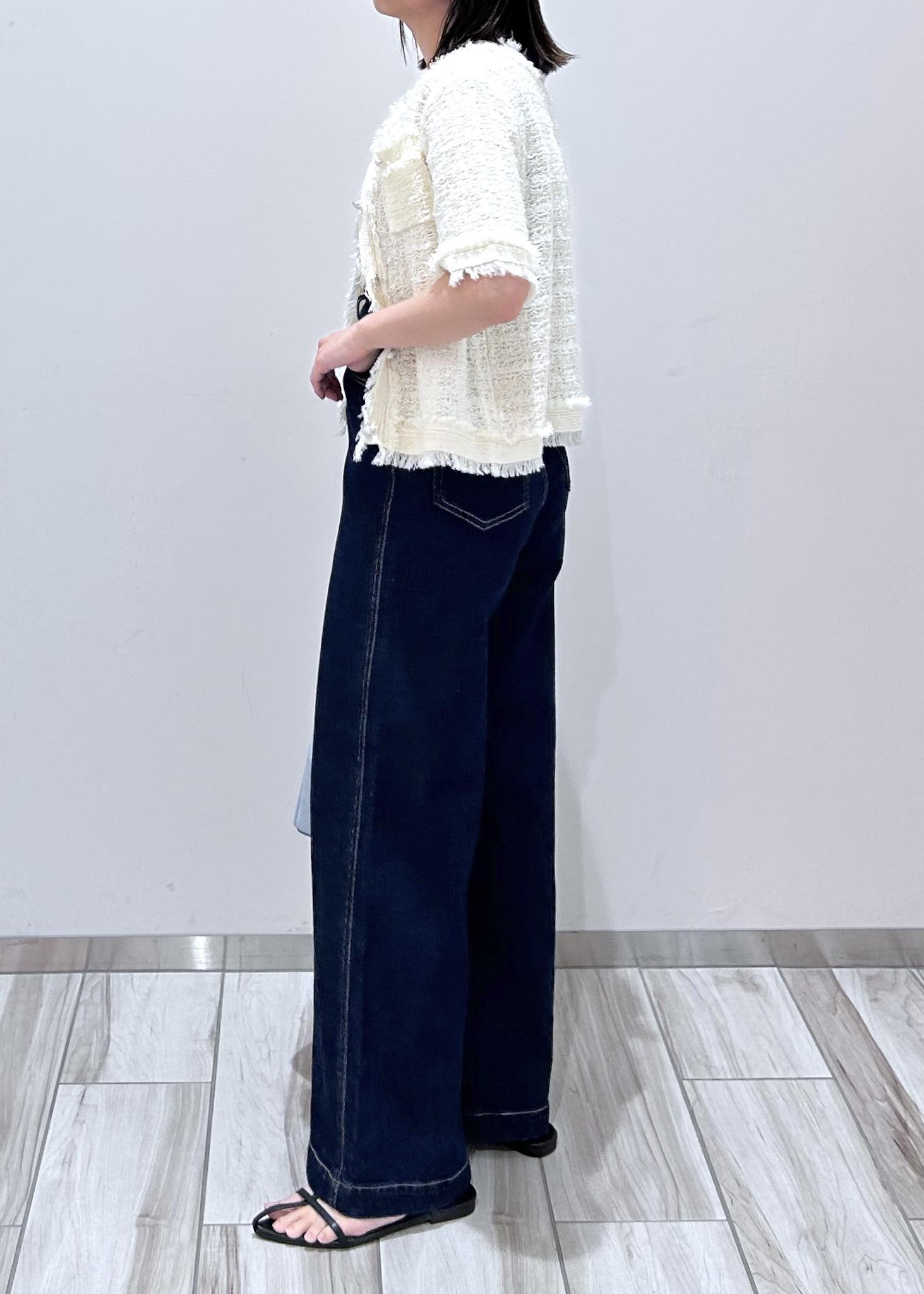 ツイード素材が上品な印象を与える白の半袖ニットに、あえてデニムを合わせた大人のきれいめカジュアルコーデ。
