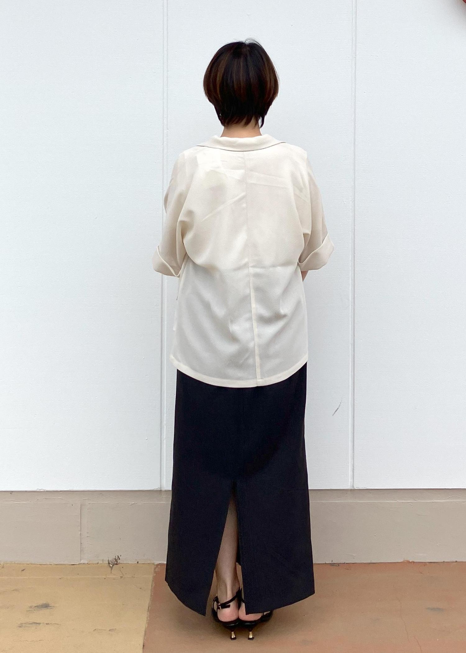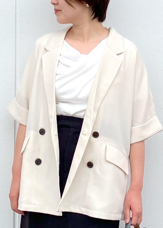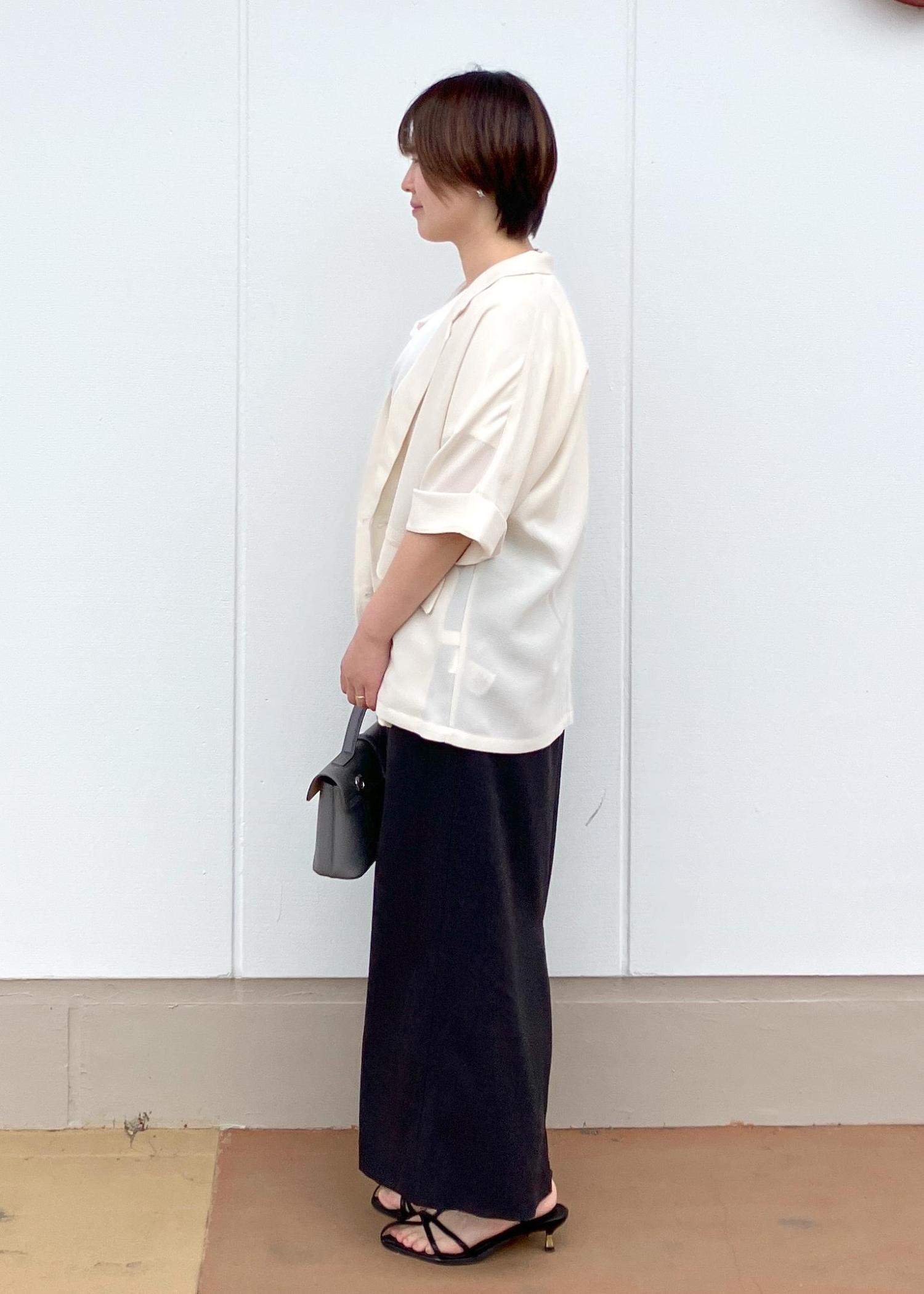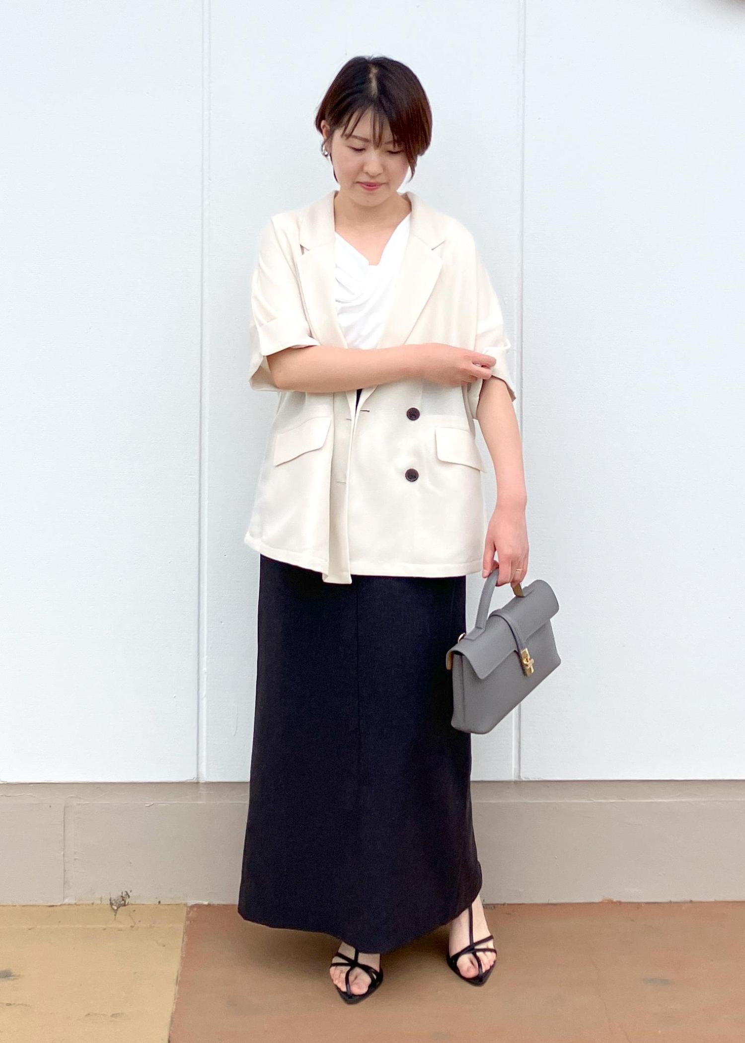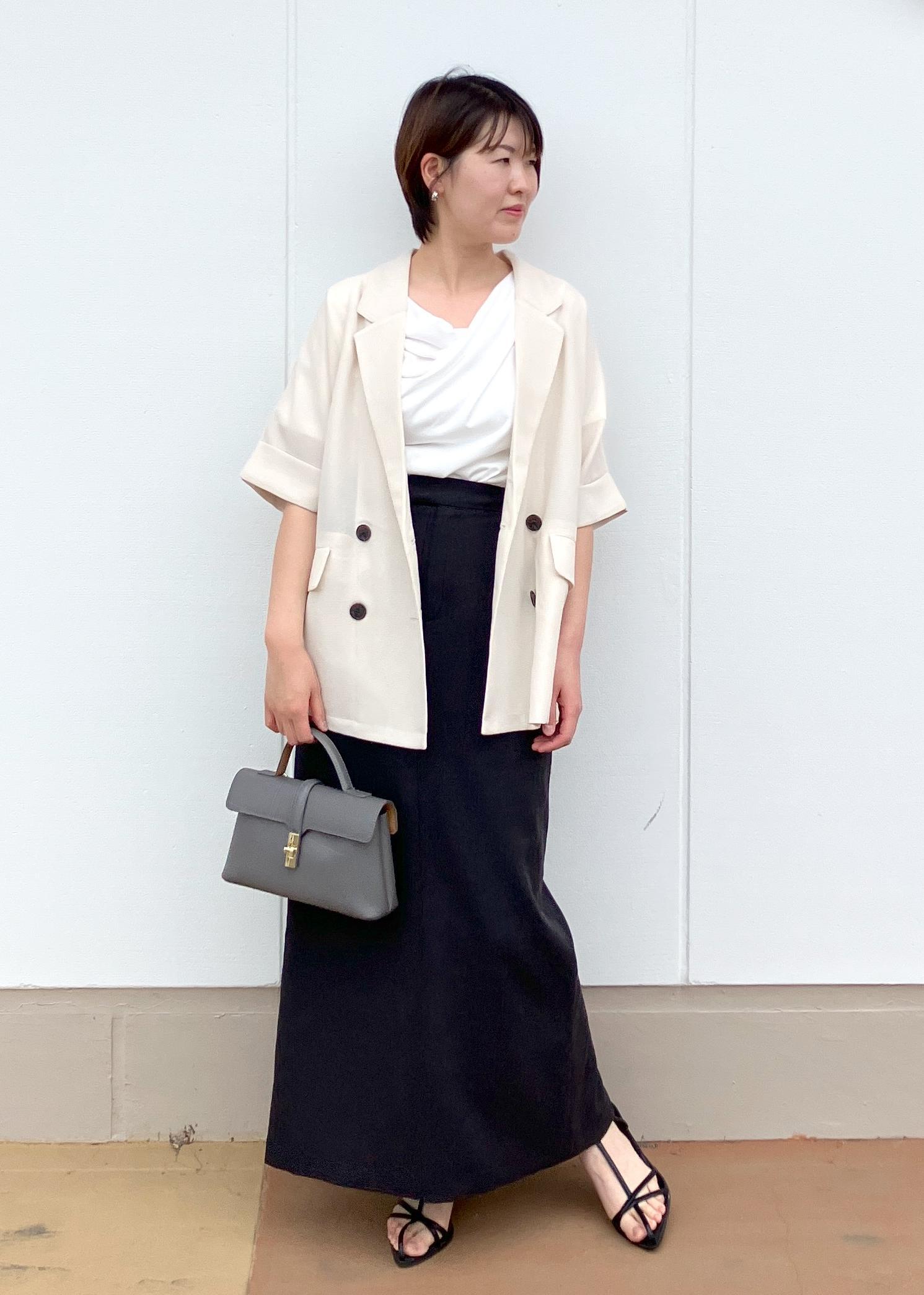 寒暖差があるこれからの梅雨時期には5分袖のメッシュジャケットが大活躍します!ゆったりサイズなのてボトムには黒のIラインスカートですっきり綺麗めな印象にしてみました!