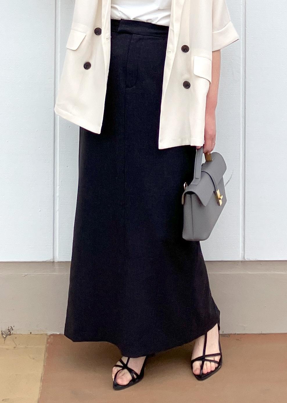 です!カジュアルな素材ですがデザインはIラインなのでスタイリッシュで綺麗めな印象に!ウエストにゴムが入っているのでリラックスして着用できます!後ろのスリットが深めで歩きやすいです! -