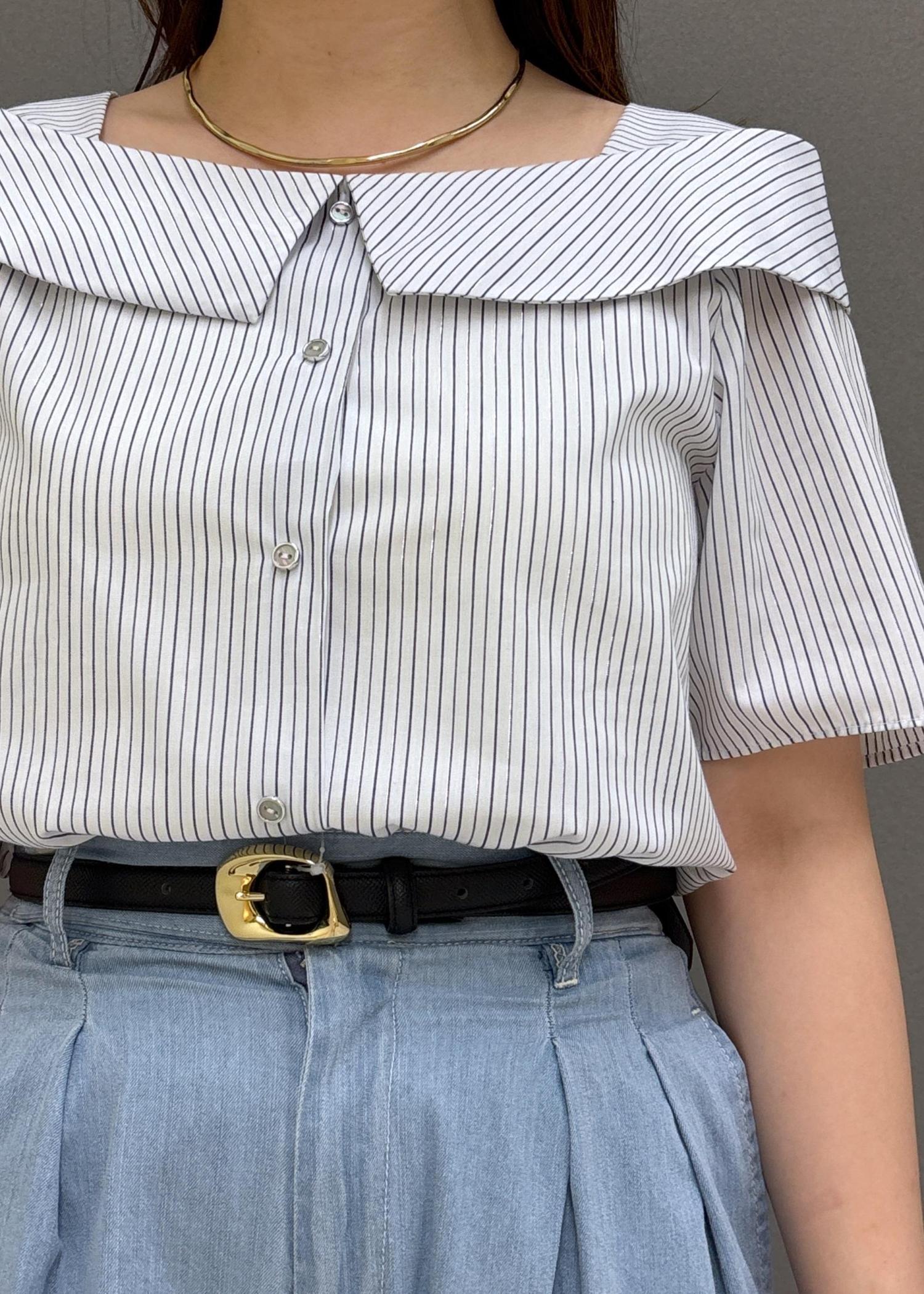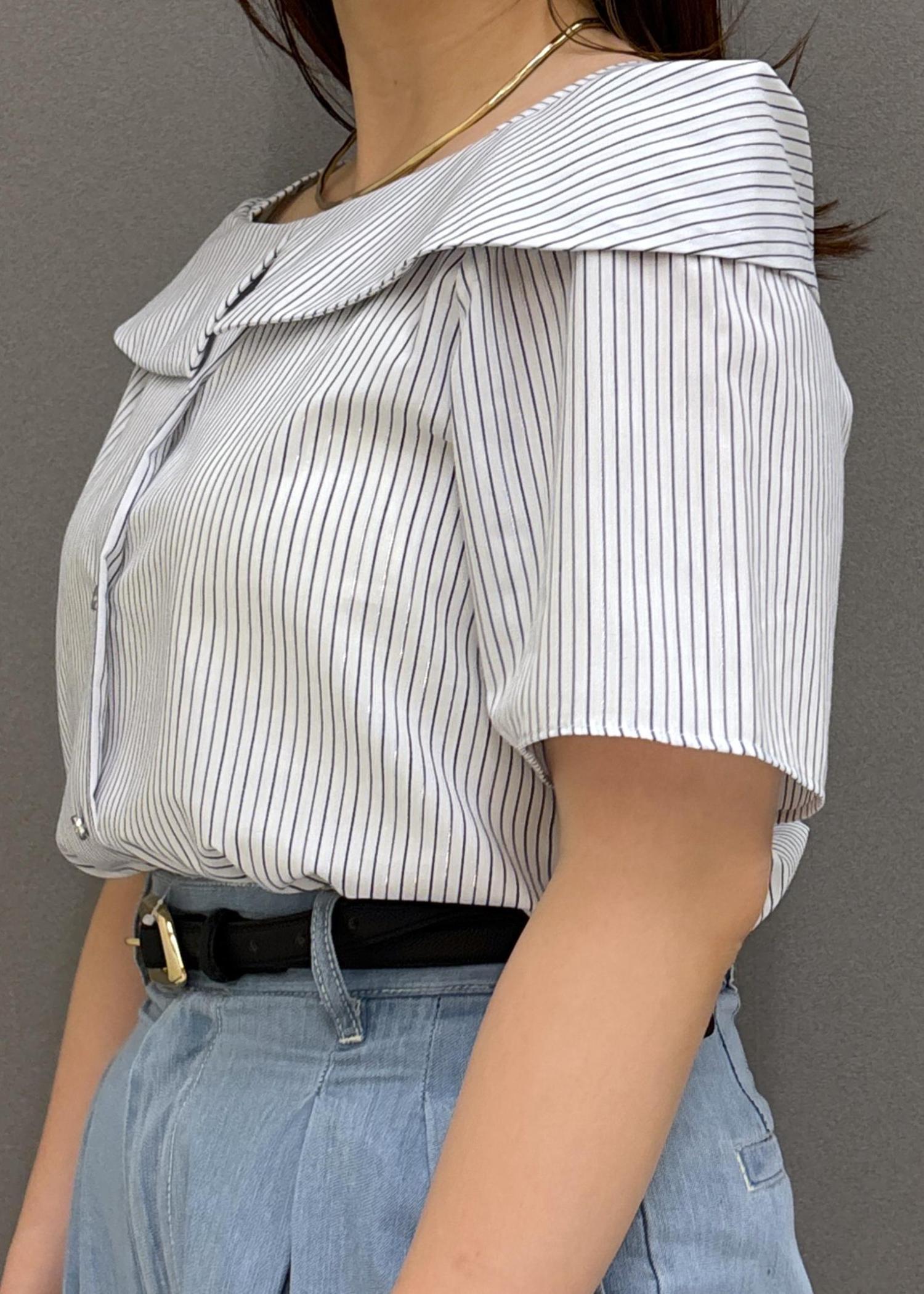VIS【新色追加】【防シワ】ラメミックスオフショルダー風ストライプシャツホワイト系 / F¥5,489レビューインナーのストラップが見えにくいオフショル風シャツ♩細かいラメが入っているので上品な印象に!160㎝だと腰は隠れる着丈でアウトスタイルでもバランスがとりやすい長さです!