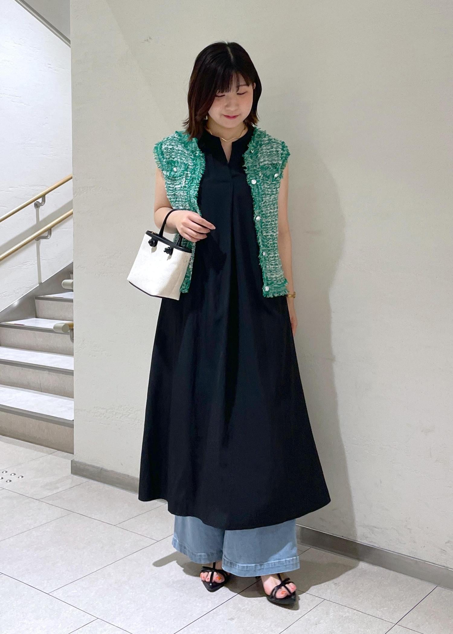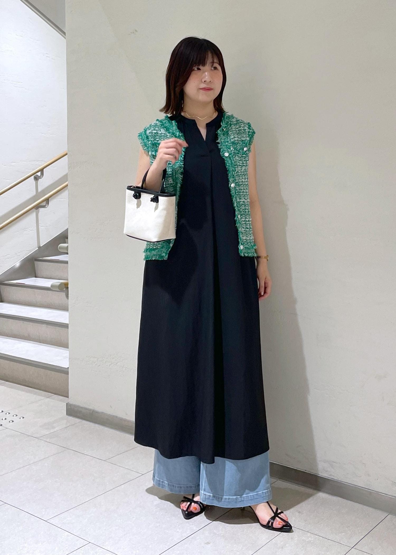 黒ワンピ×ツイードだけだとしっかりキレイめでまとまりますが、カジュアルさを出したかったのでデニムを合わせました。