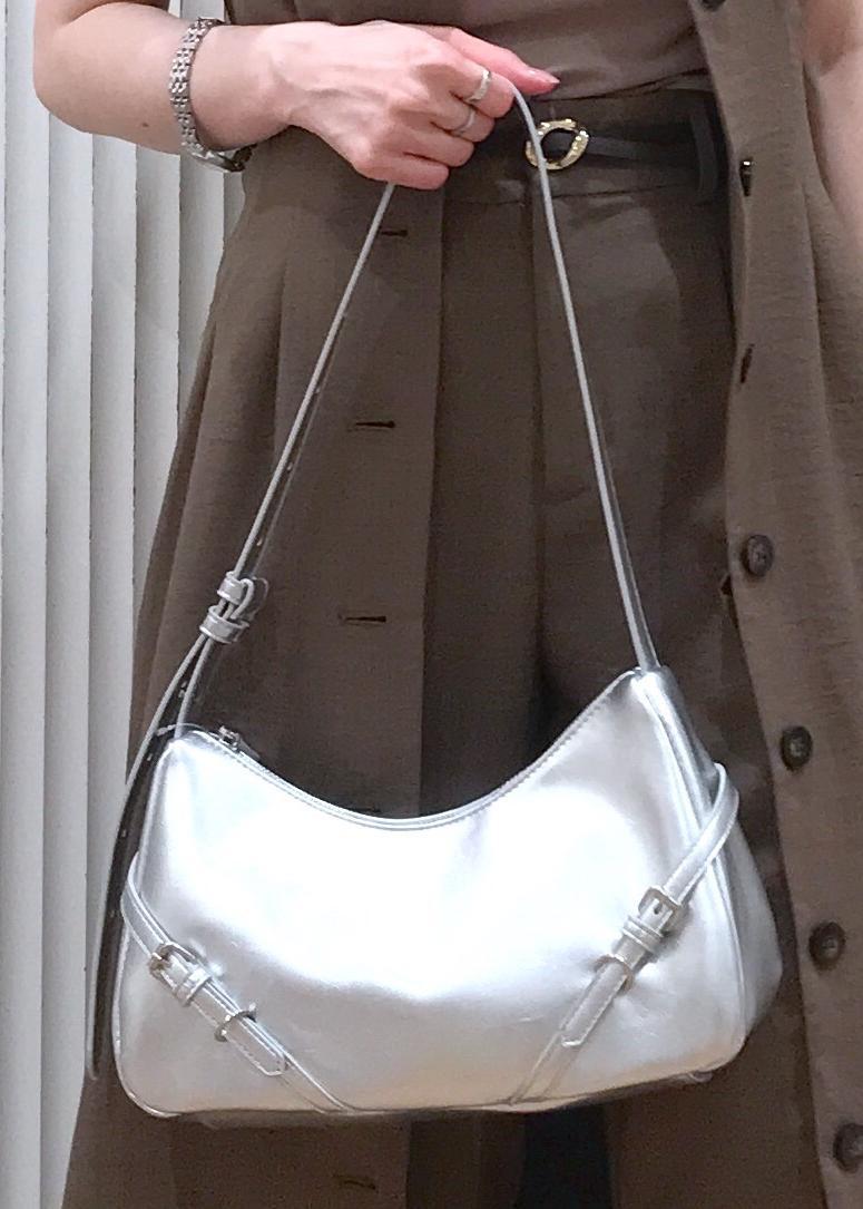 アウトレットVISフロントベルトショルダーバッグシルバー / F¥2,768レビューマチが広めで、500mlペットボトルや長財布、メイクポーチをゆとりを持って入れられます。
