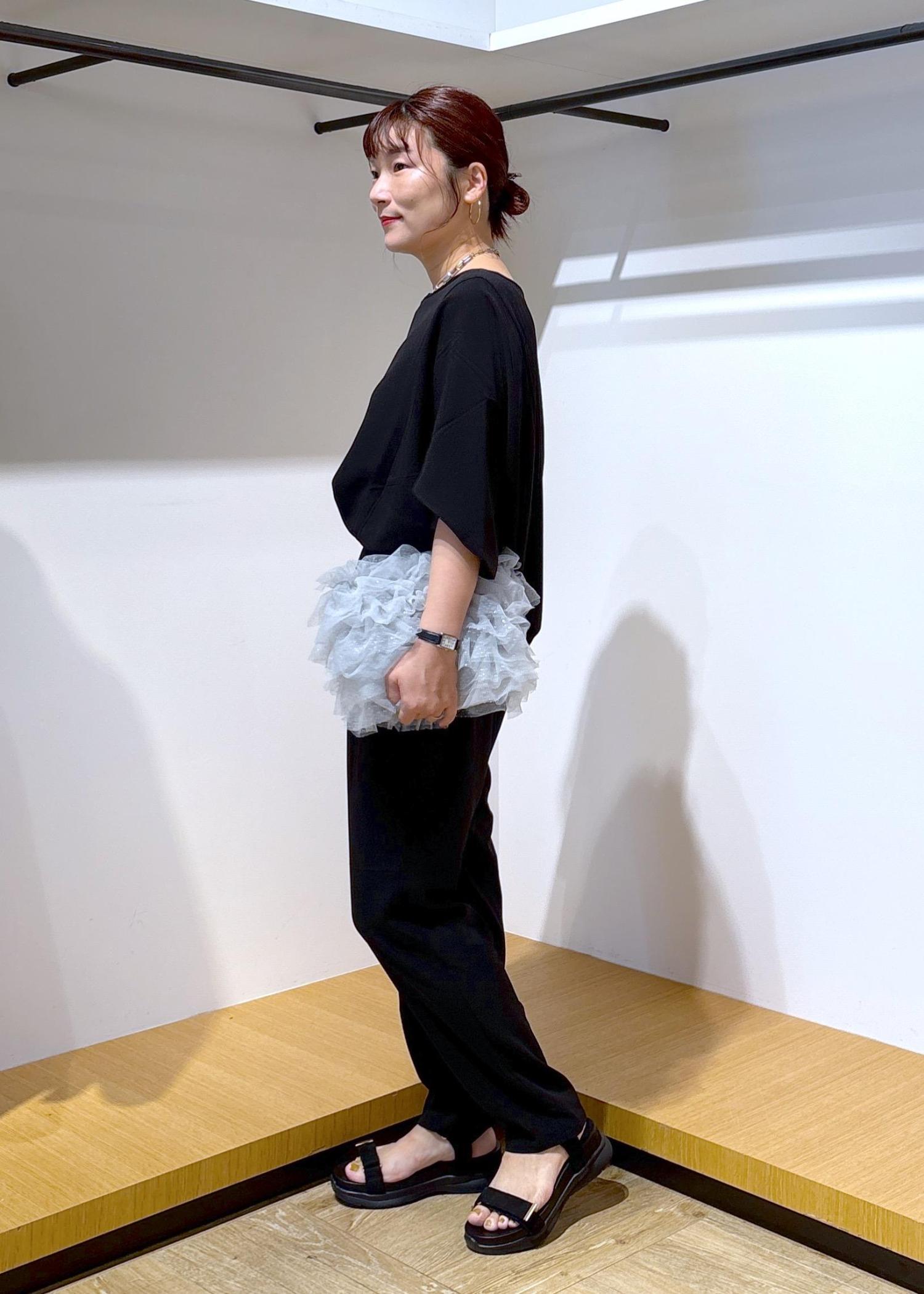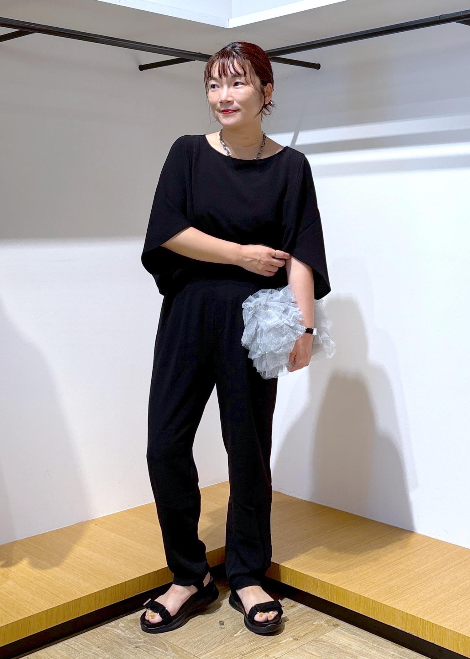 オールブラックが重たく見えないよう足元はサンダルで抜け感を出しました。