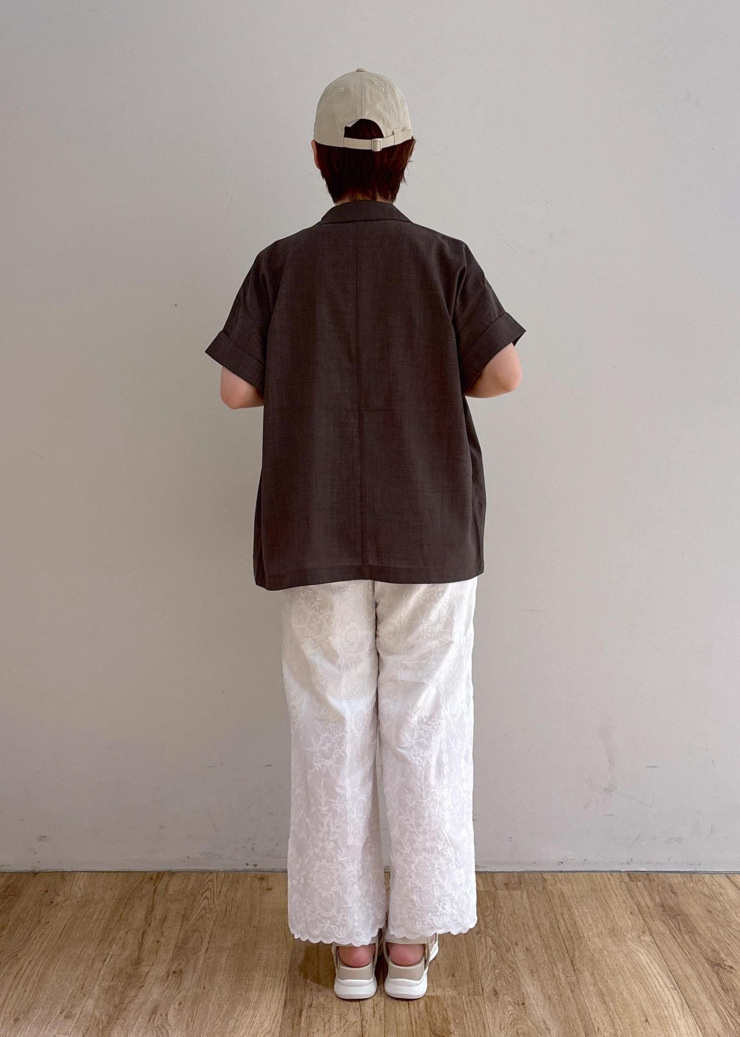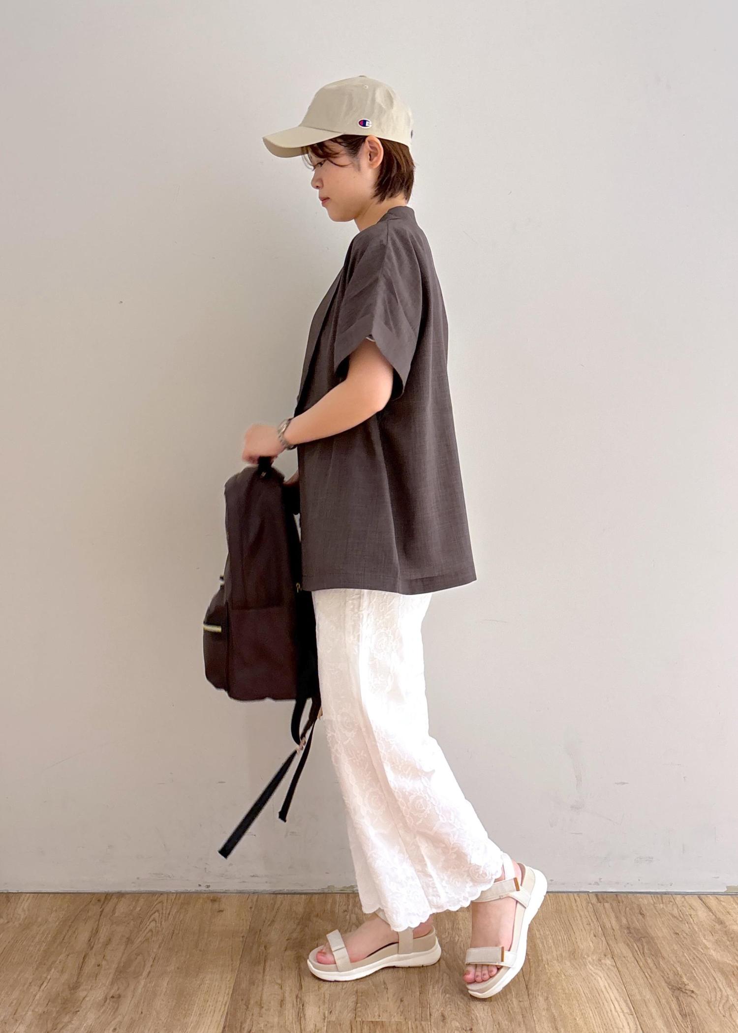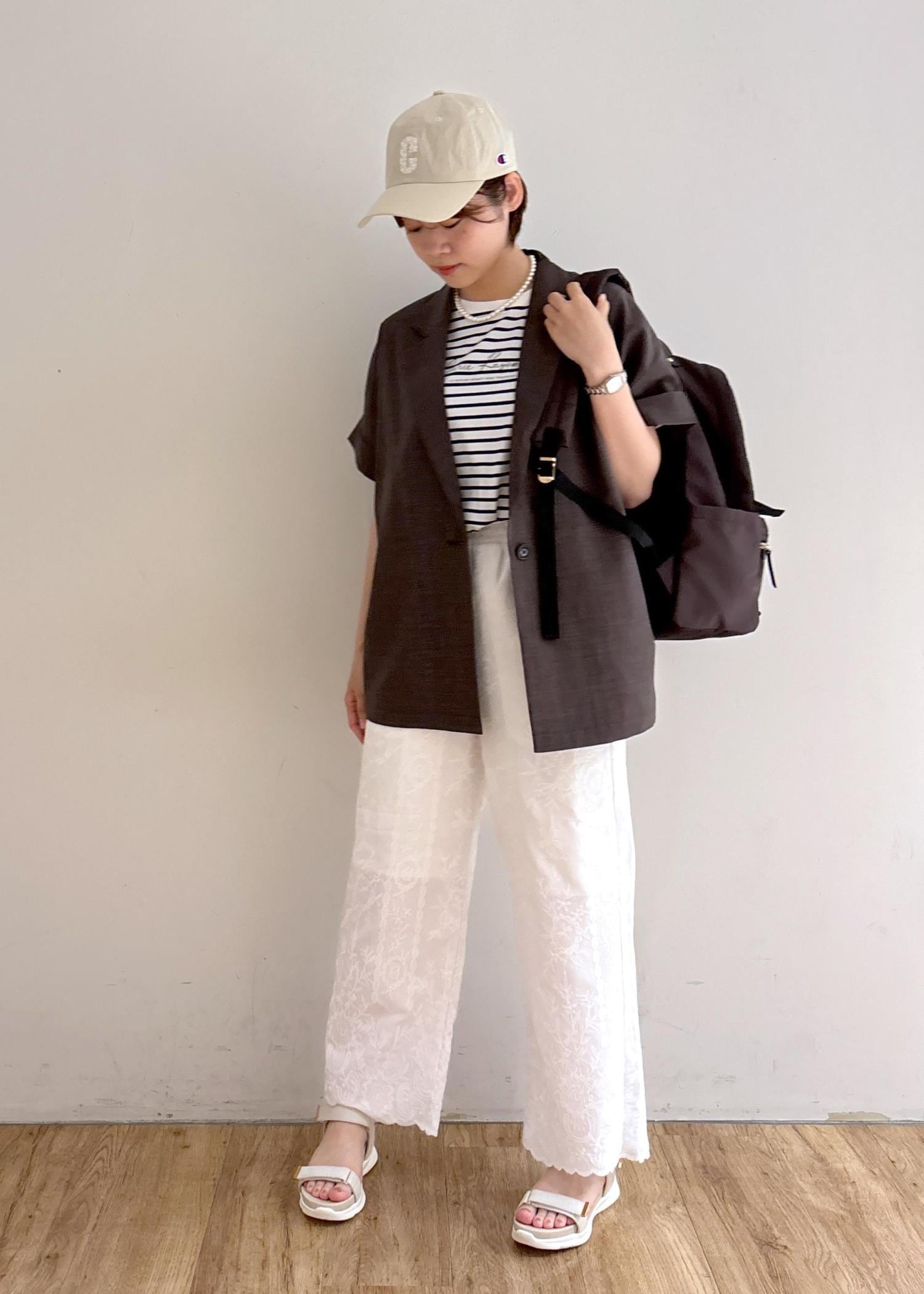 キャップとパンツの刺繍をアクセントに◎