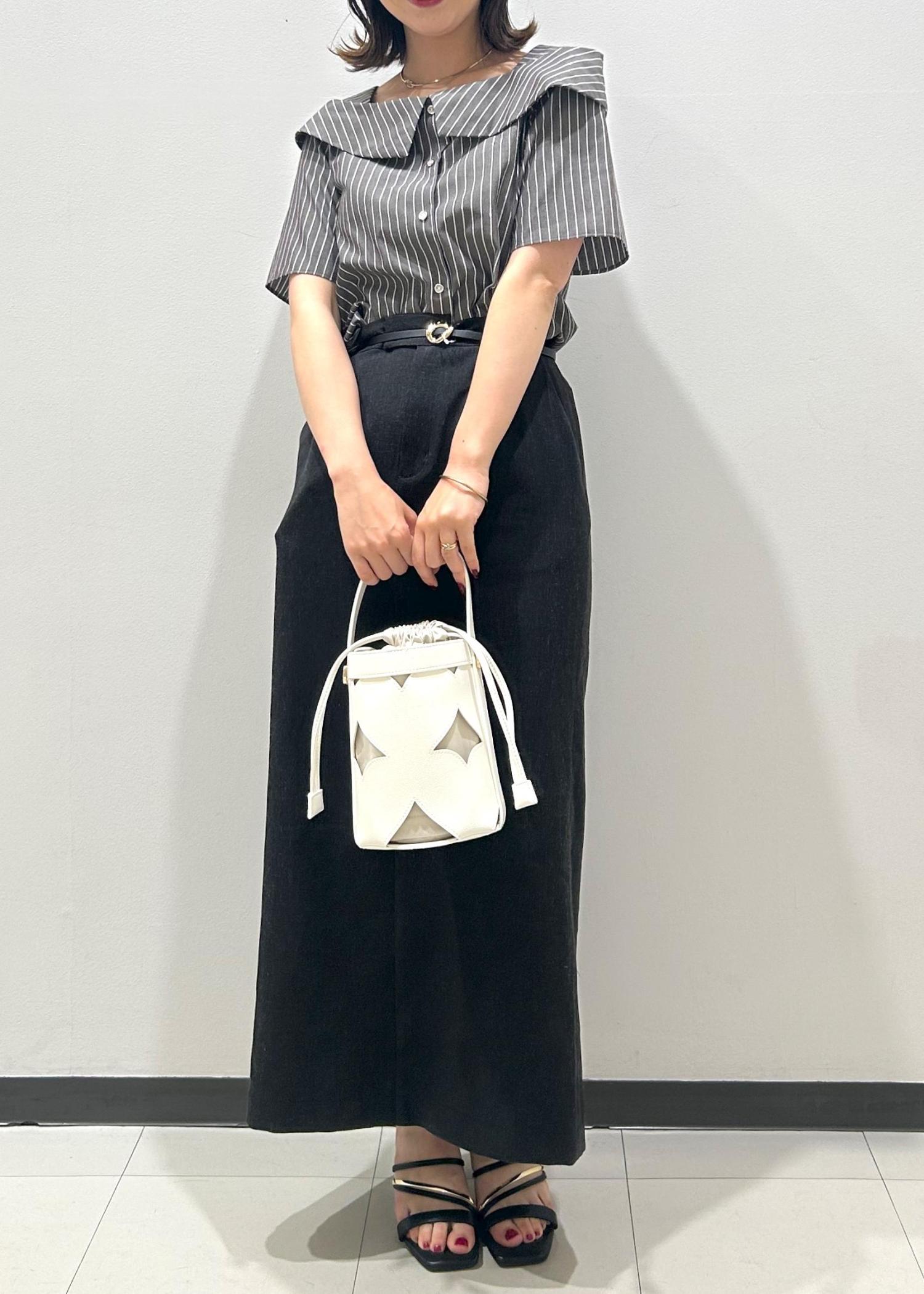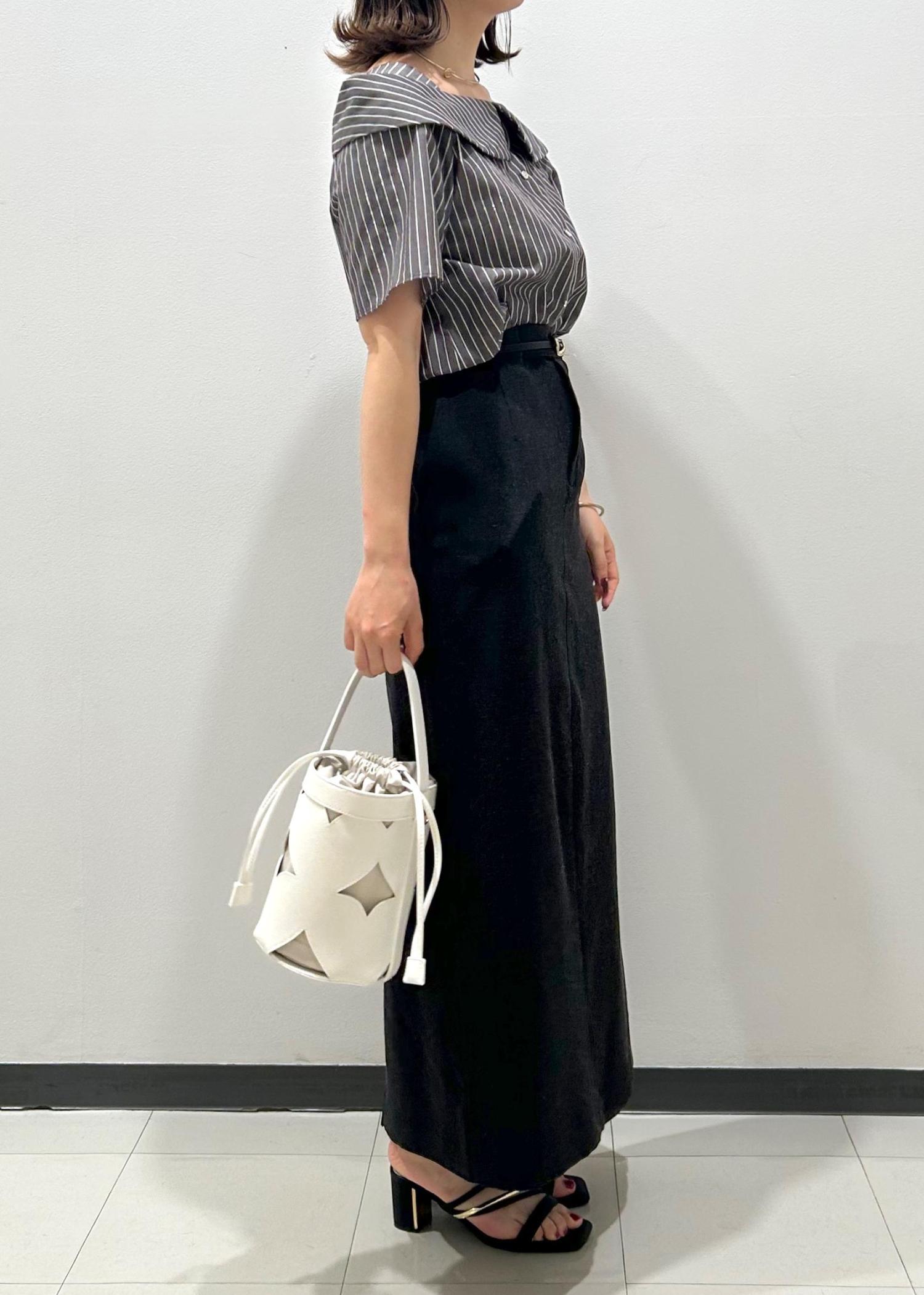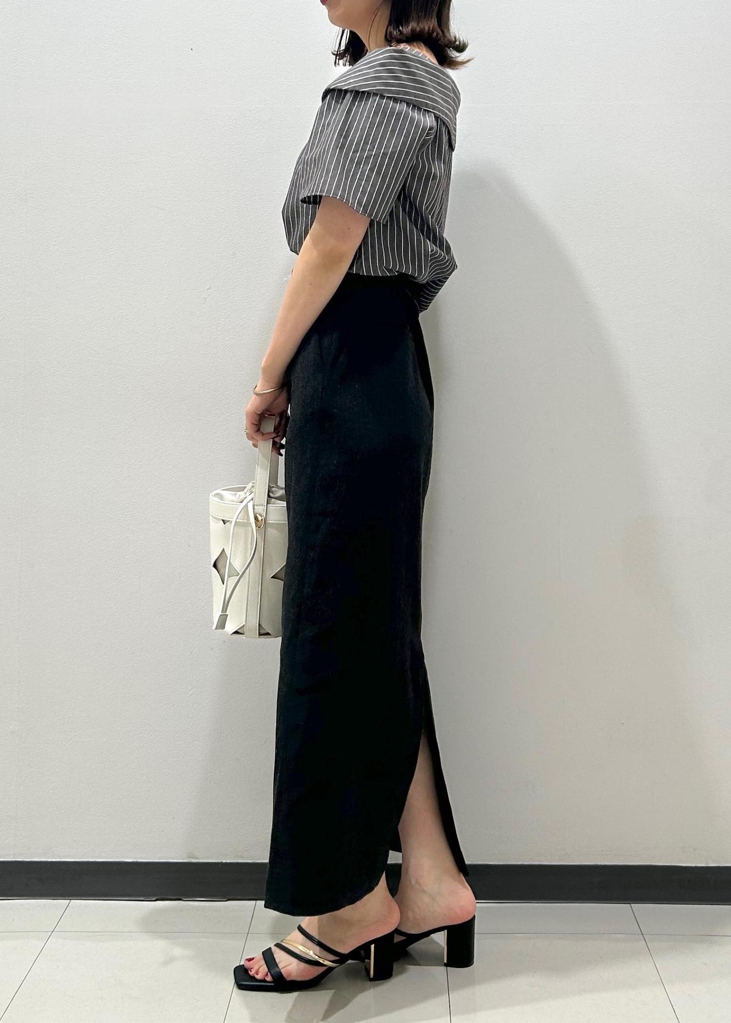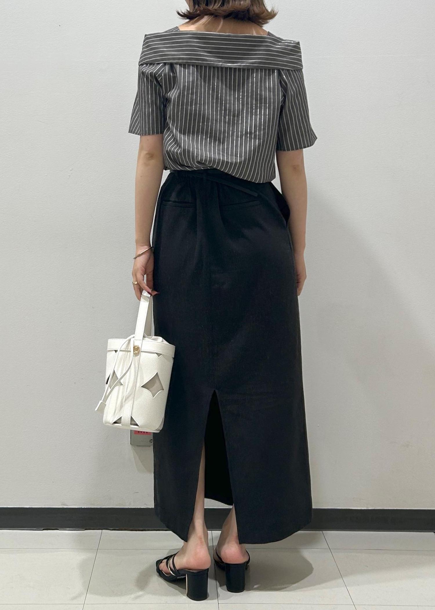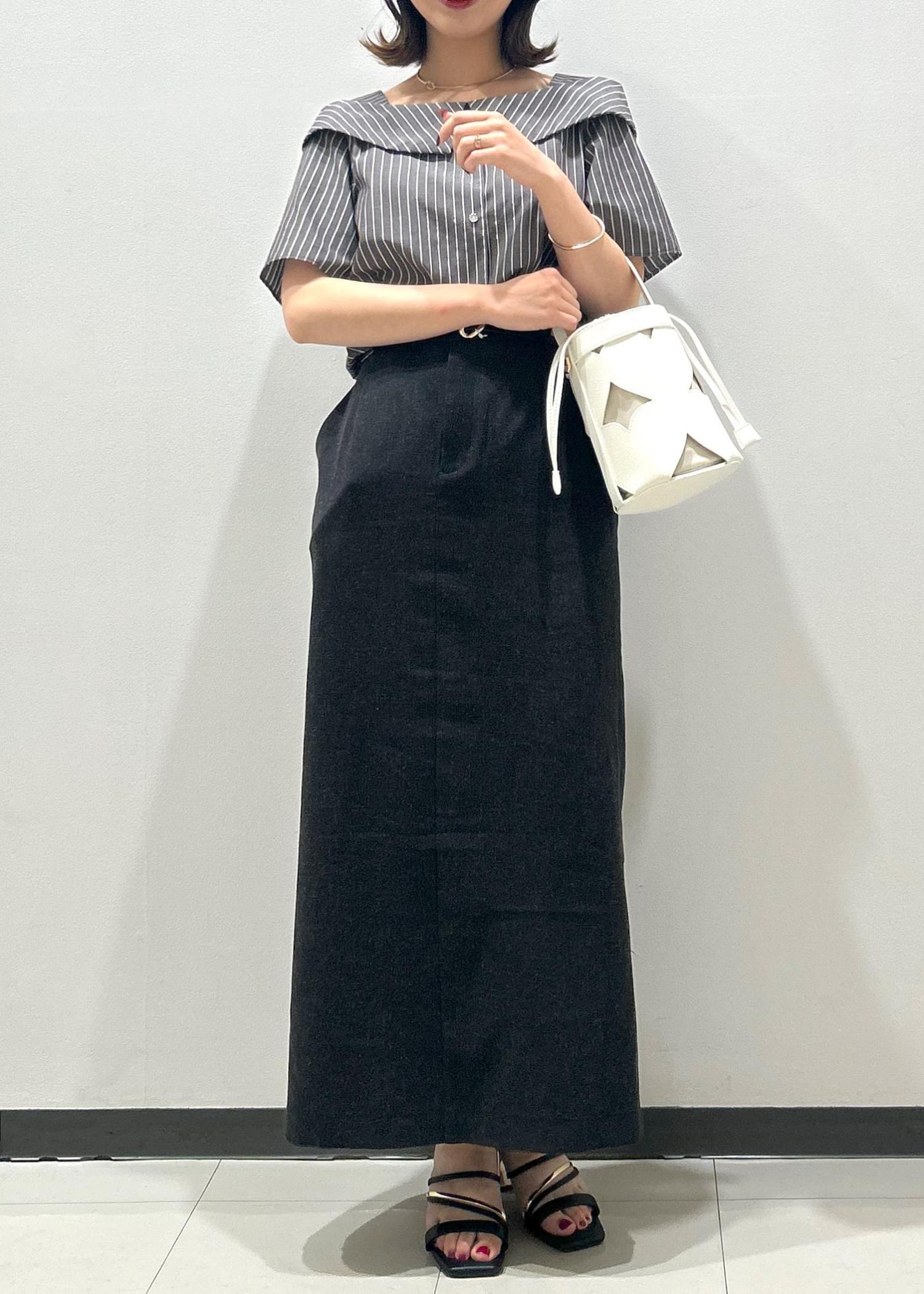 ウエストはベルトで引き締めて見せることもできるので骨格にとらわれず気軽にチャレンジできるスリムシルエットのスカートです! -