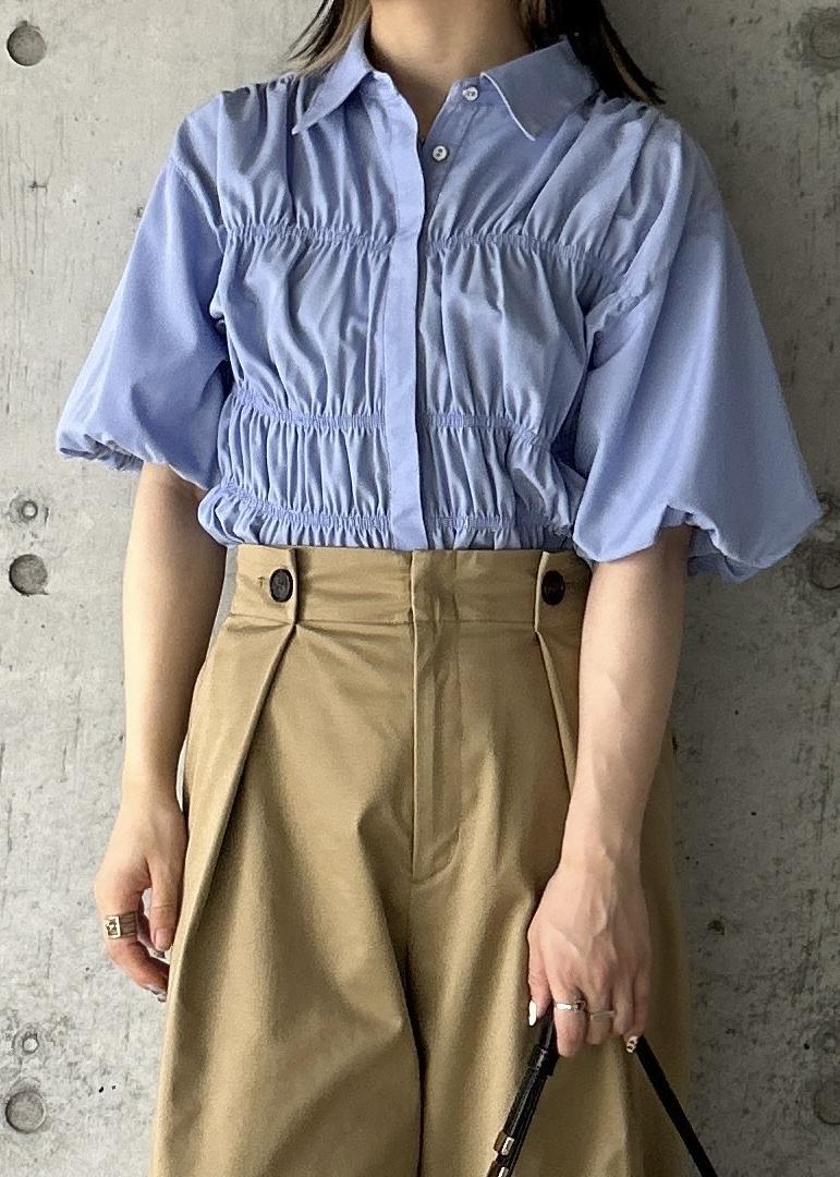 VIS【新色追加】【店頭人気】シャーリングバルーンシャツブルー /¥5,489レビューシャーリングと袖のボリューム感が一枚で着映えするデザイン◎