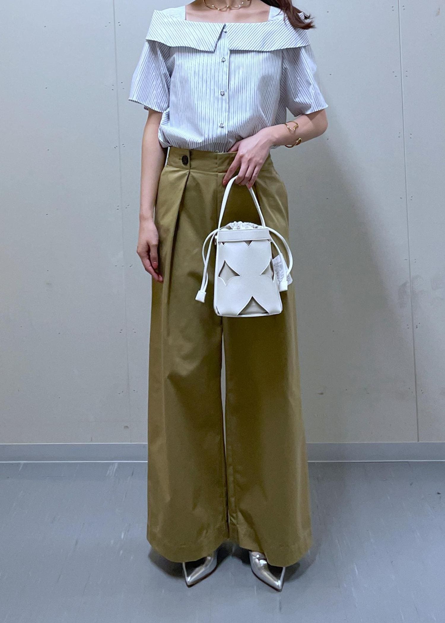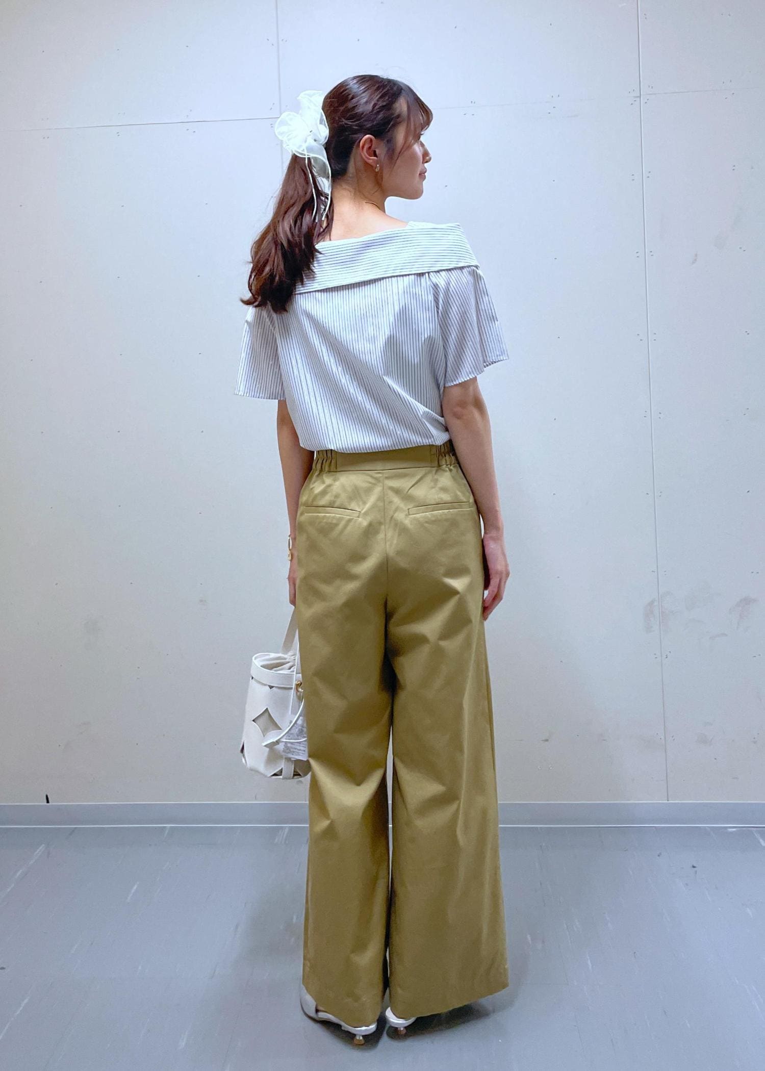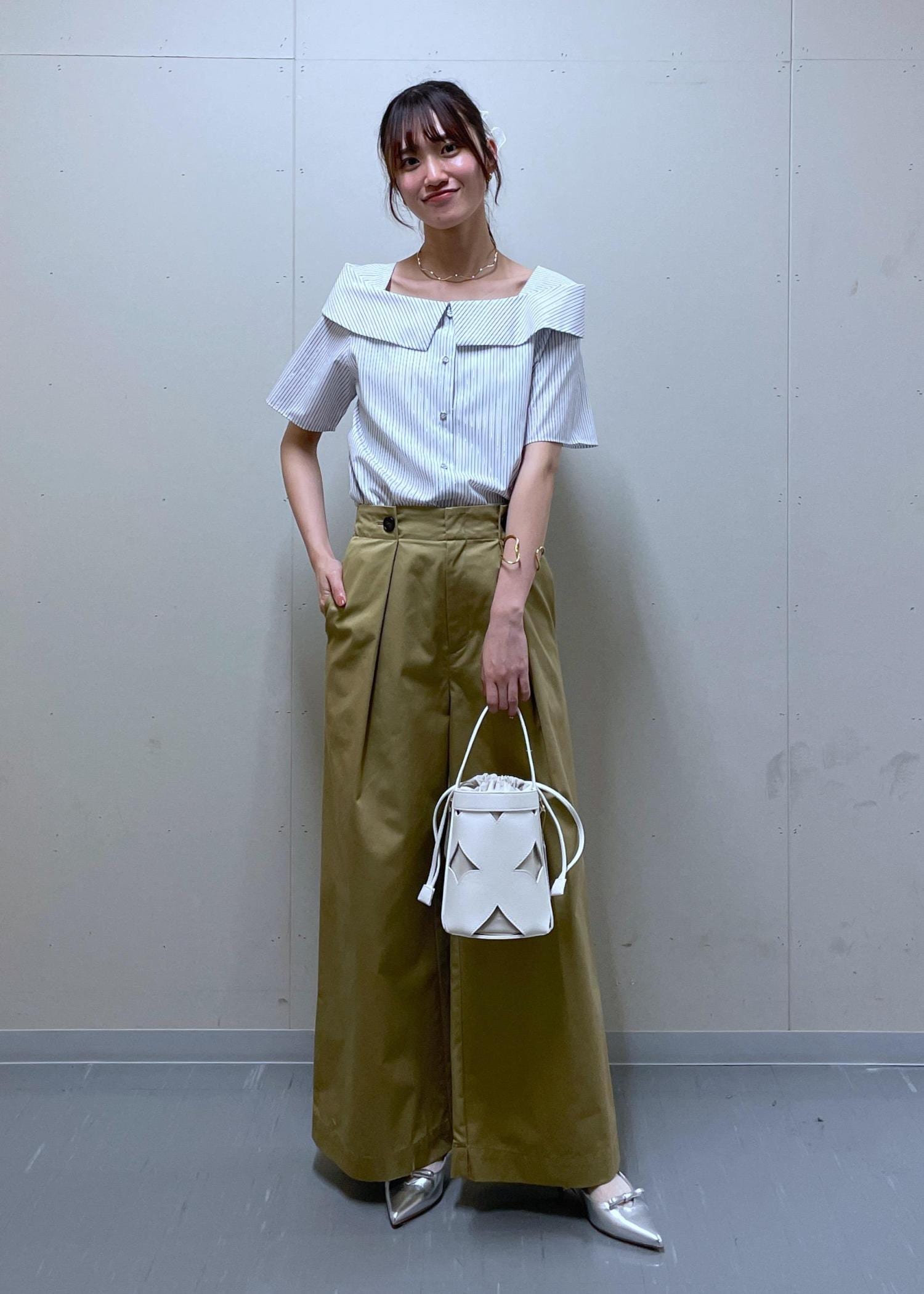 夏らしいストライプにバギーパンツを合わせてカジュアルスタイルにしてみました。カジュアルになりすぎないようスニーカーではなくミュールにしてみました。