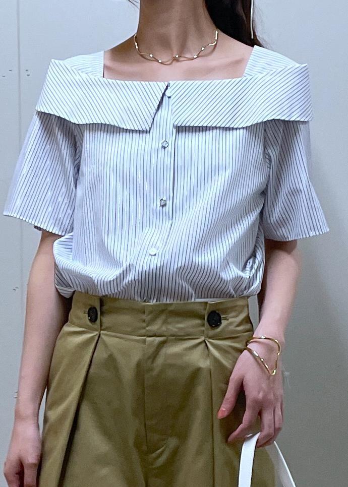 【新色追加】【防シワ】ラメミックスオフショルダー風ストライプシャツ
