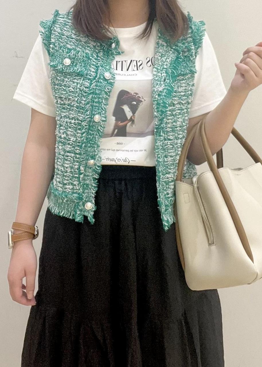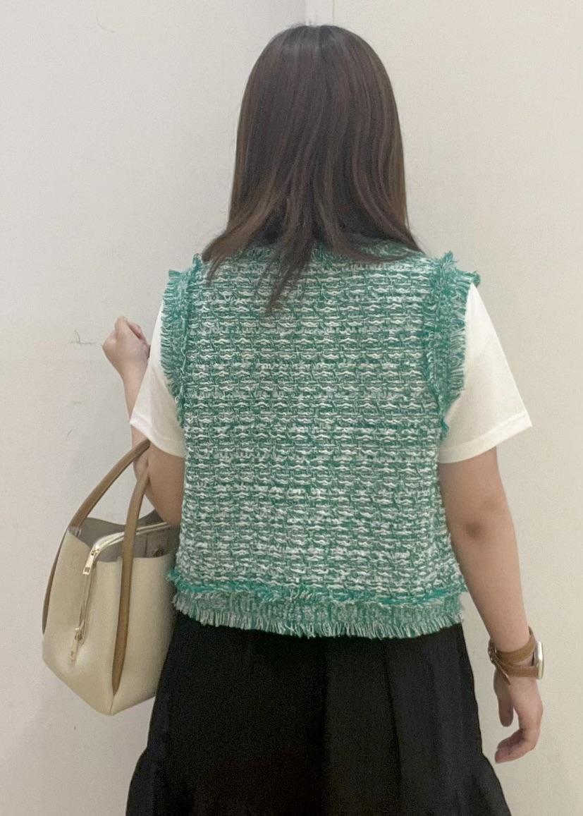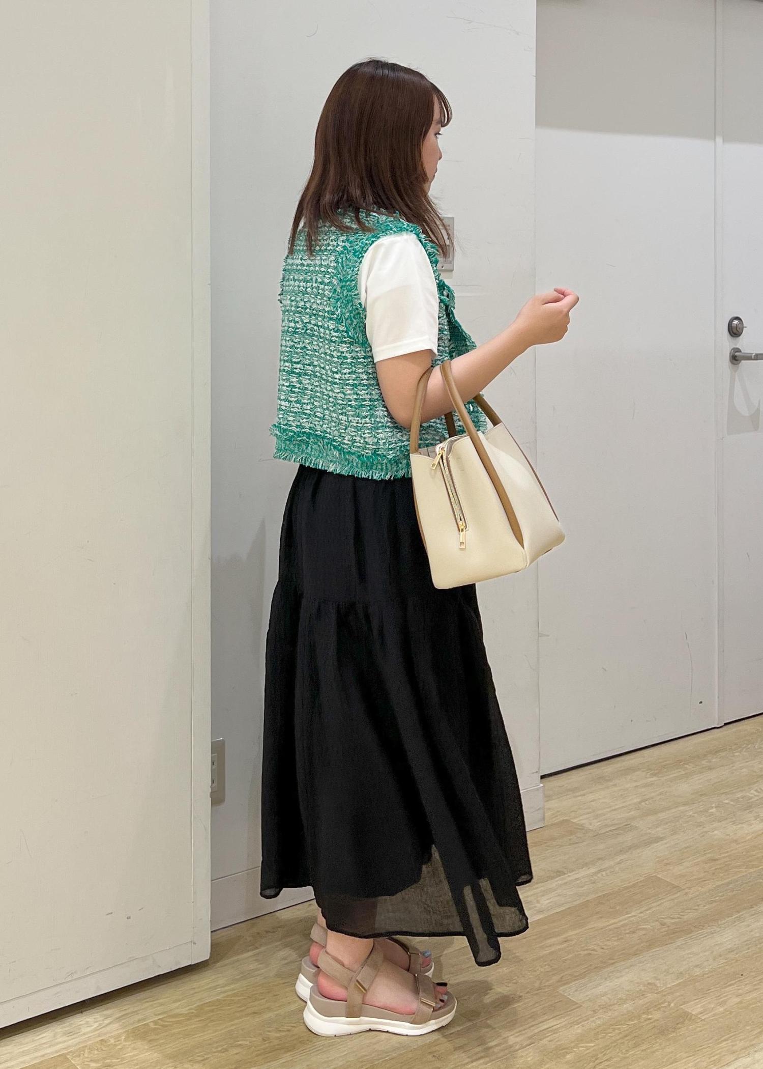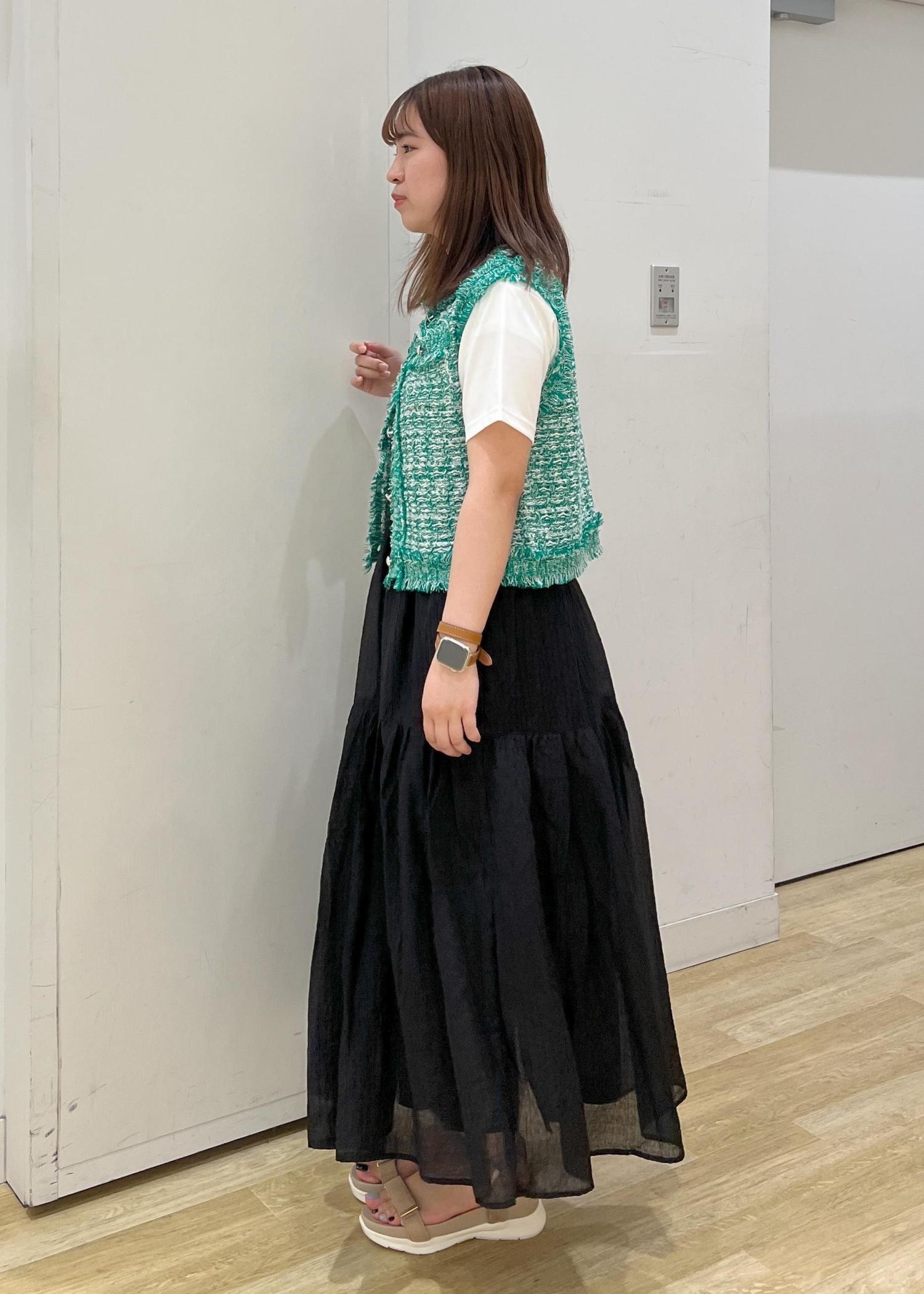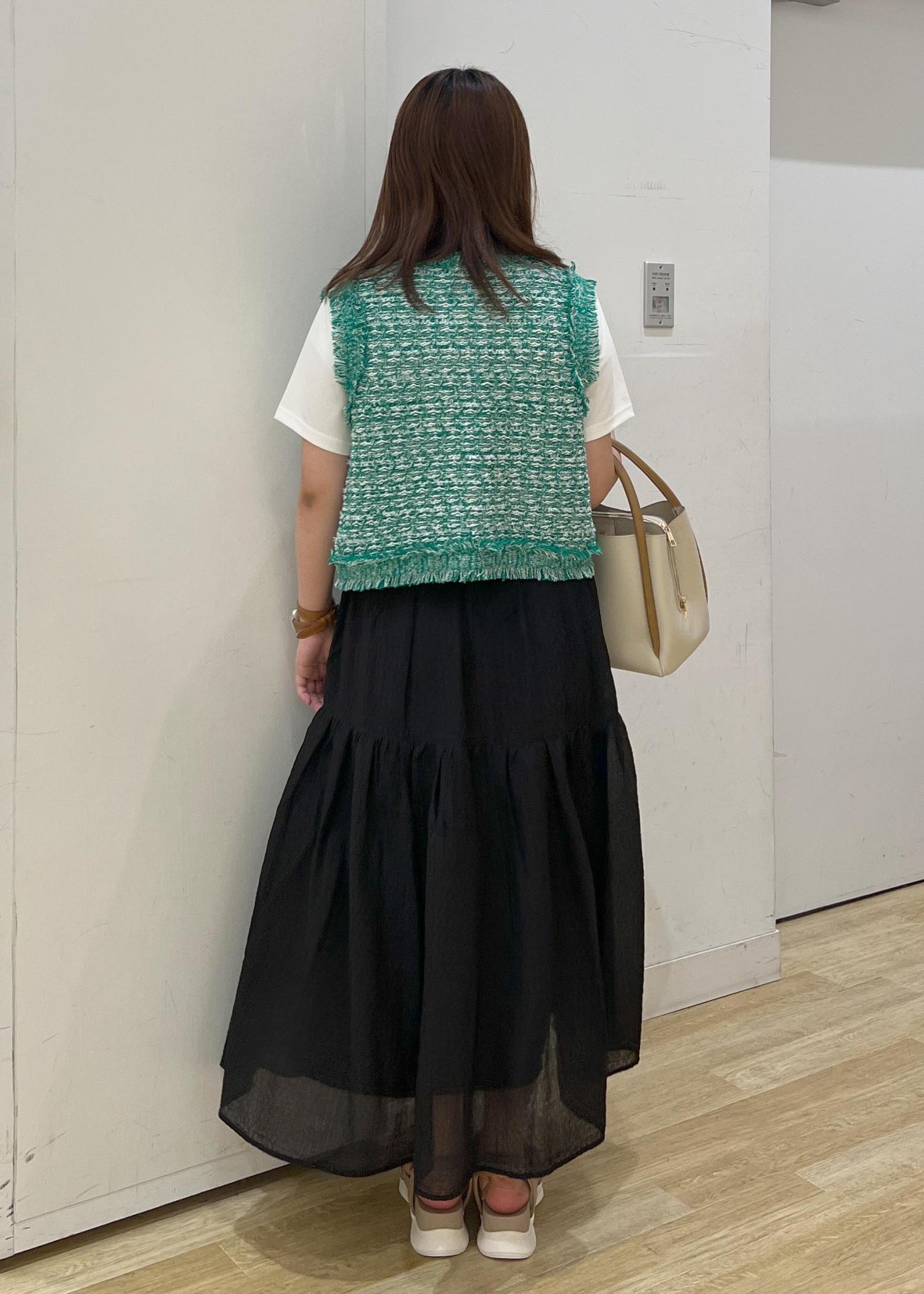 ツイードジレとスカートの合わせがきれいめなので、Tシャツを合わせることによって普段でも着やすいカジュアルめなコーディネートにしました!