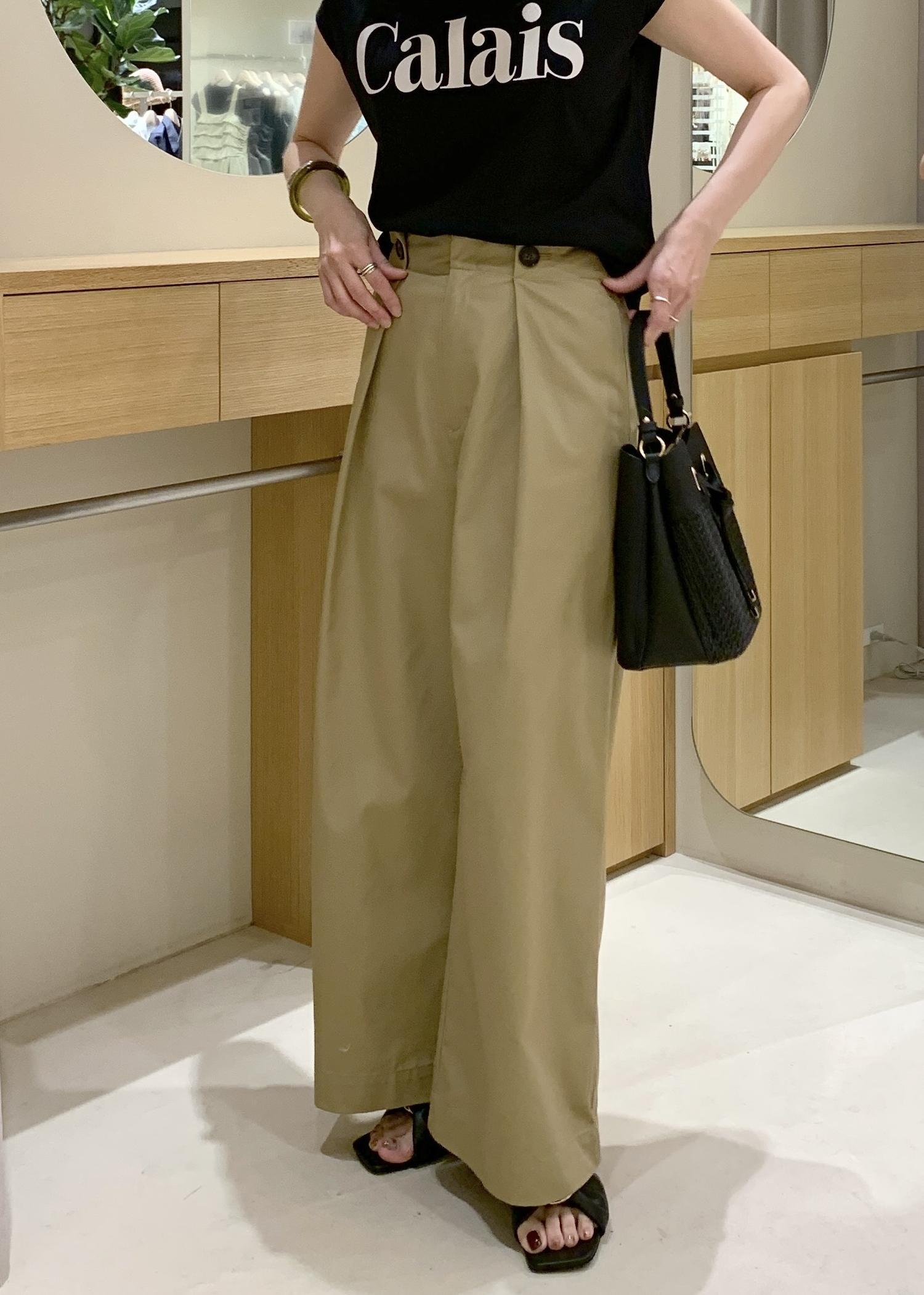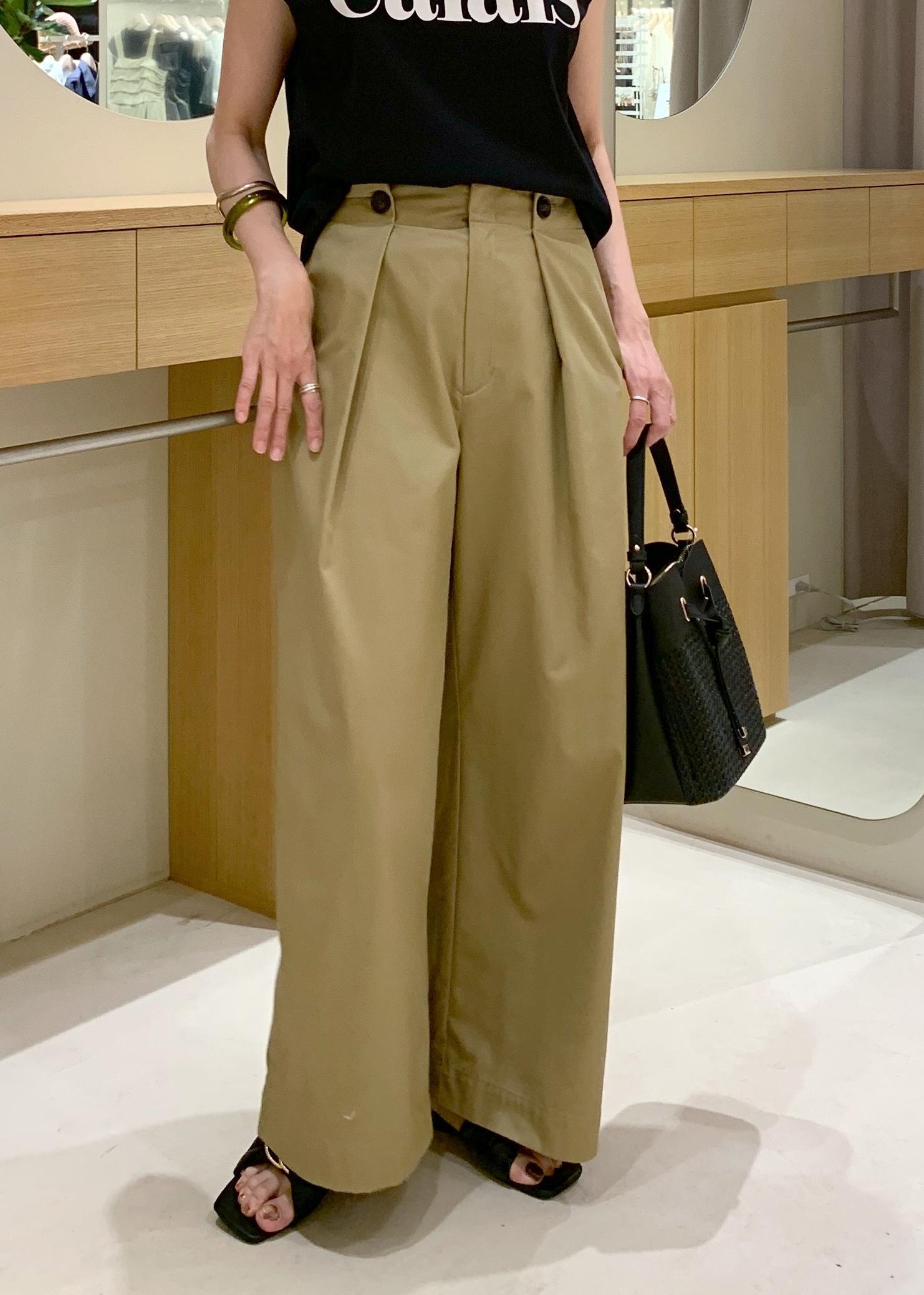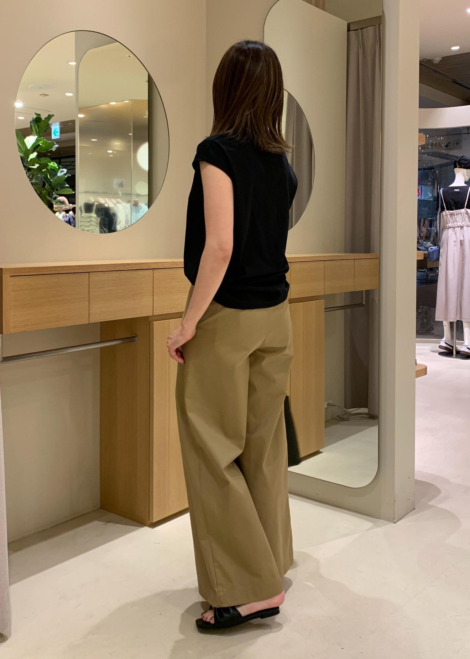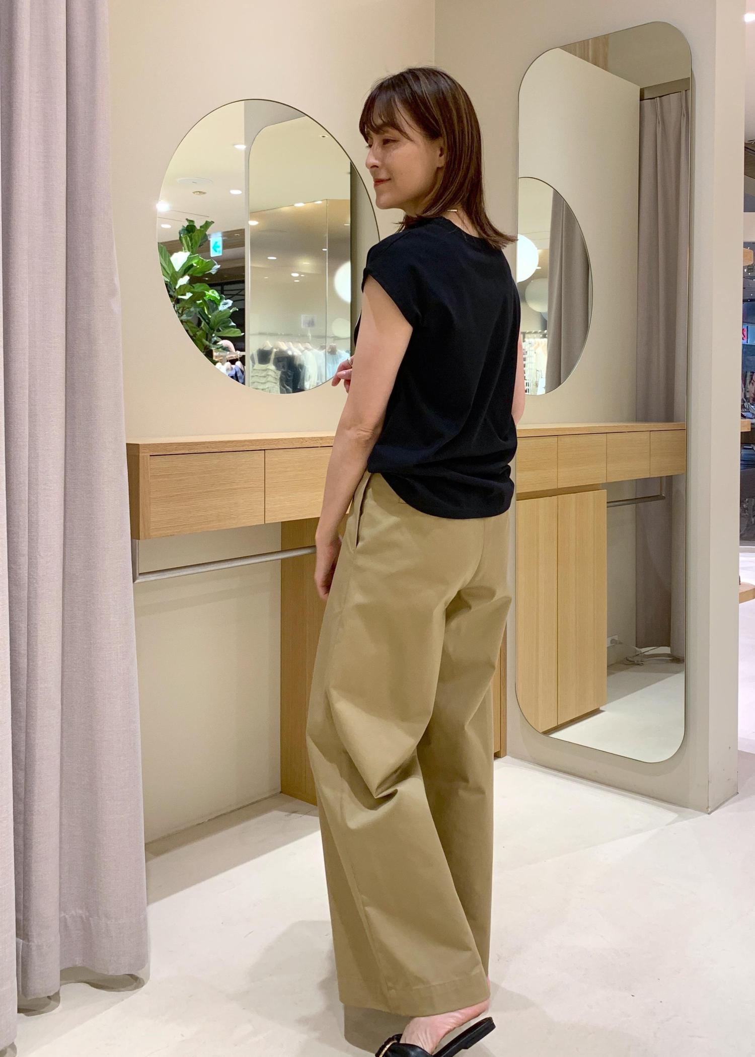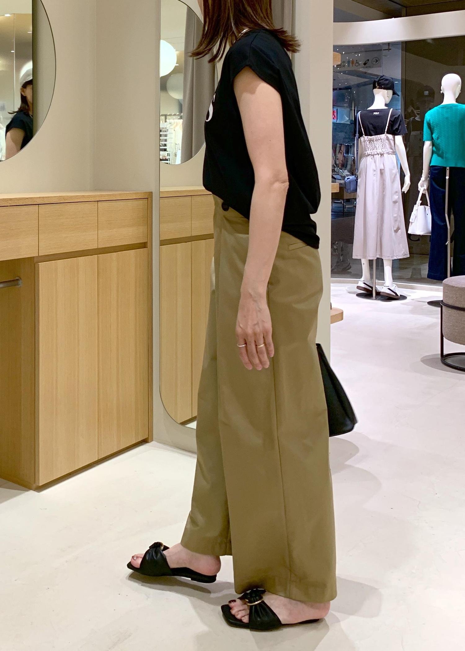 ウエスト位置はハイウエストすぎず、窮屈感はありません。身長165cmでMサイズを着用。フラットなシューズをはいても床につかないくらいになりました。 -