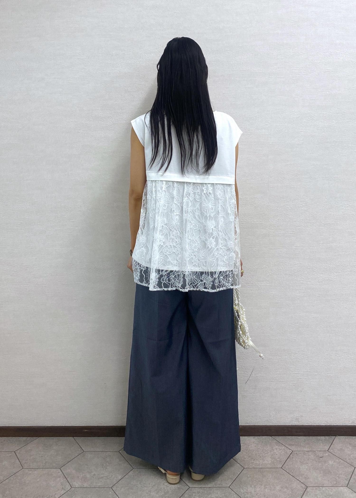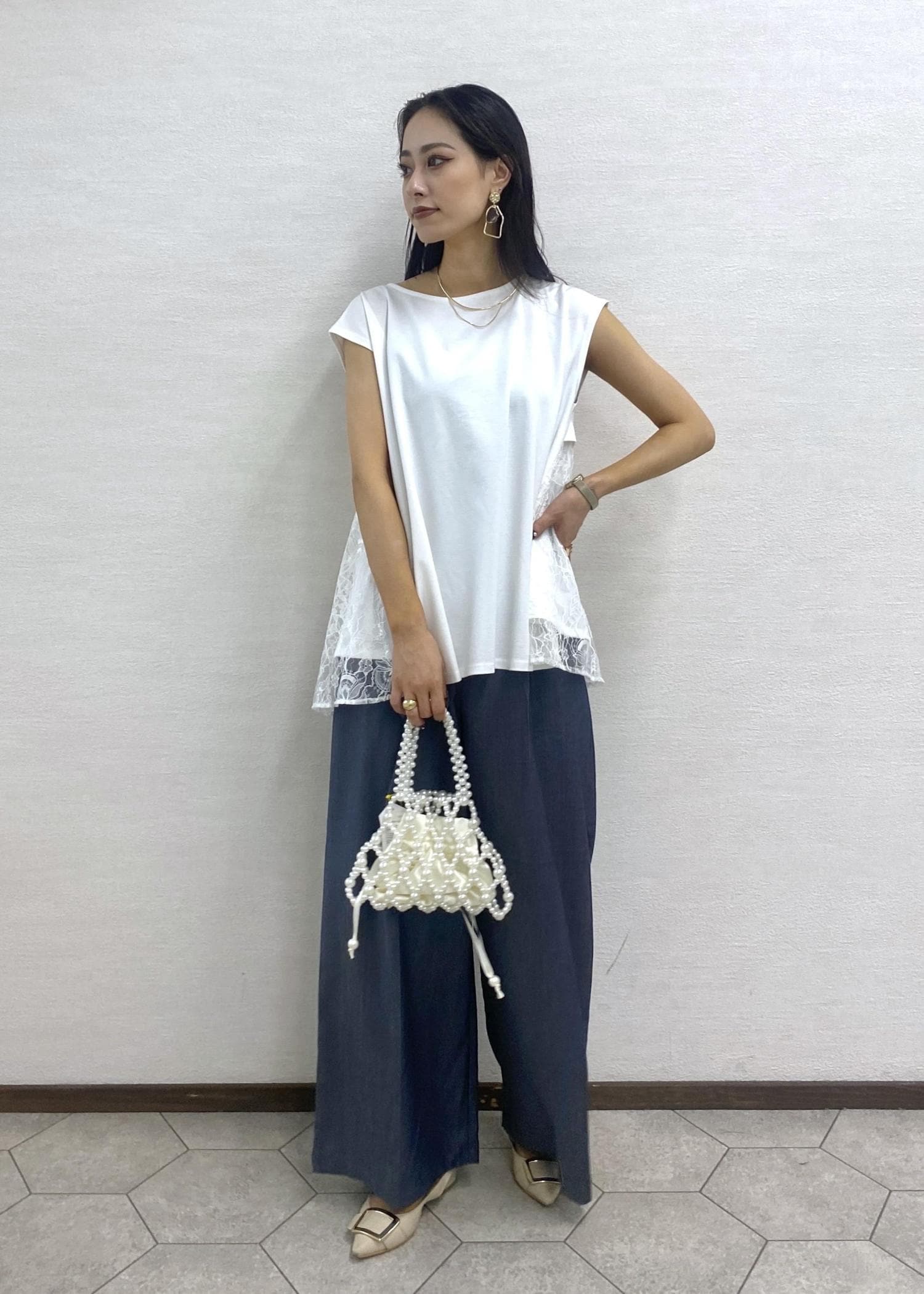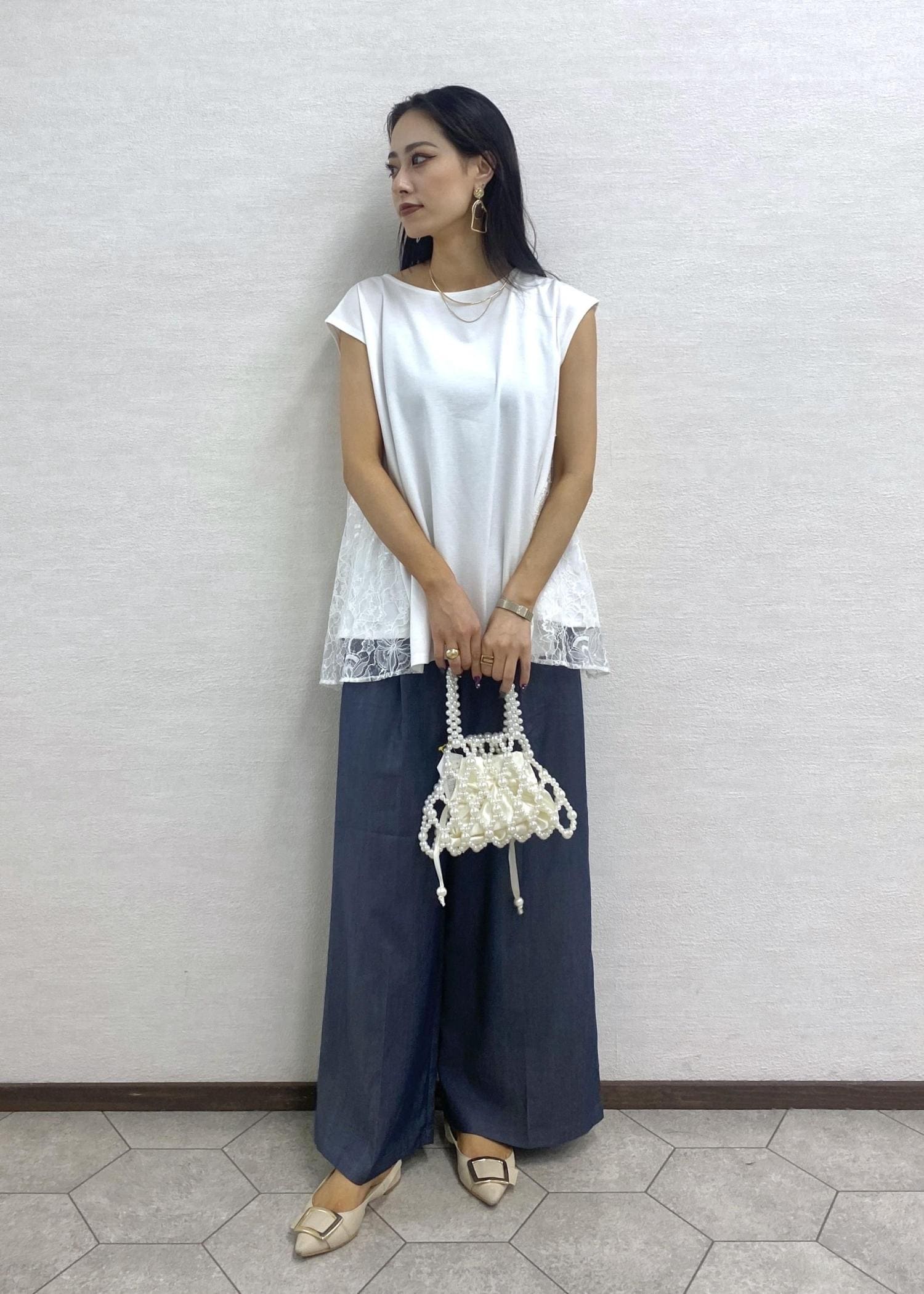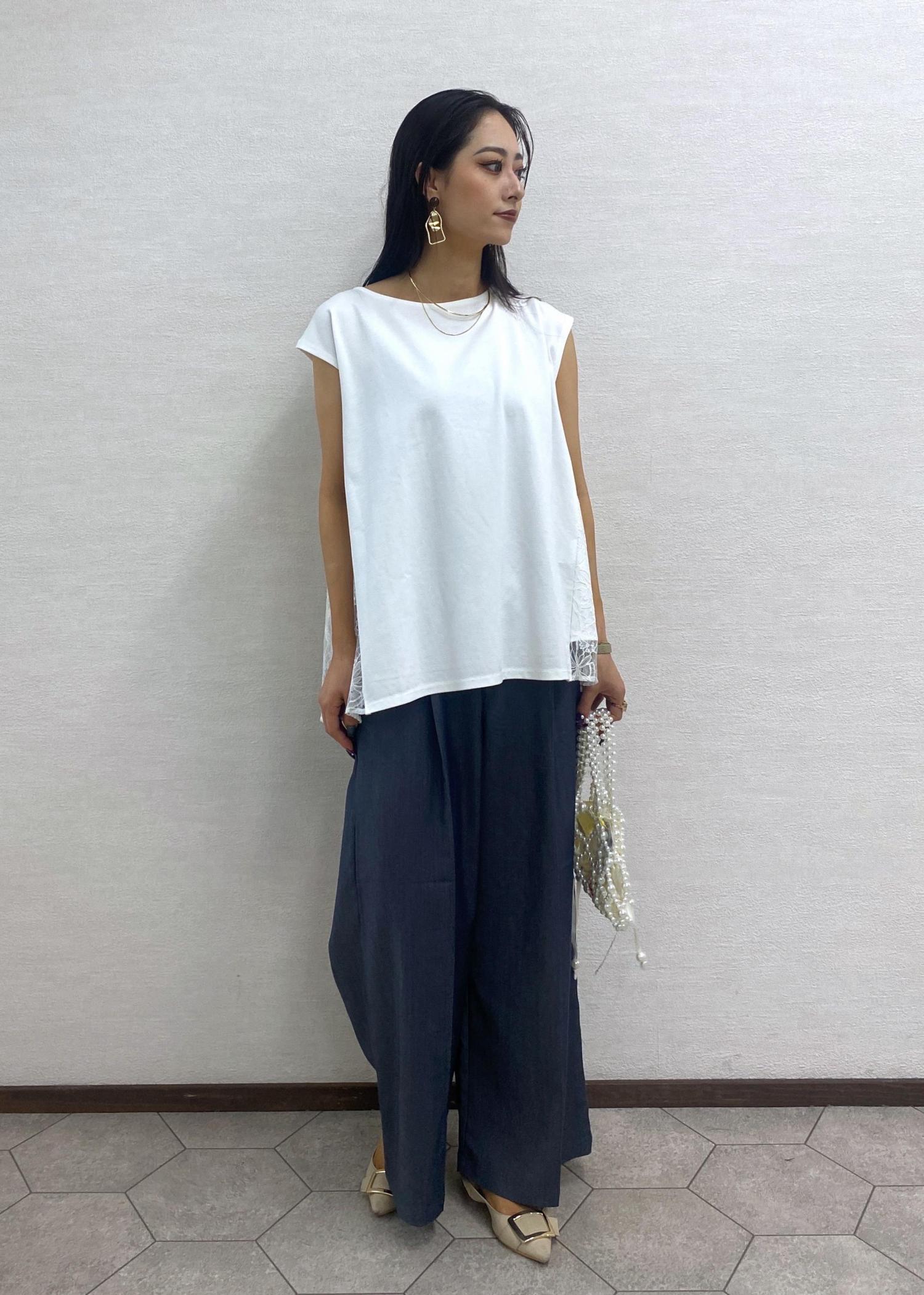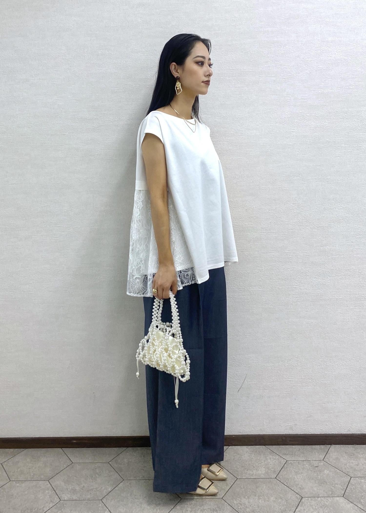 後ろのレースが華やか見えするトップスにやや広めのワイドパンツを合わせた大人カジュアルなコーディネートです。