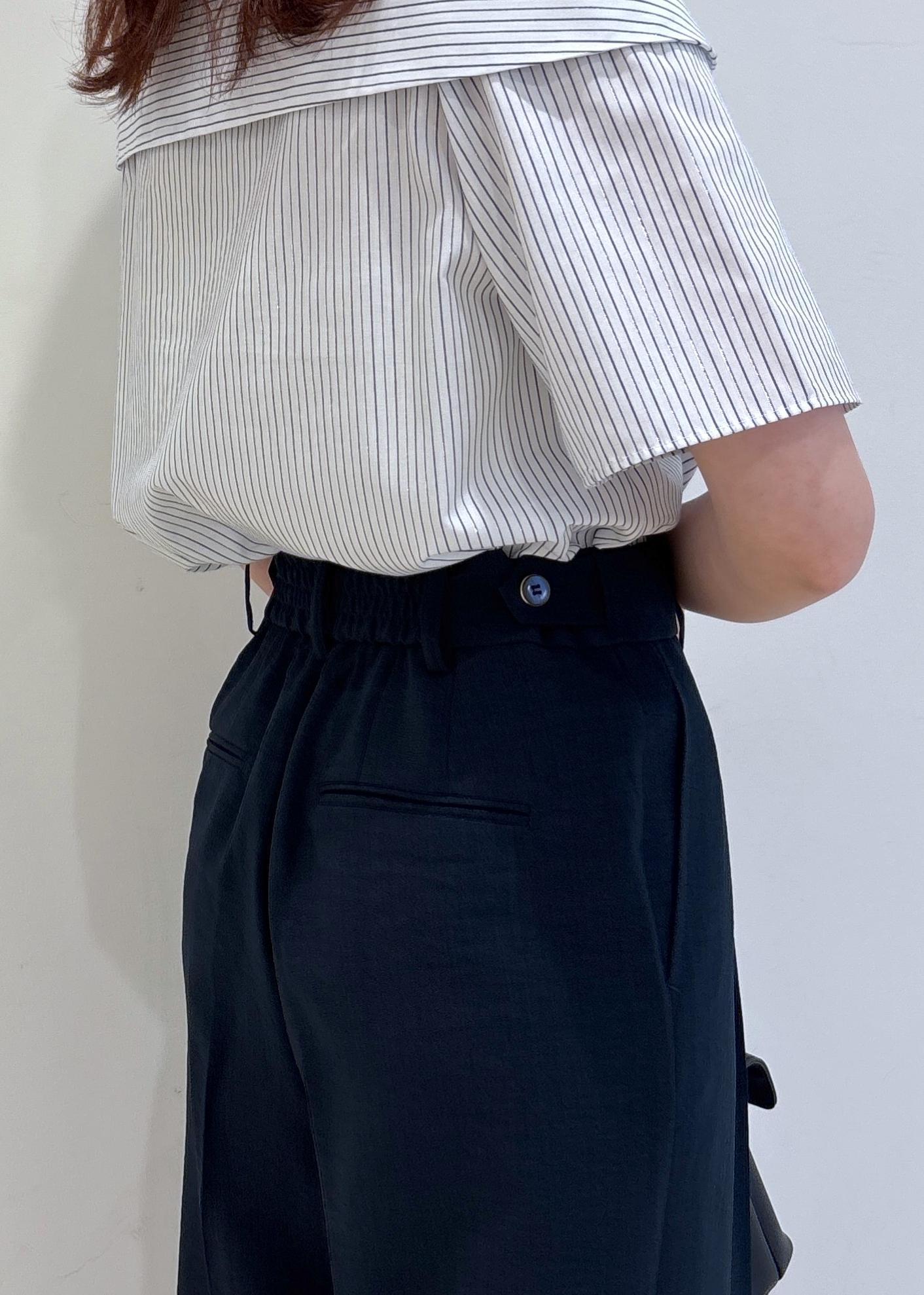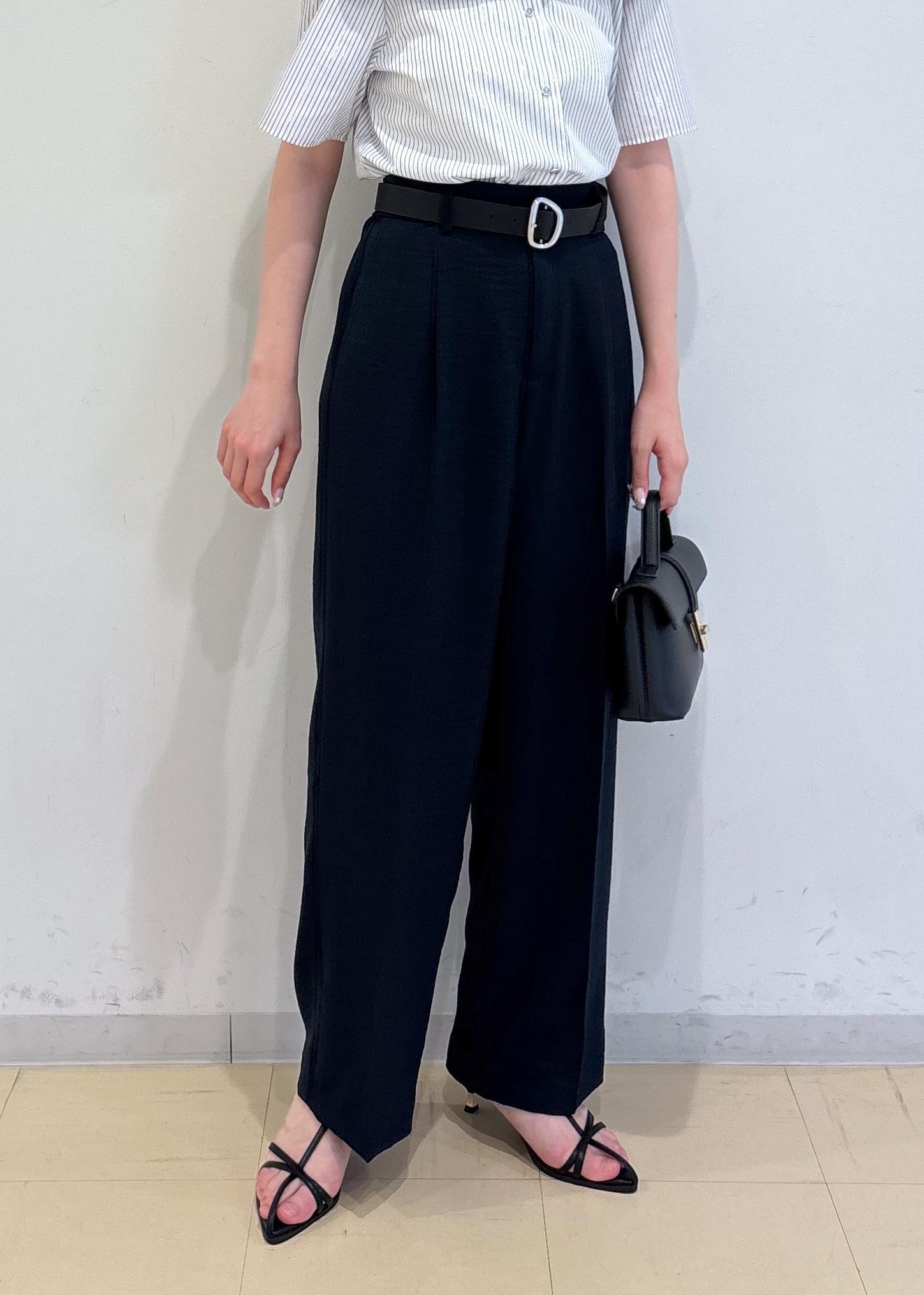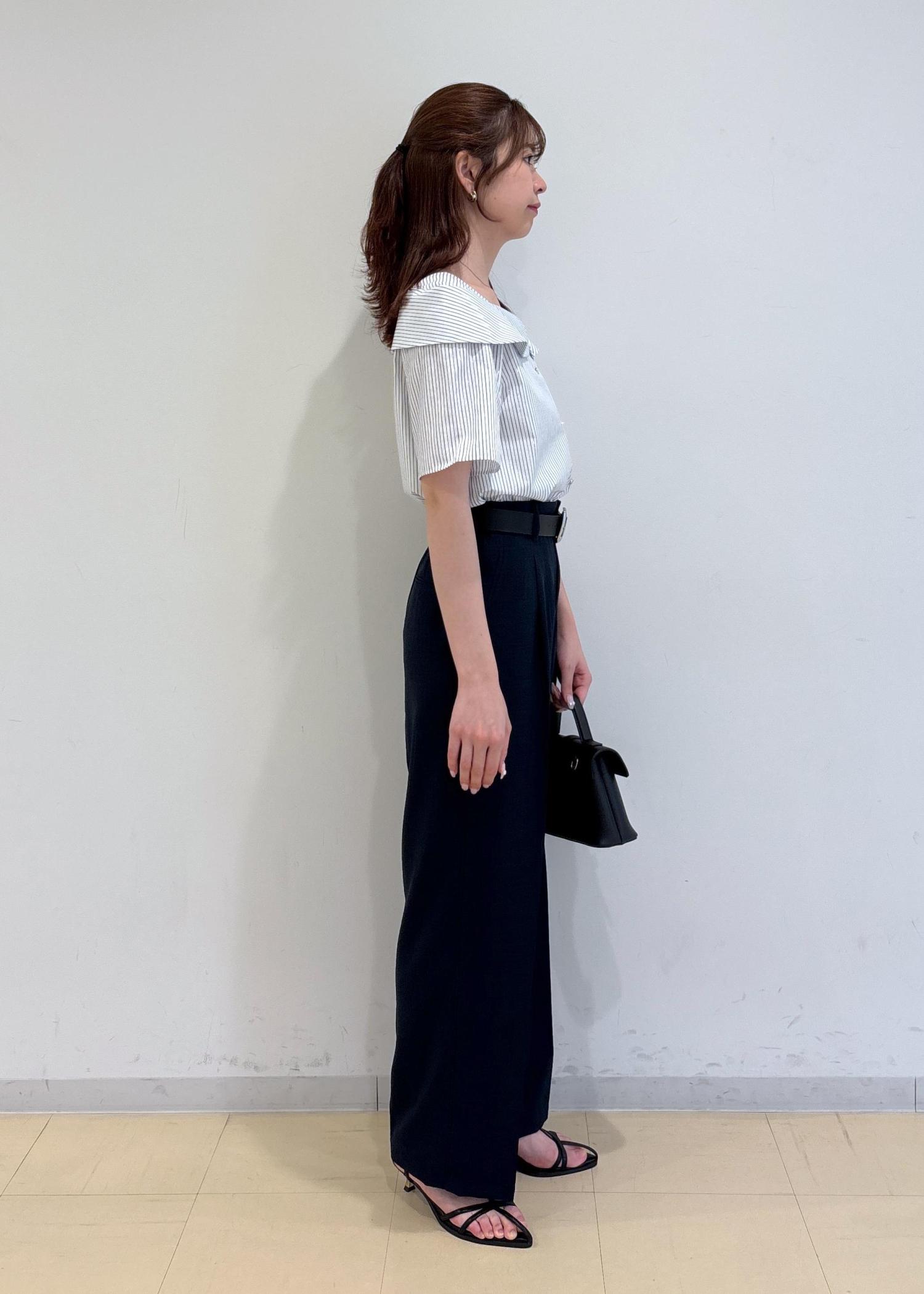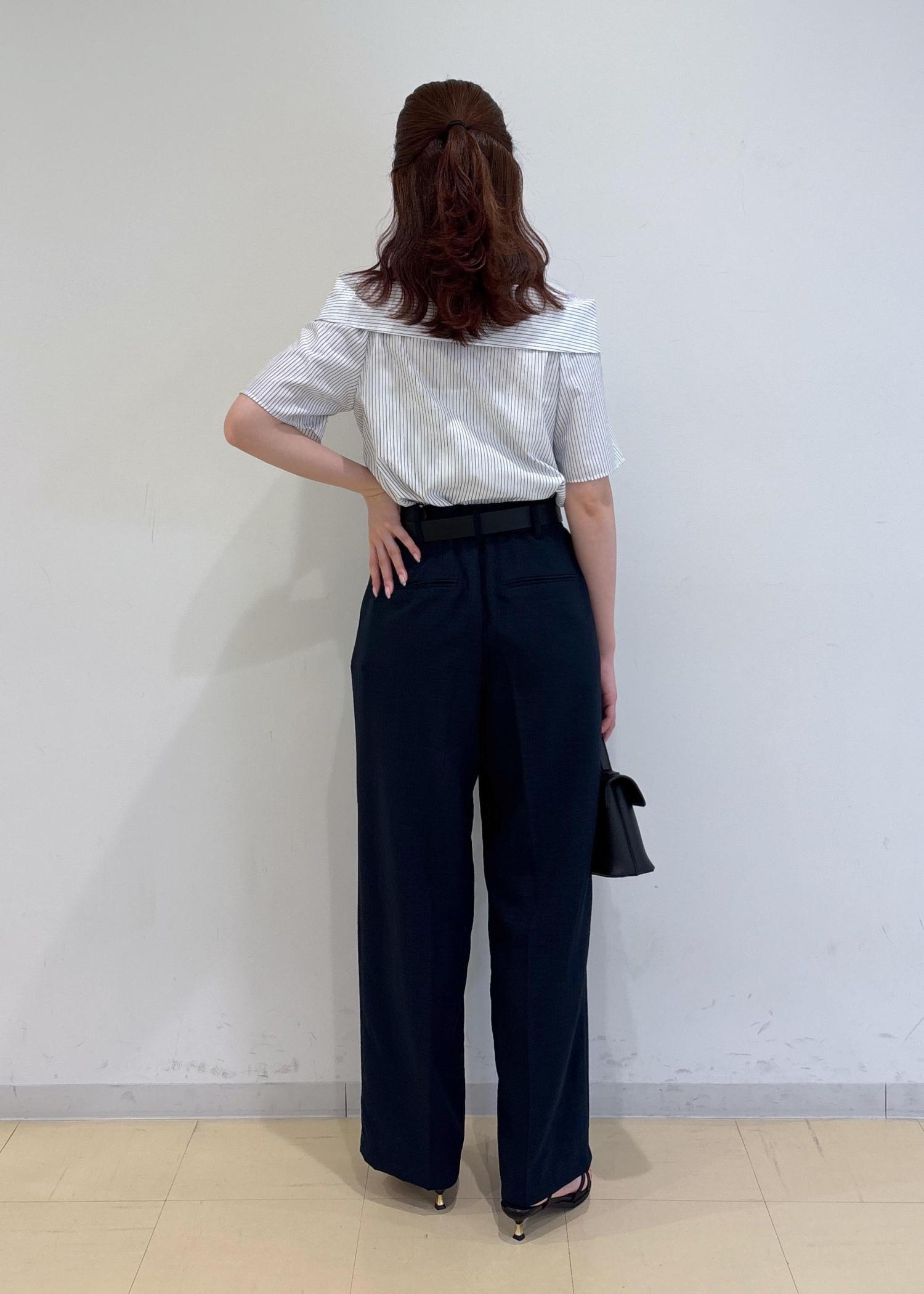 ネイビーのパンツできちんと感がありつつ、着心地がよくてお手入れ楽なのが嬉しいポイント♪