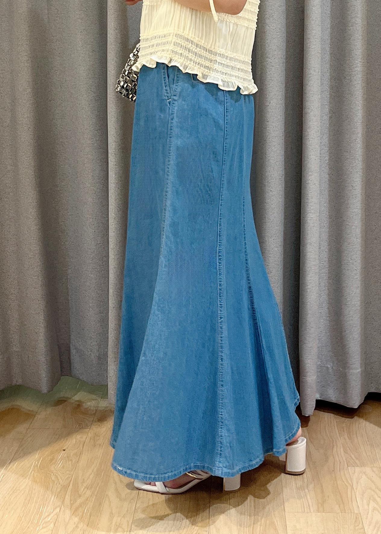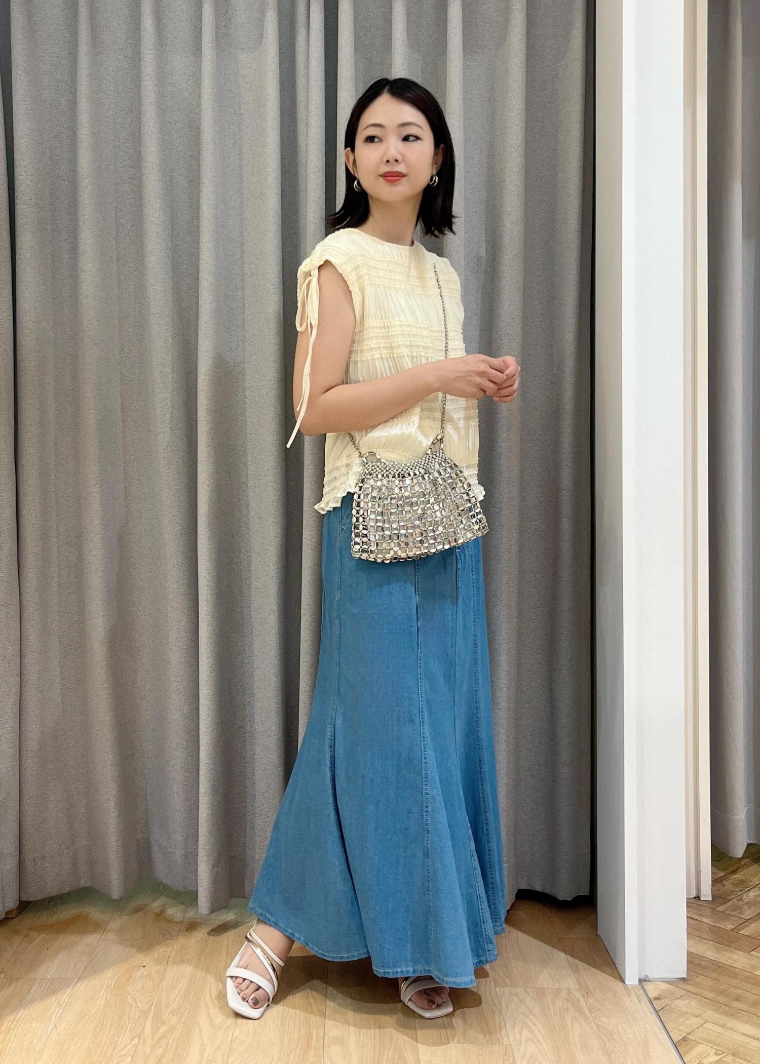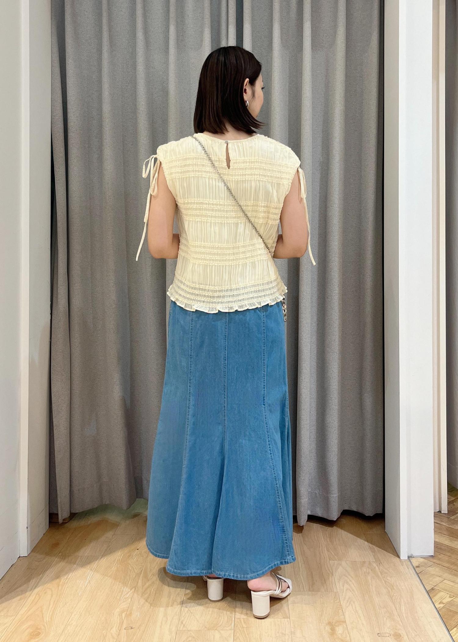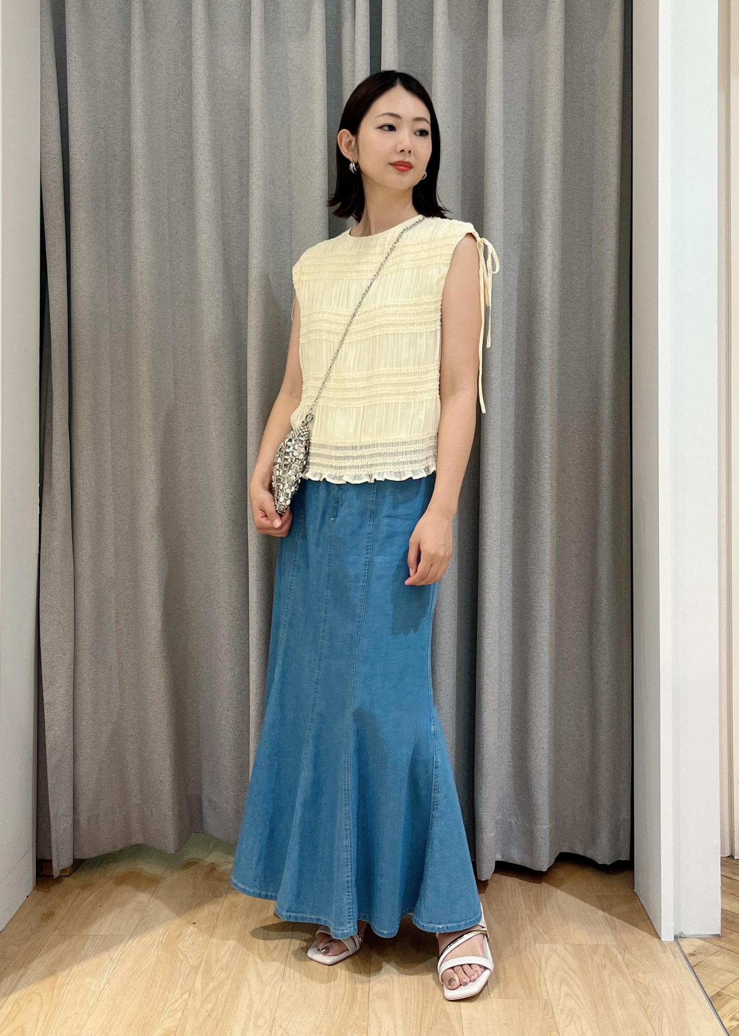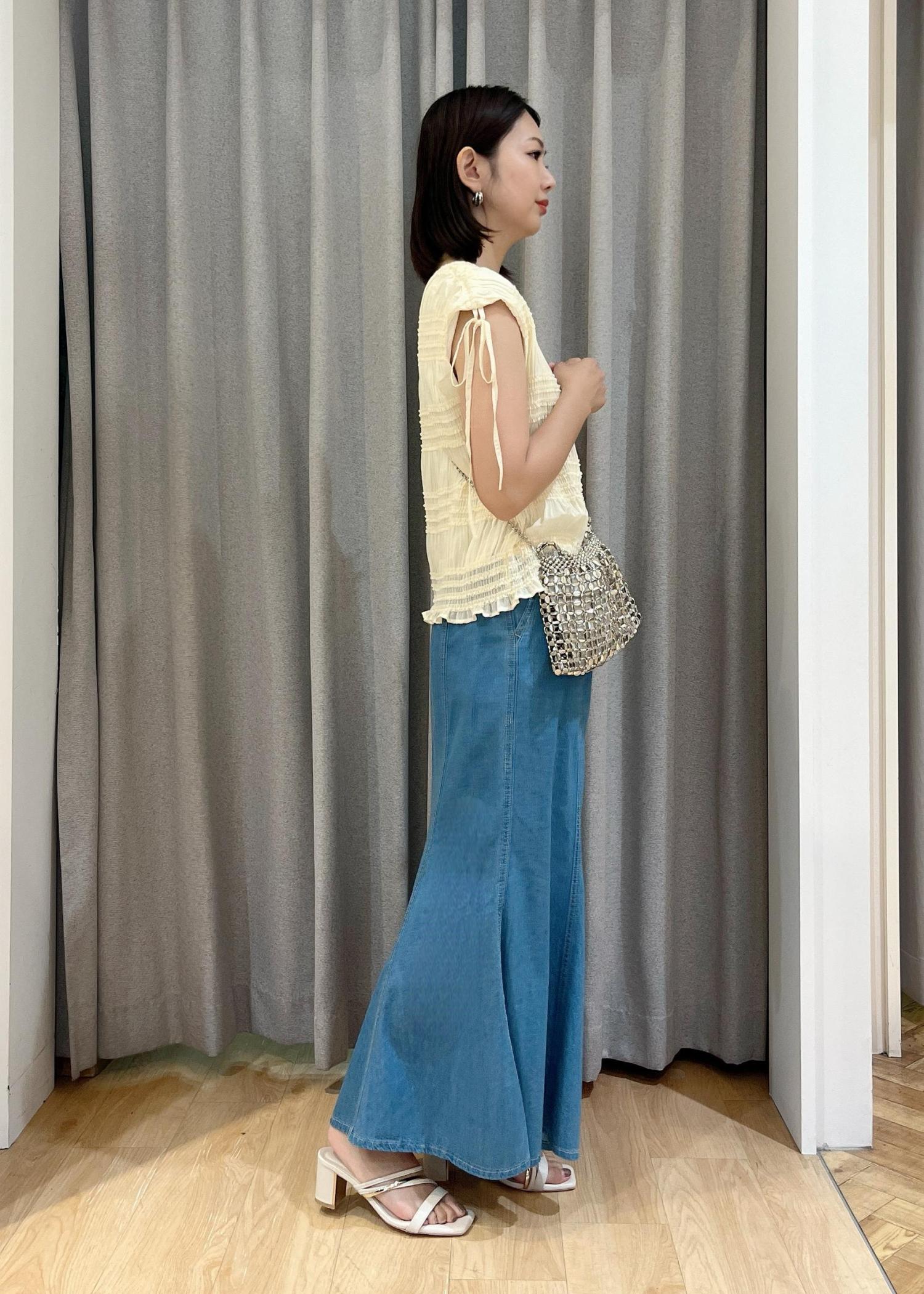 シャーリングとプリーツのデザインが目を引くトップスとシルエットがキレイなデニムのマーメイドスカートを合わせたコーディネートです♪