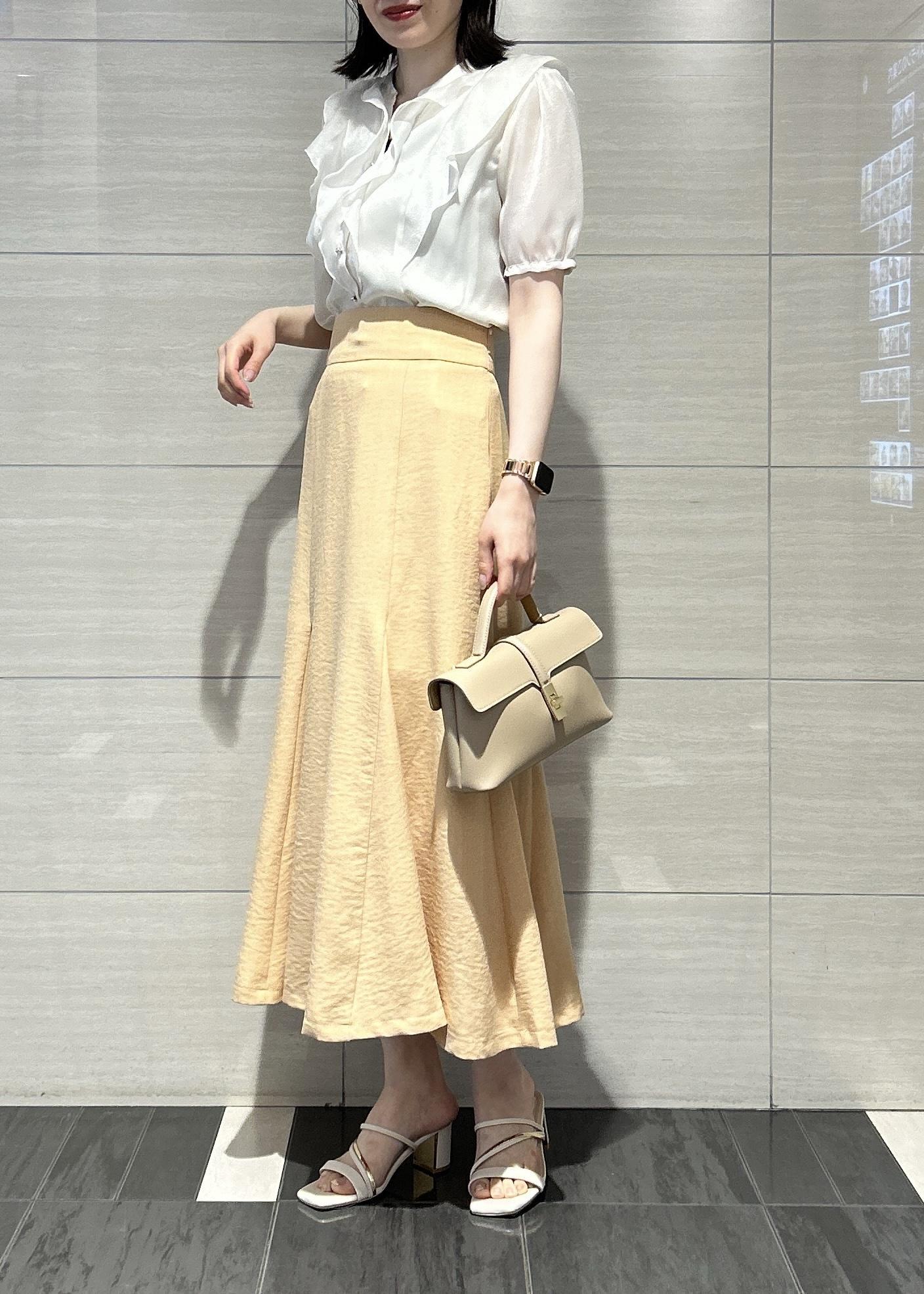 シャイニーで華やかなブラウスにオレンジ色のマーメイドスカートを合わせました♪