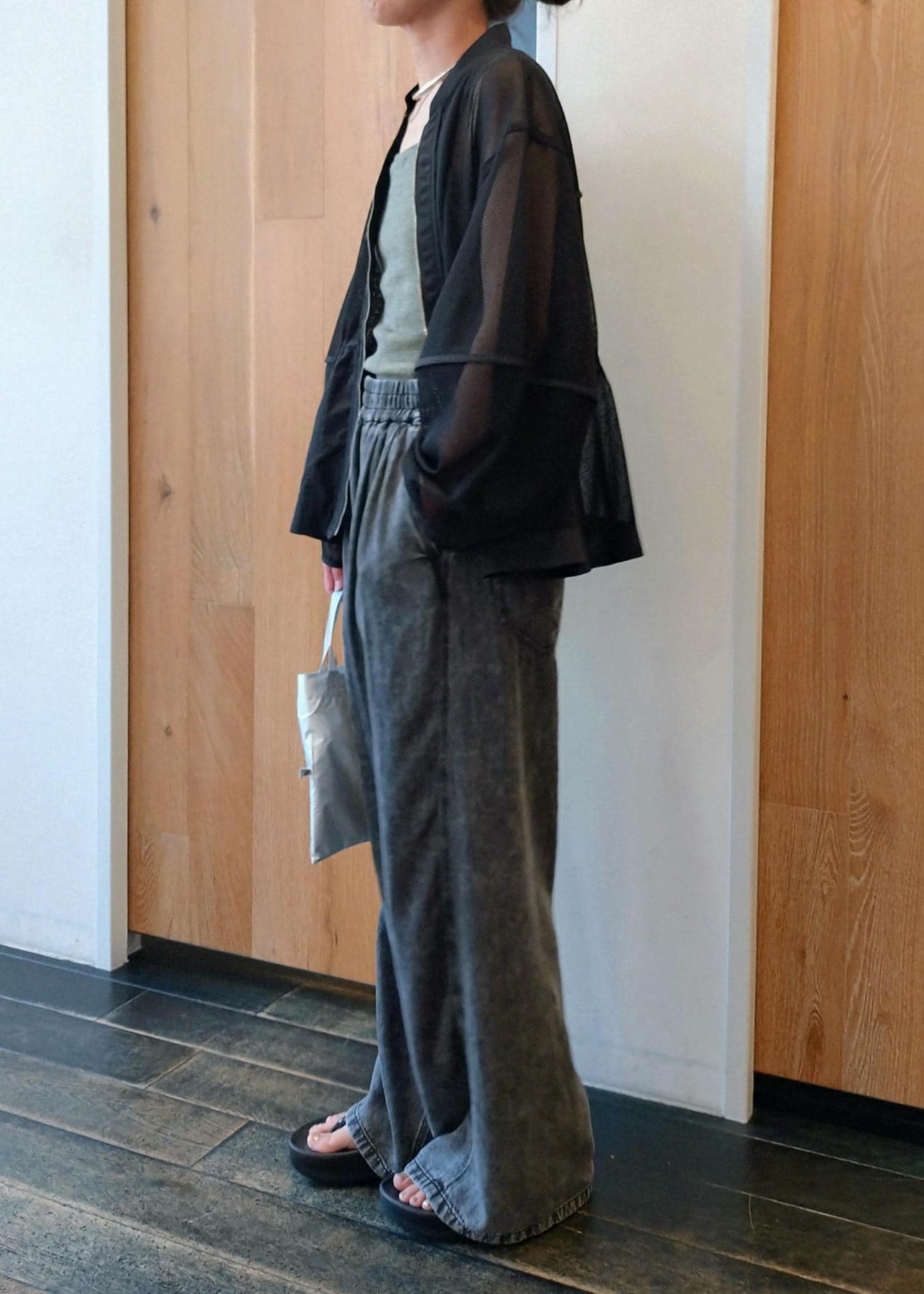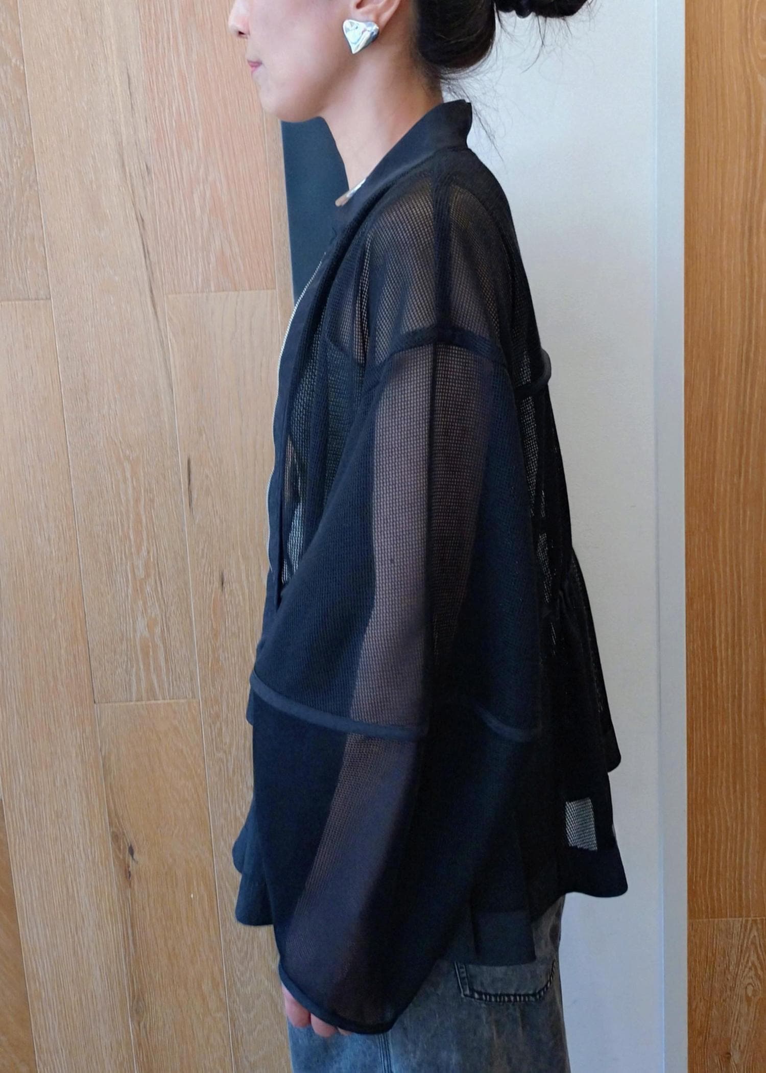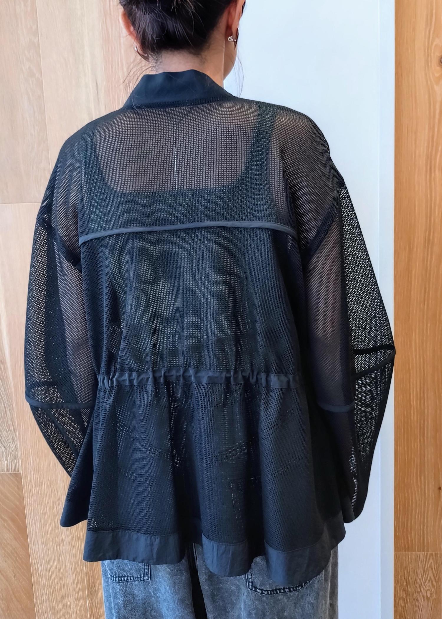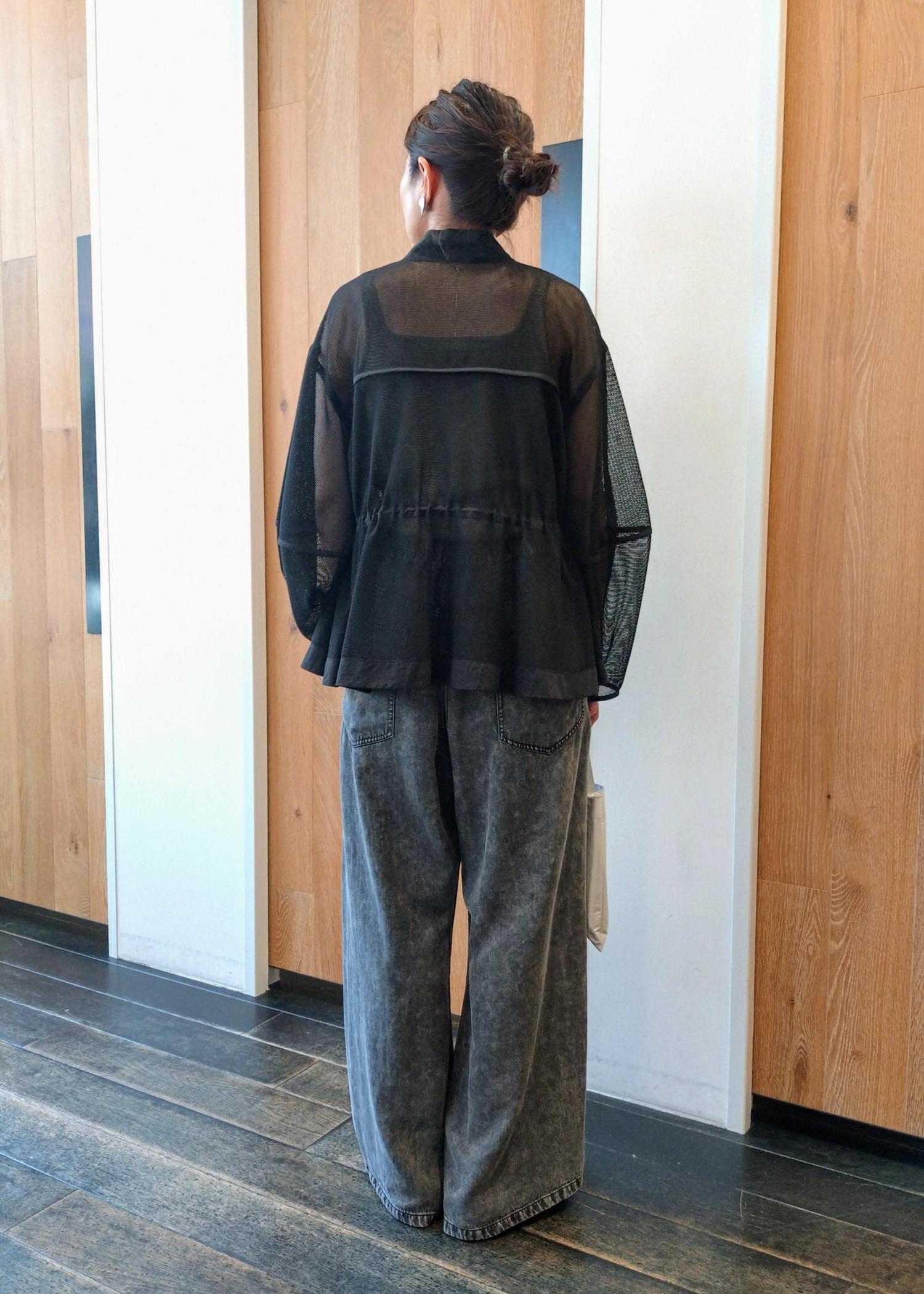 ウエストのドロストで表情を変えられるメッシュカーディガン。