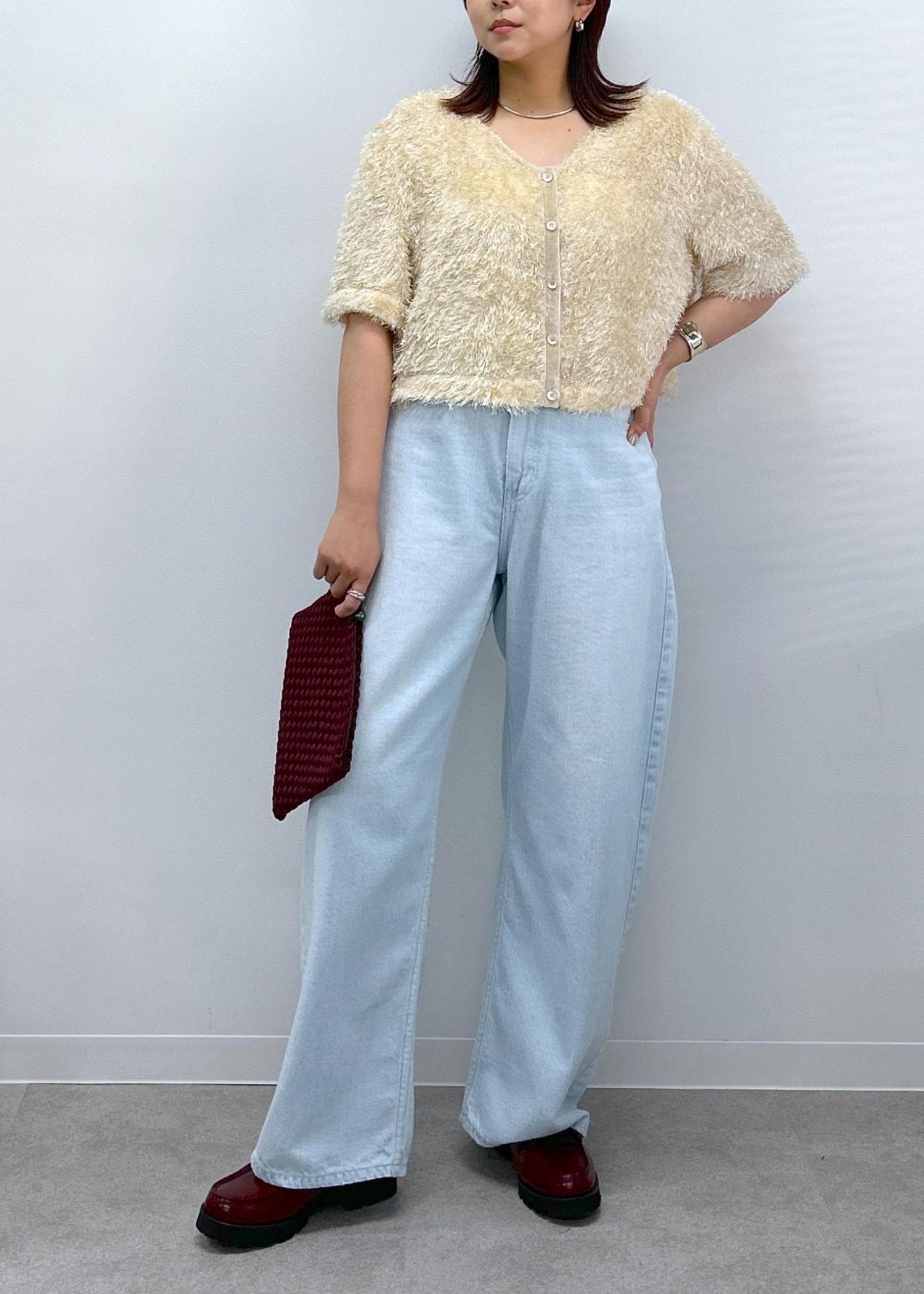 さらさらとした素材感なので夏の終わりぐらいから着用できる一枚です。 -