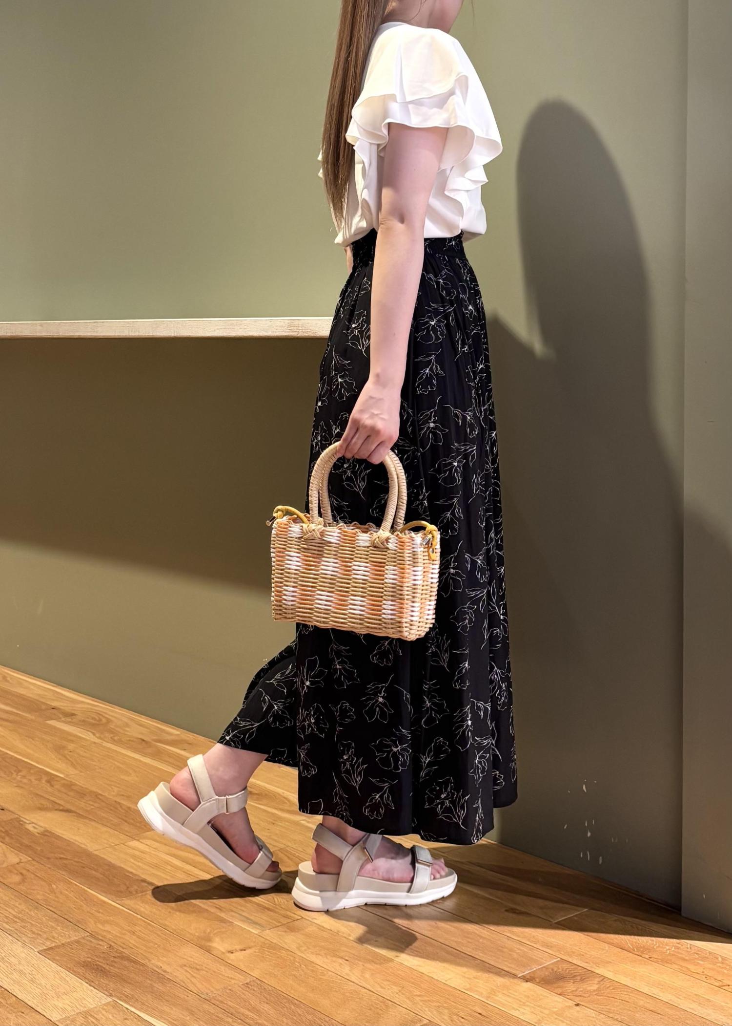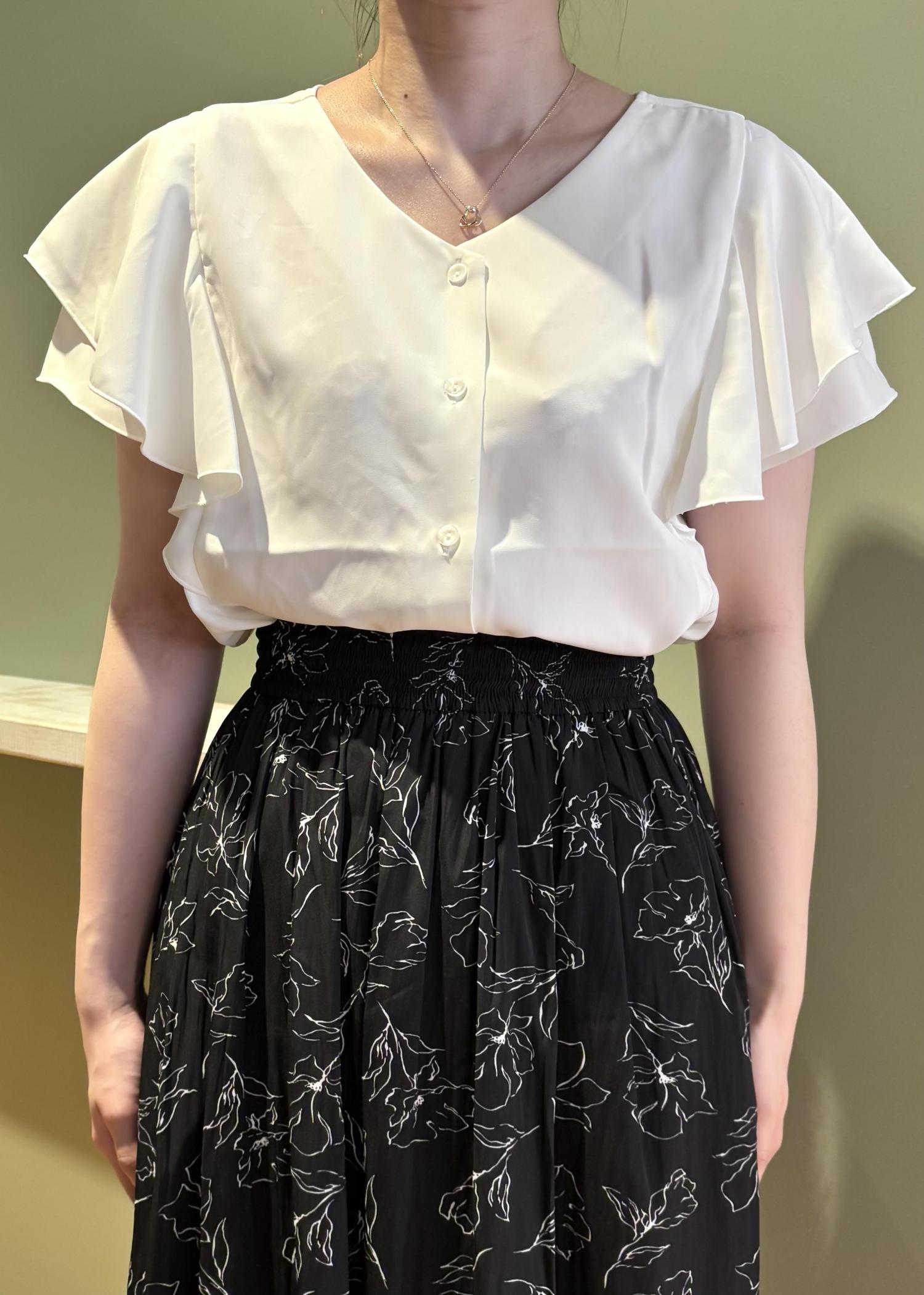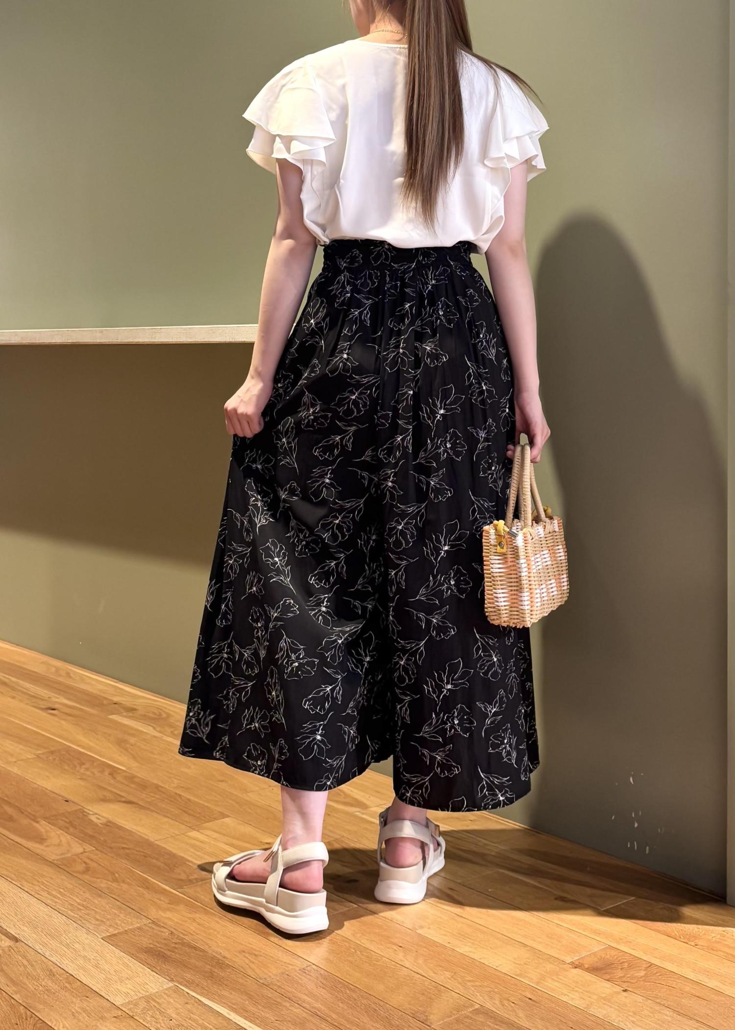 前後2WAY仕様のフレアスリーブブラウスに、似た生地感のサラサラとしたスカーチョを合わせた、キレイめカジュアルなコーディネートです。