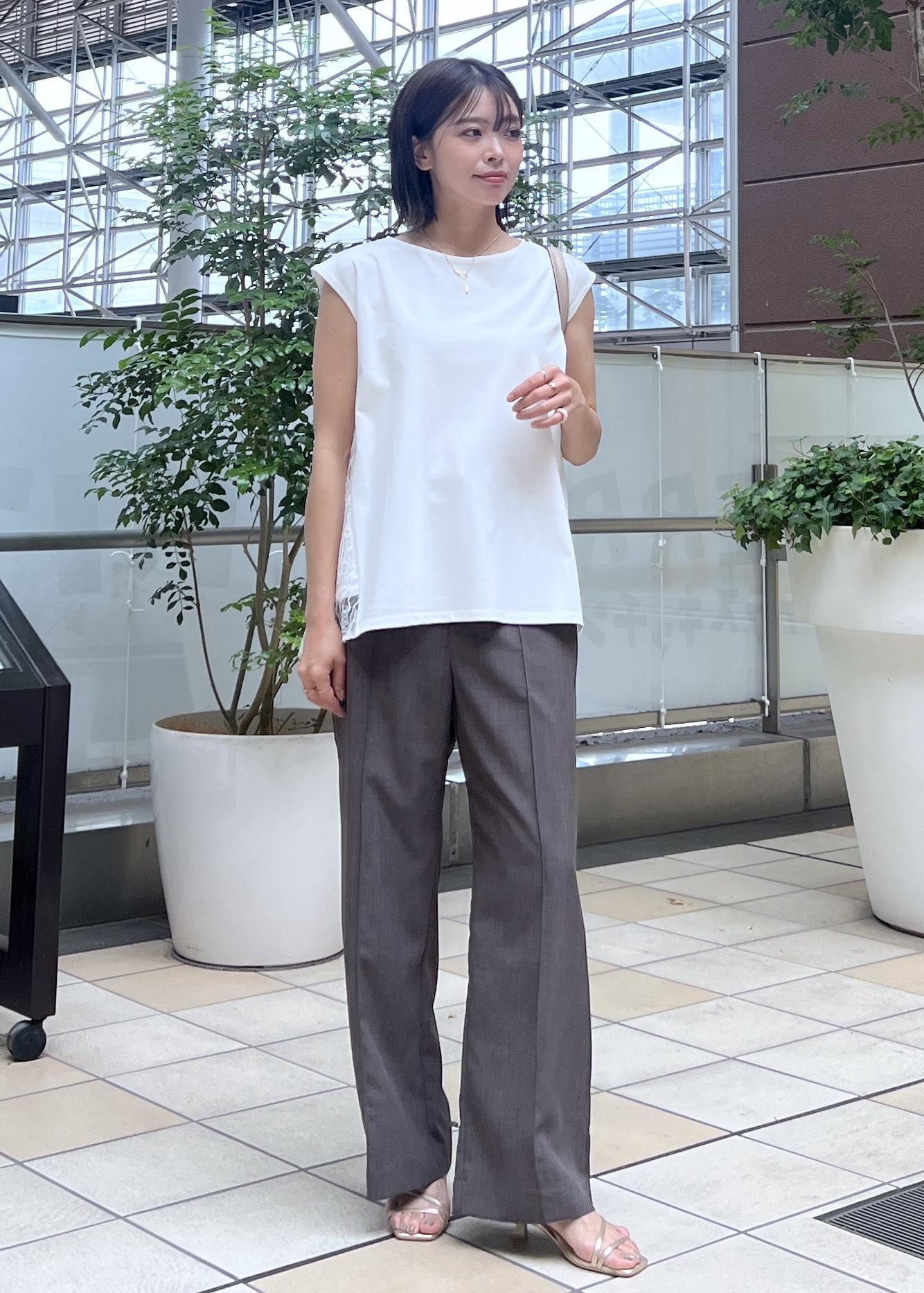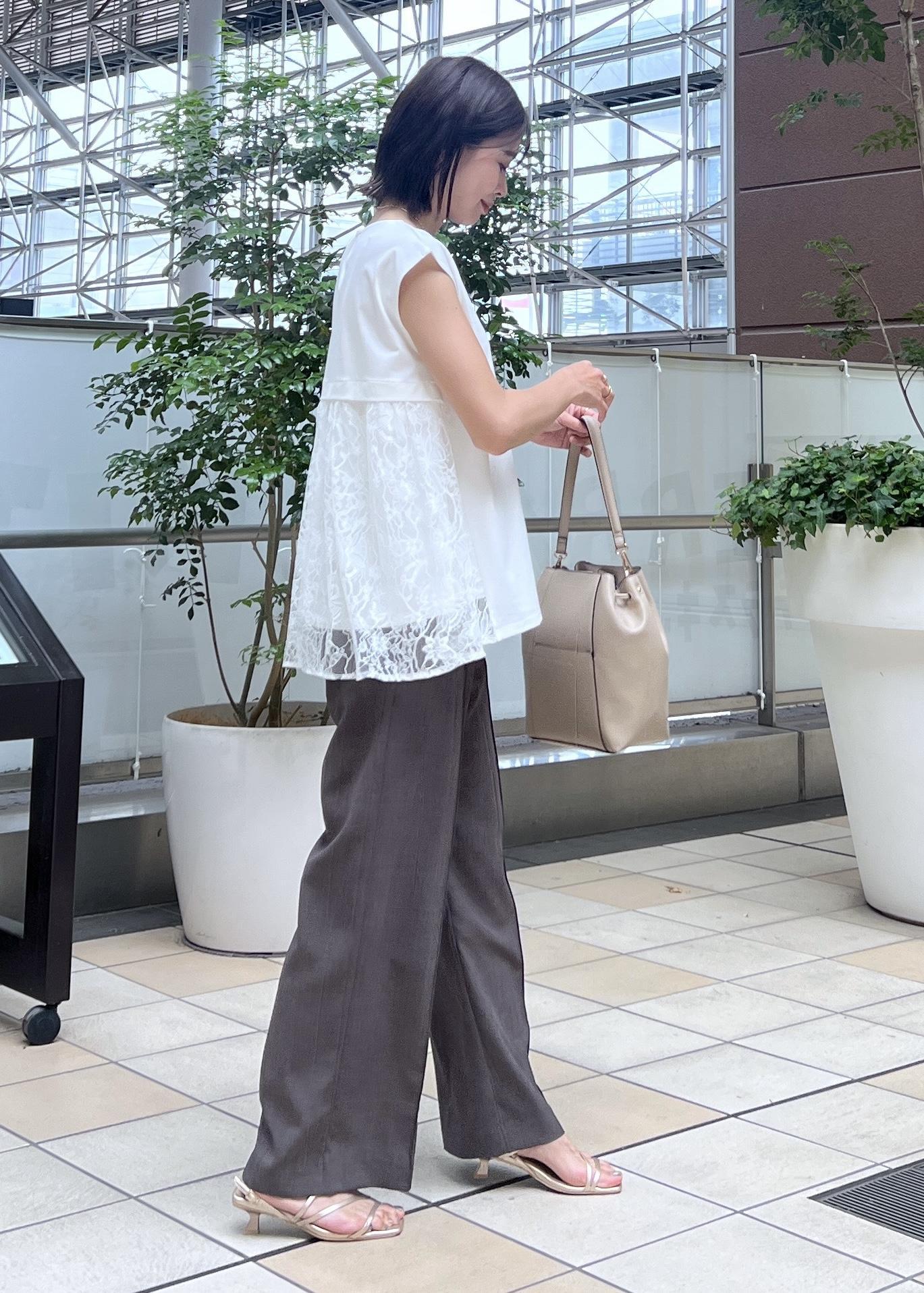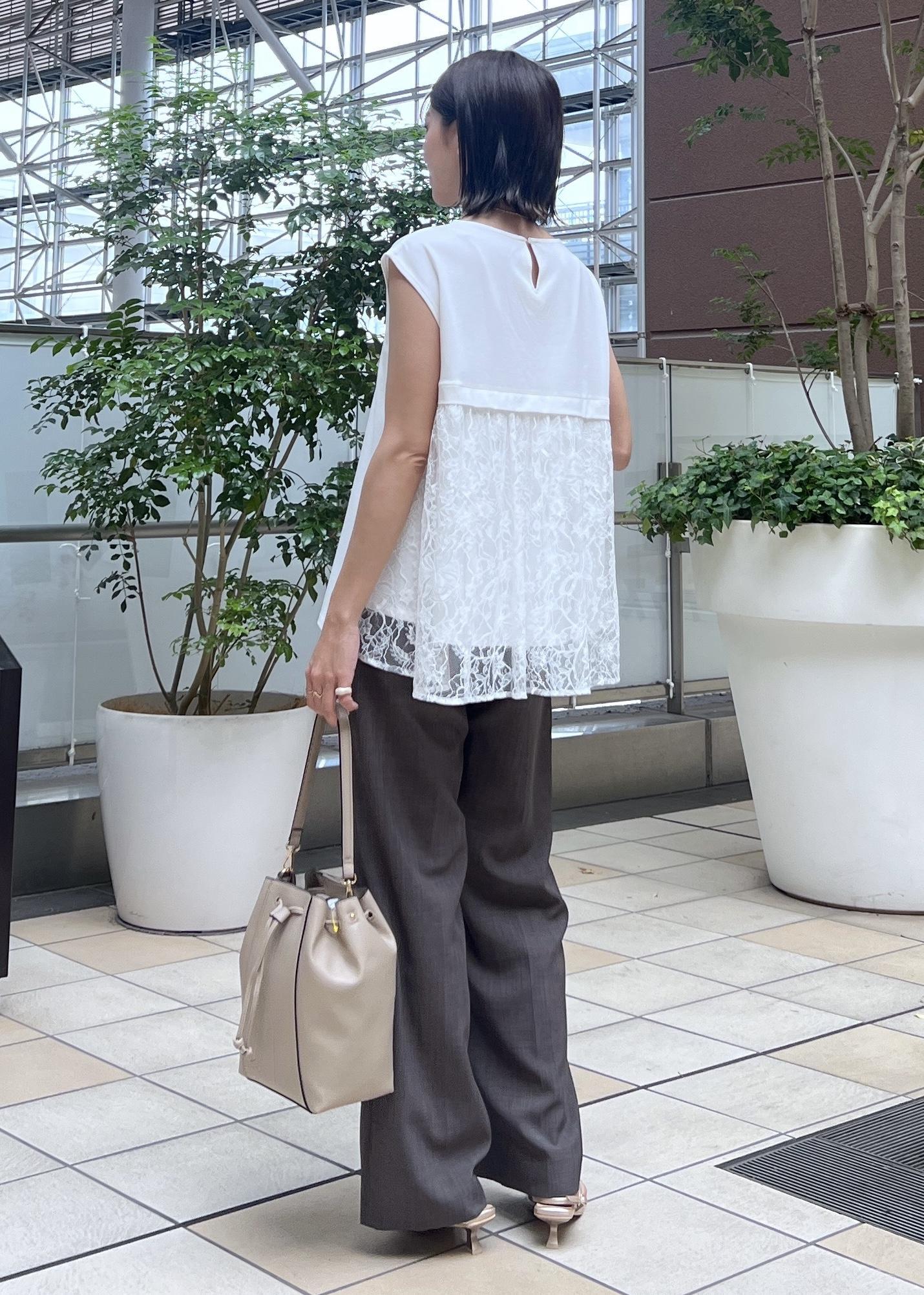 後ろ姿まで抜かりなくオシャレ見えしてくれるレース切り替えのトップスで、夏パンツコーデです。
