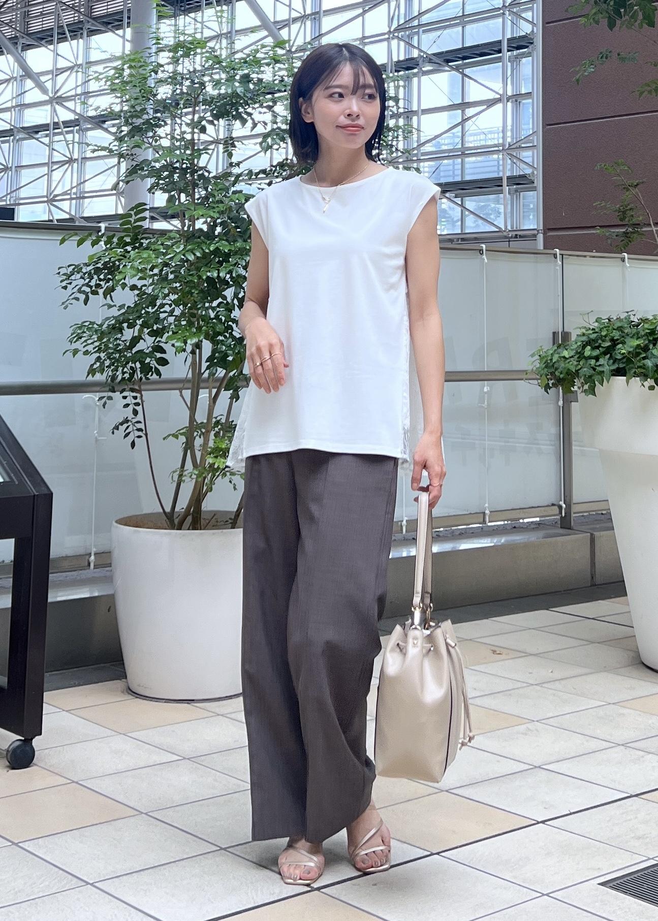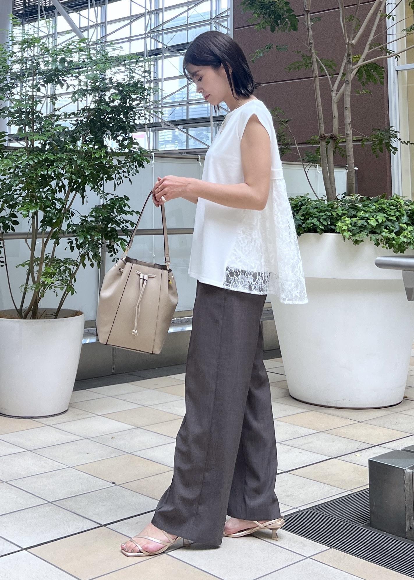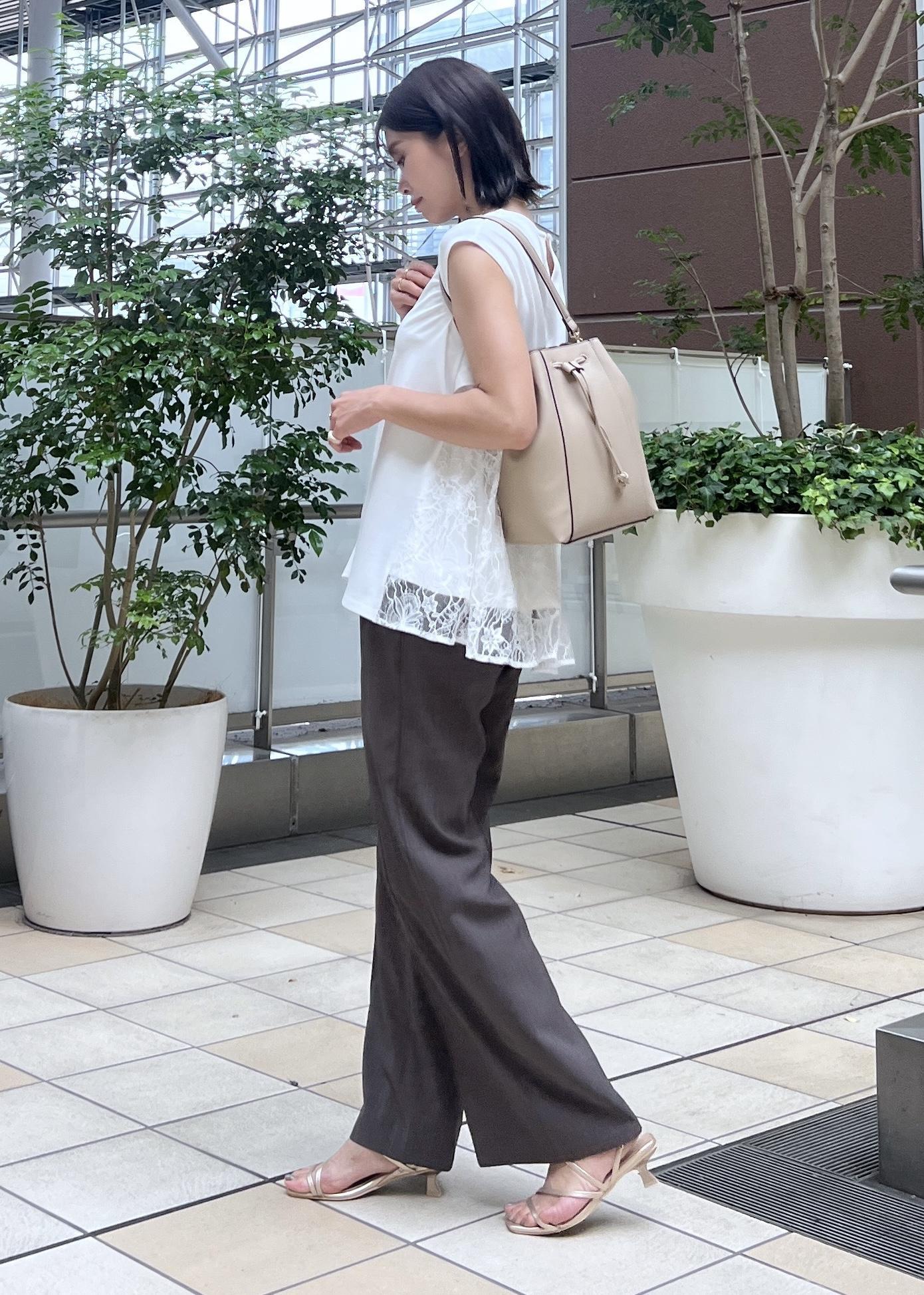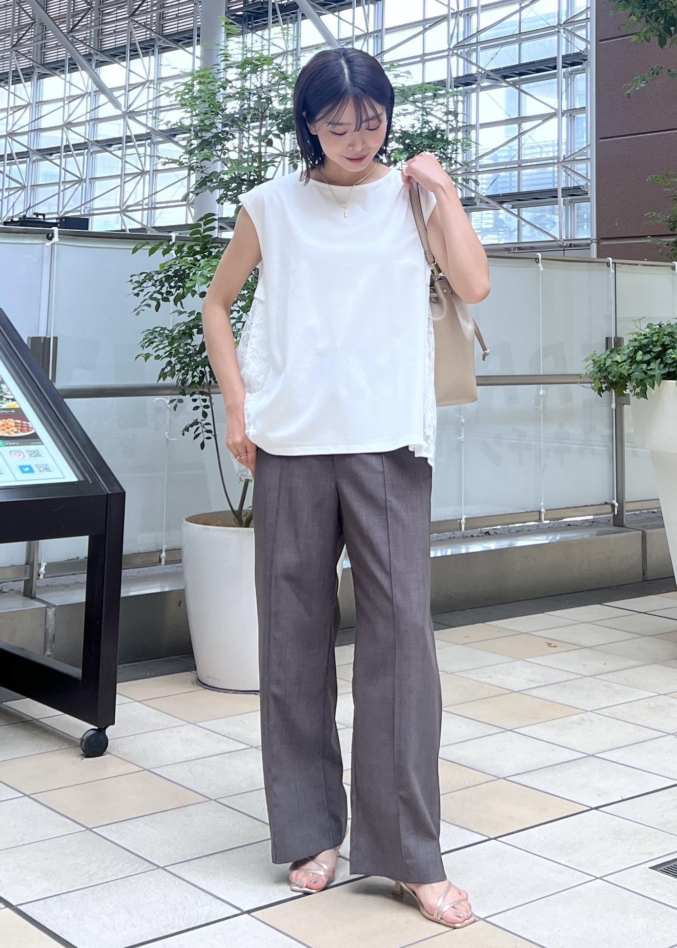 後ろ姿まで抜かりなくオシャレ見えしてくれるレース切り替えのトップスで、夏パンツコーデです。
