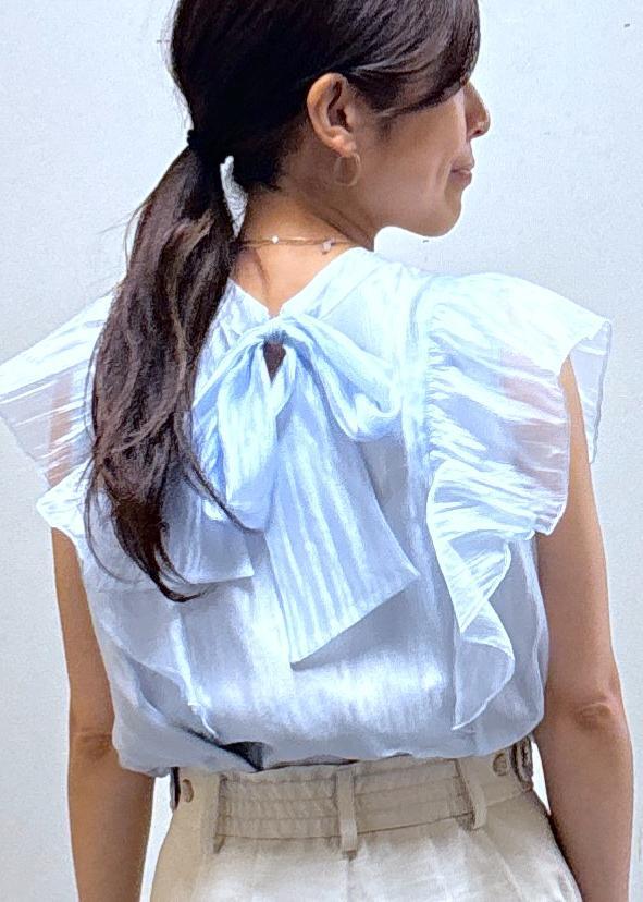 VIS【店頭人気】主役級!華やぎシアーシャイニーボウタイフリルブラウス【前後2WAY】【洗える】サックス / F¥5,489レビュー身長156cm/Fサイズ着用。着丈はお尻にかかる長さで、袖はぼぼノースリーブに近い丈。ですが‼︎フレアな袖が肩を隠してボリュームを出してくれるので腕周りスッキリ見えします‼︎ほどよく身幅があり着脱しやすかったです♪軽くて暑い時期にも着やすいですよ!