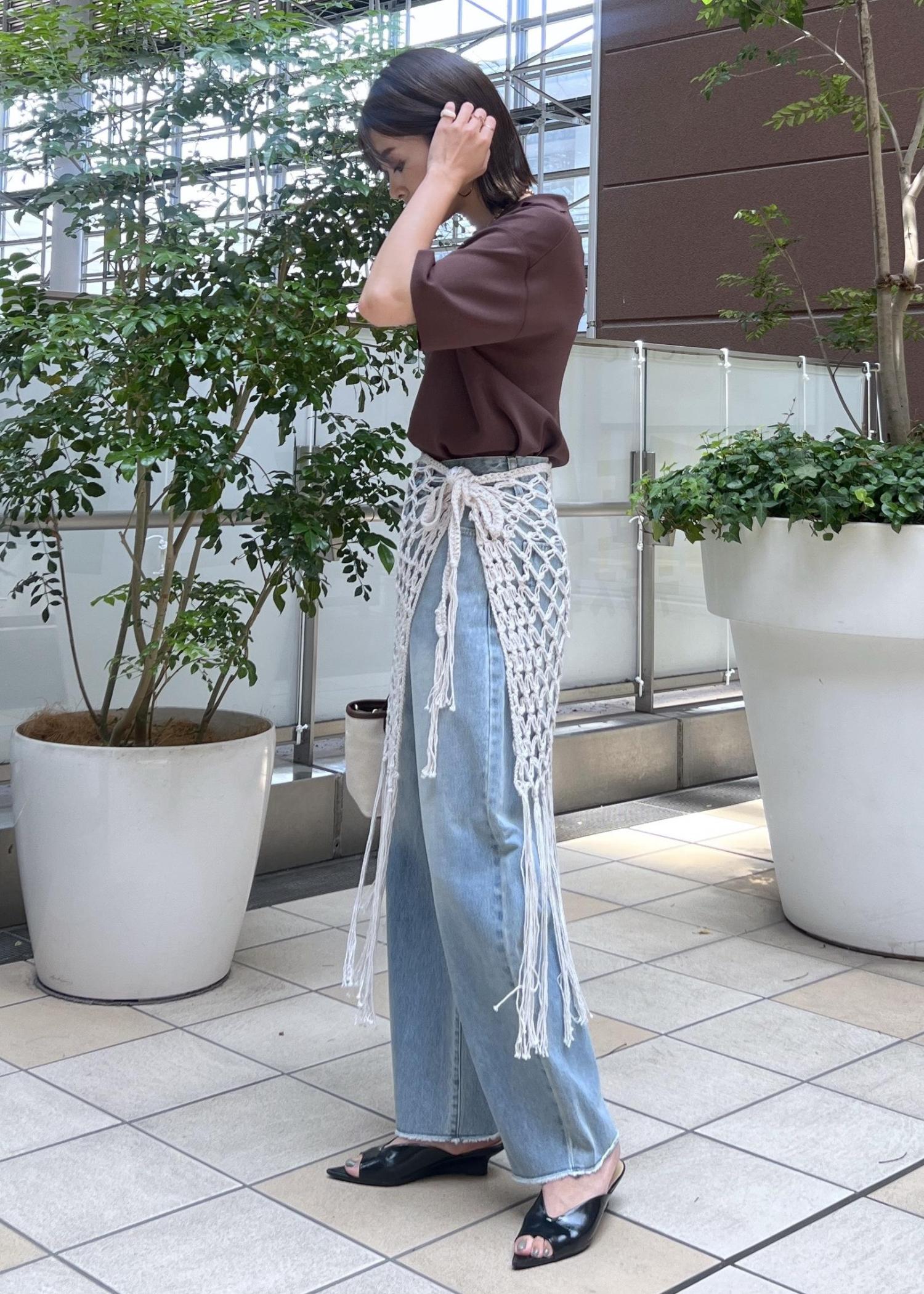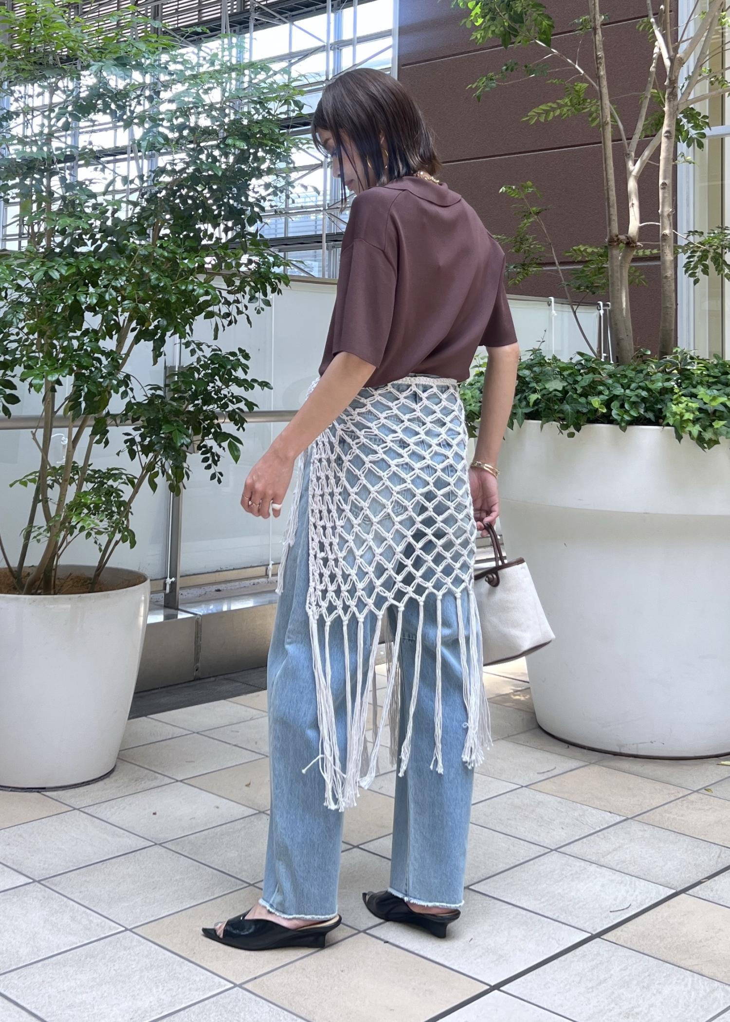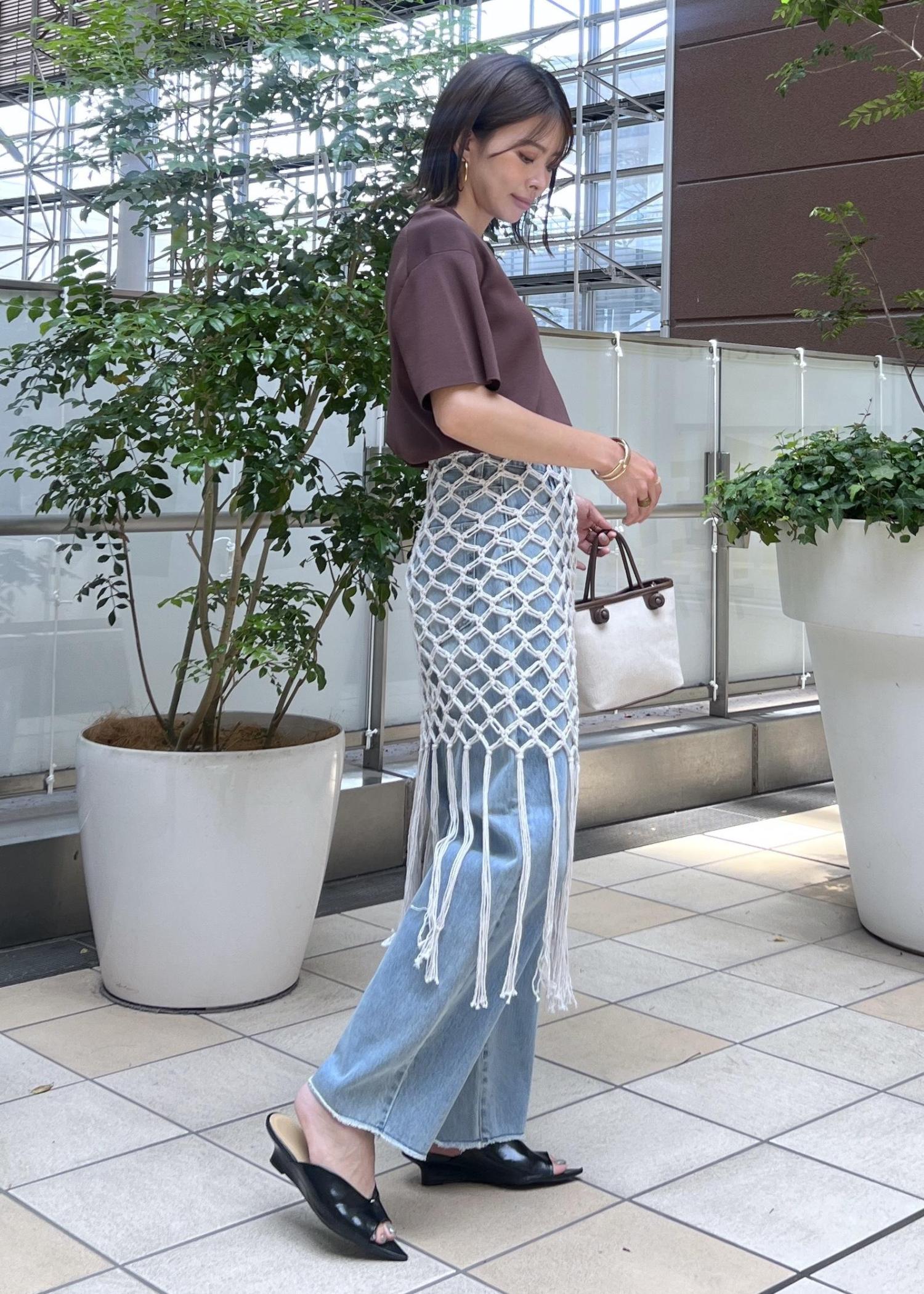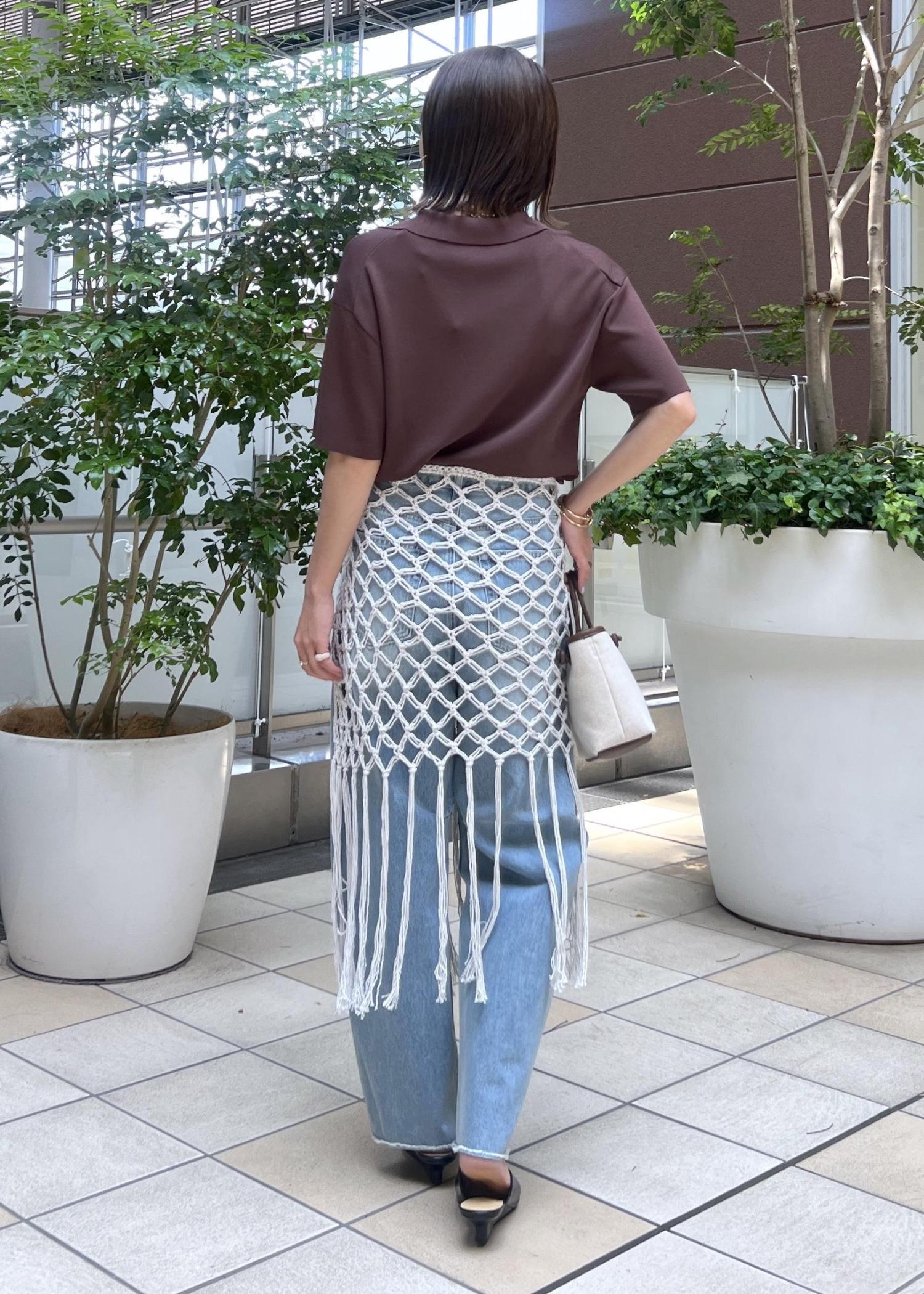 デニムだけだとシンプルなので、かぎ針編みのニットスカートを巻いてレイヤードするのがポイント。