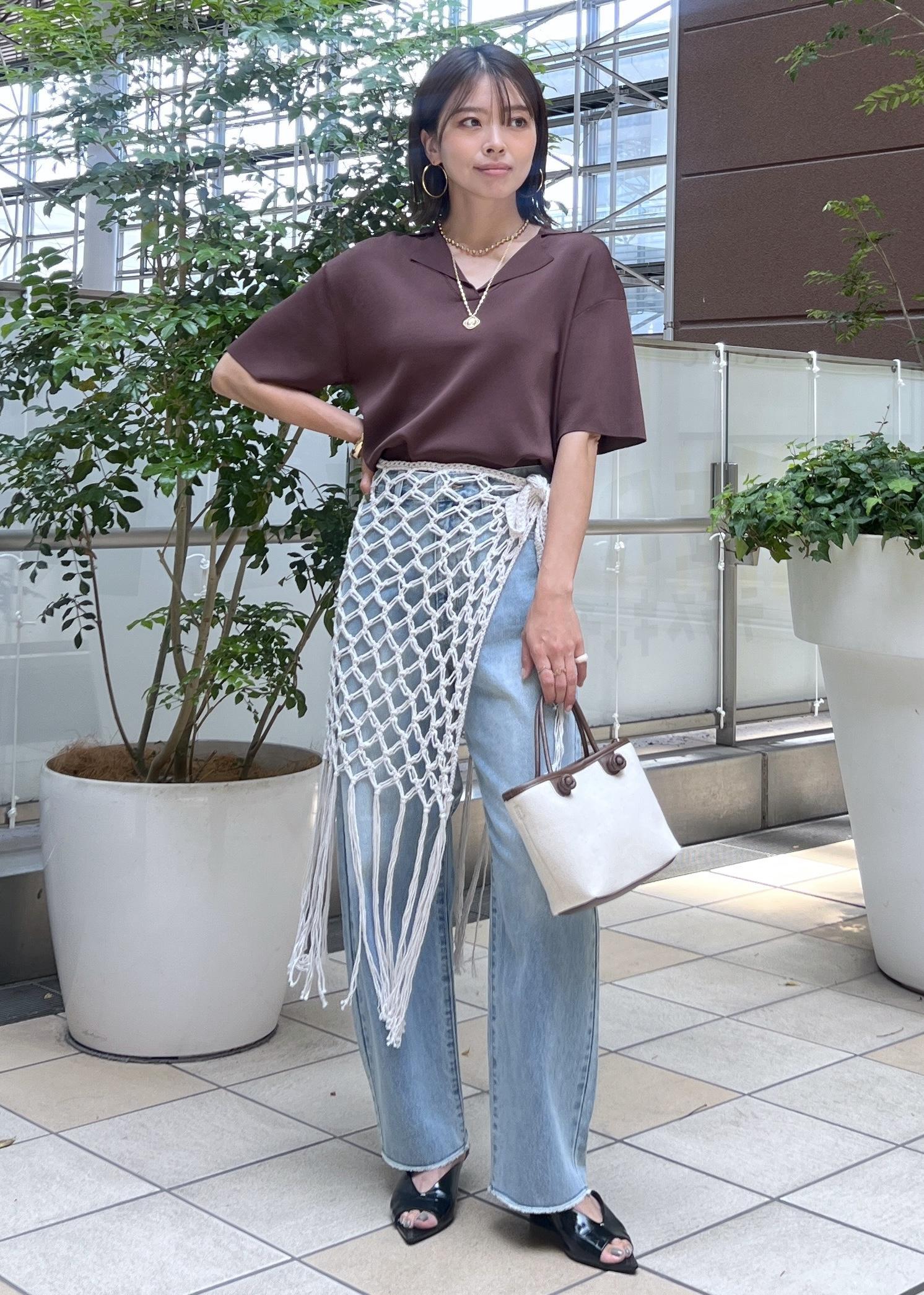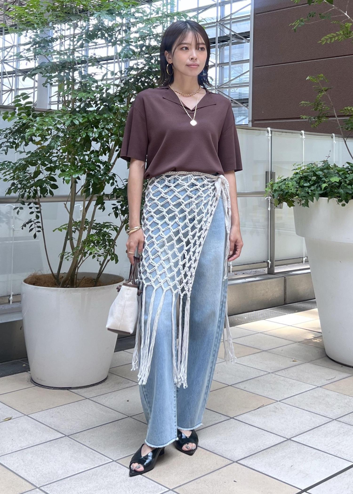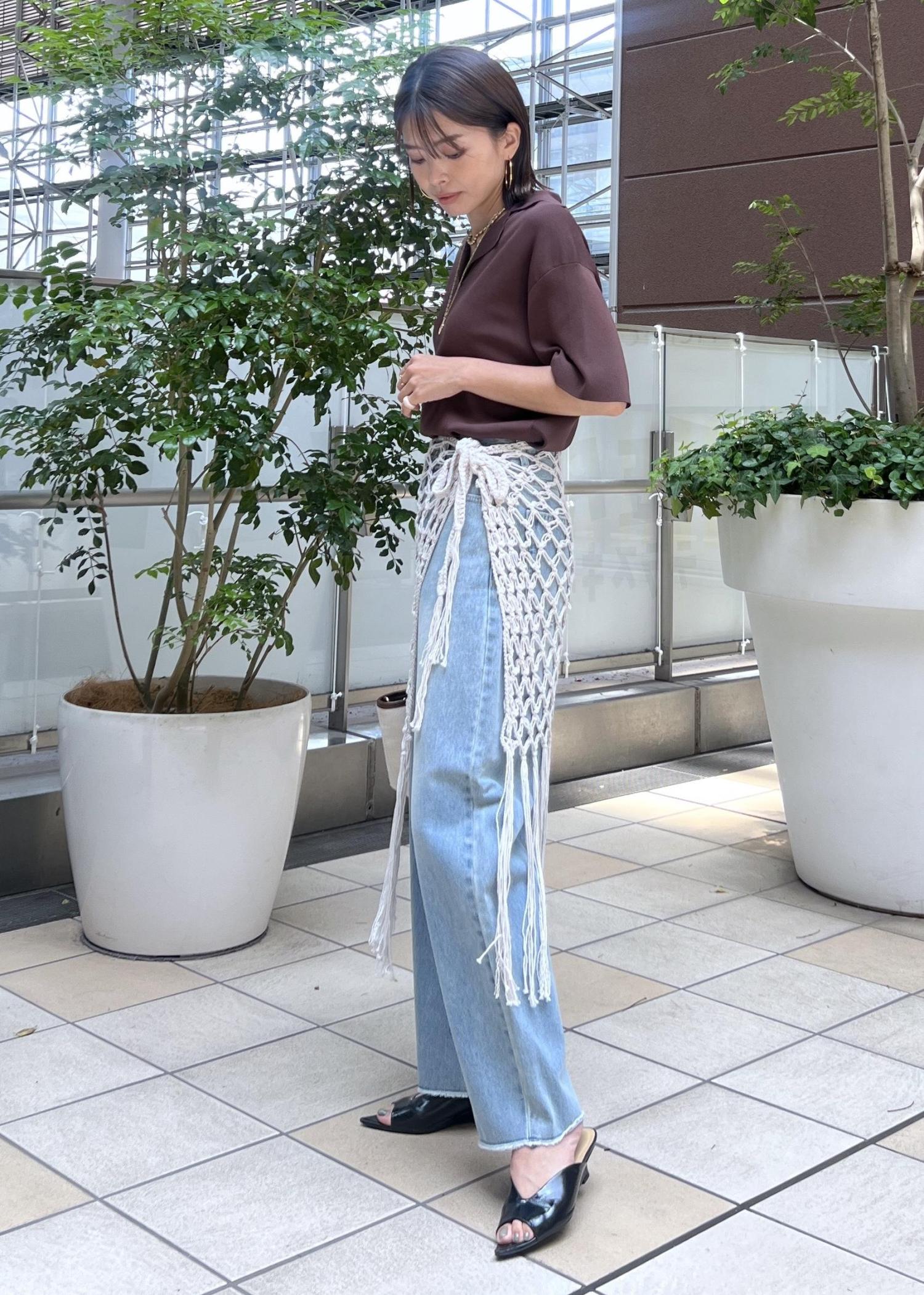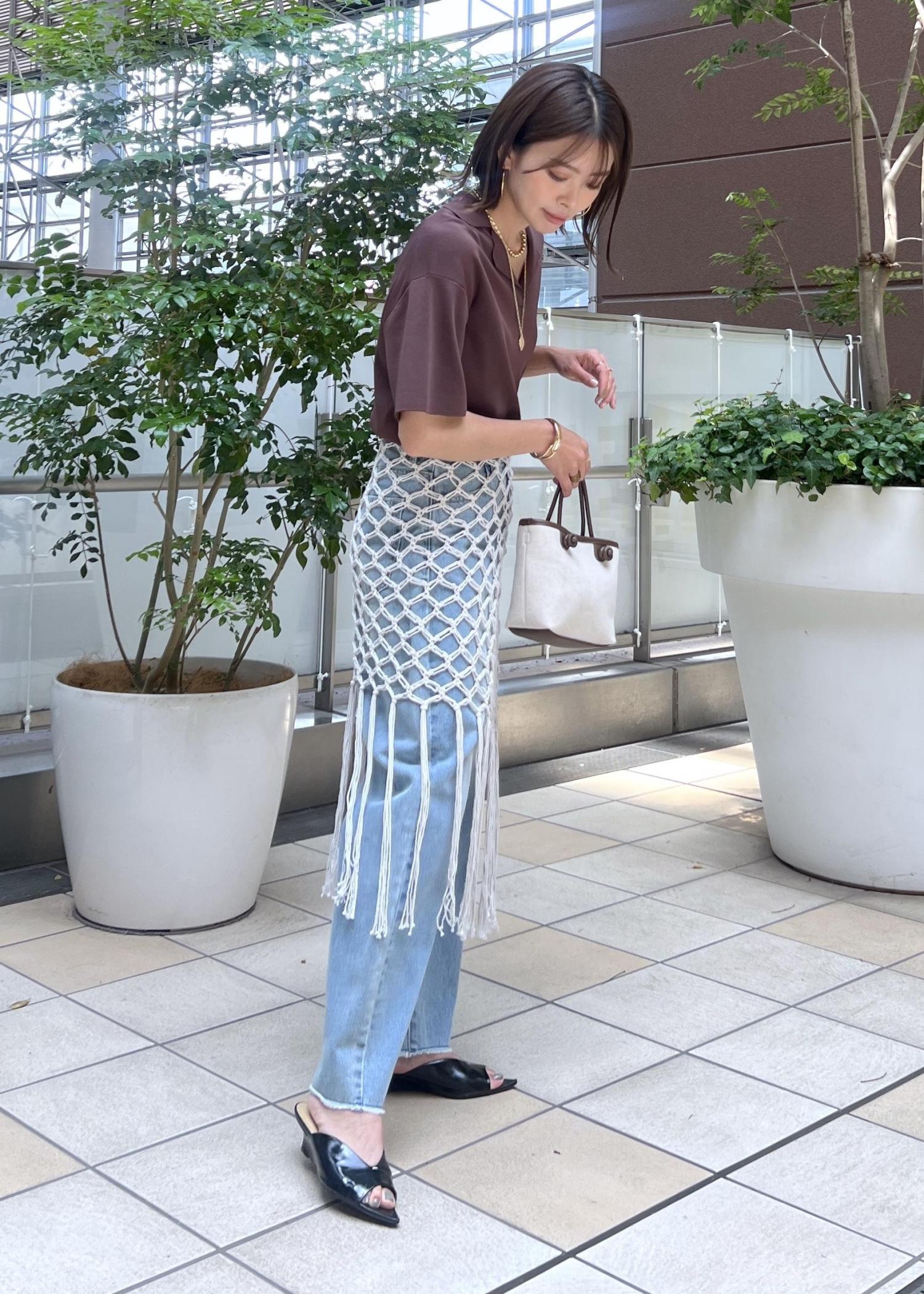 デニムだけだとシンプルなので、かぎ針編みのニットスカートを巻いてレイヤードするのがポイント。