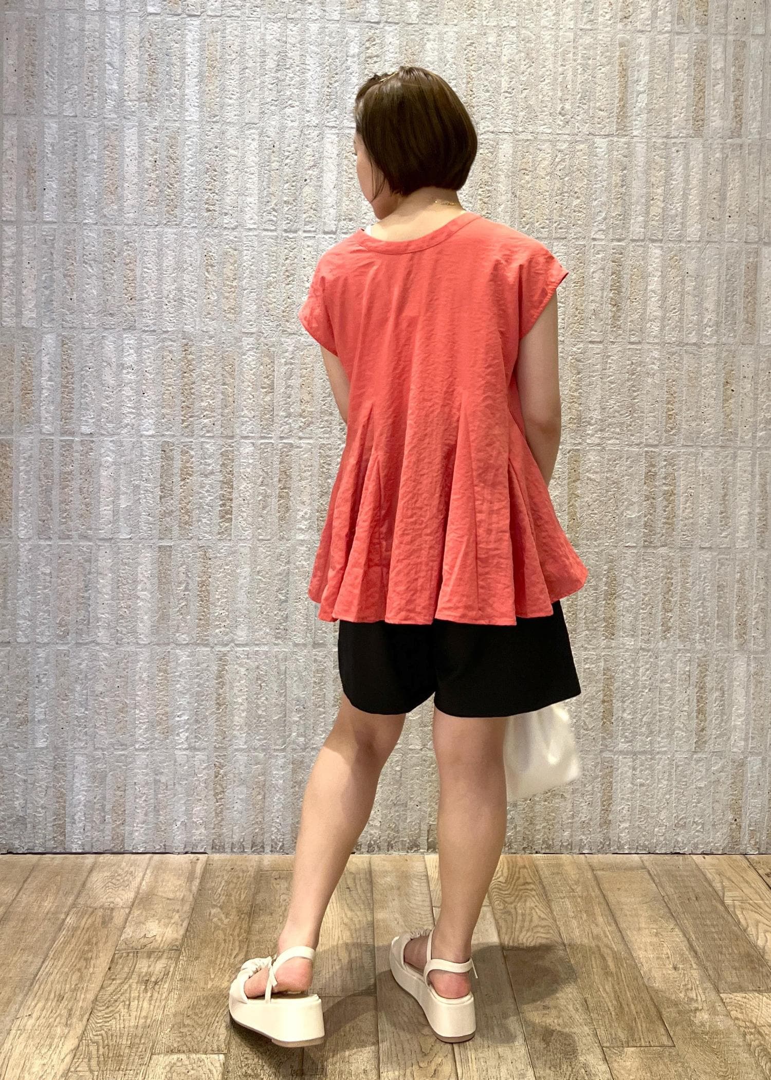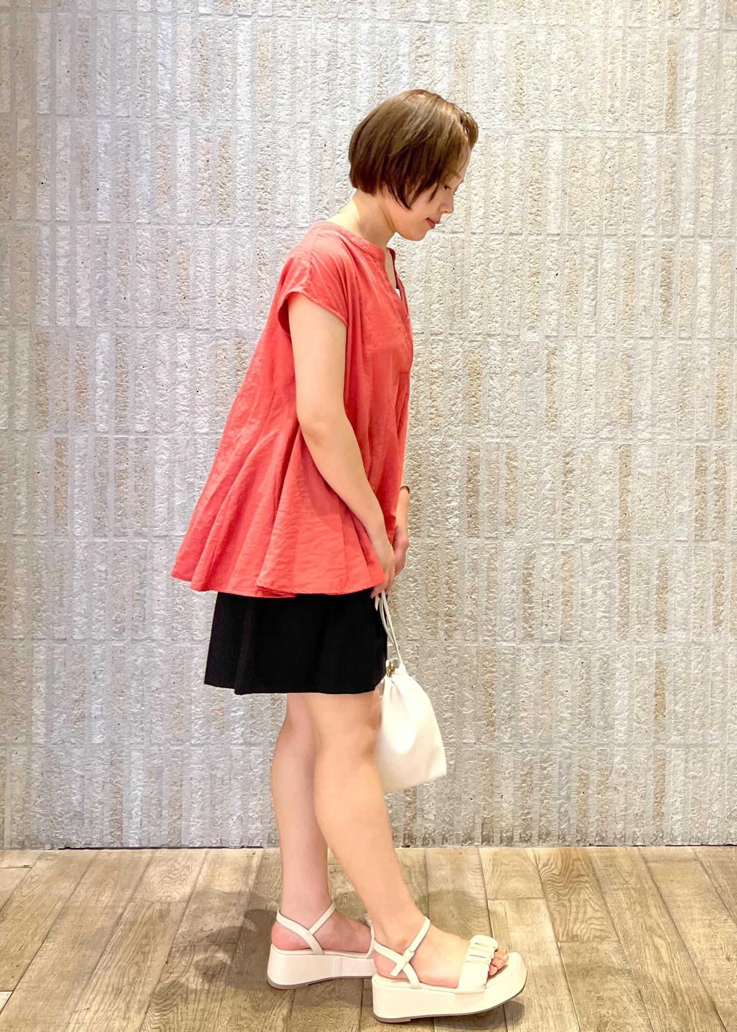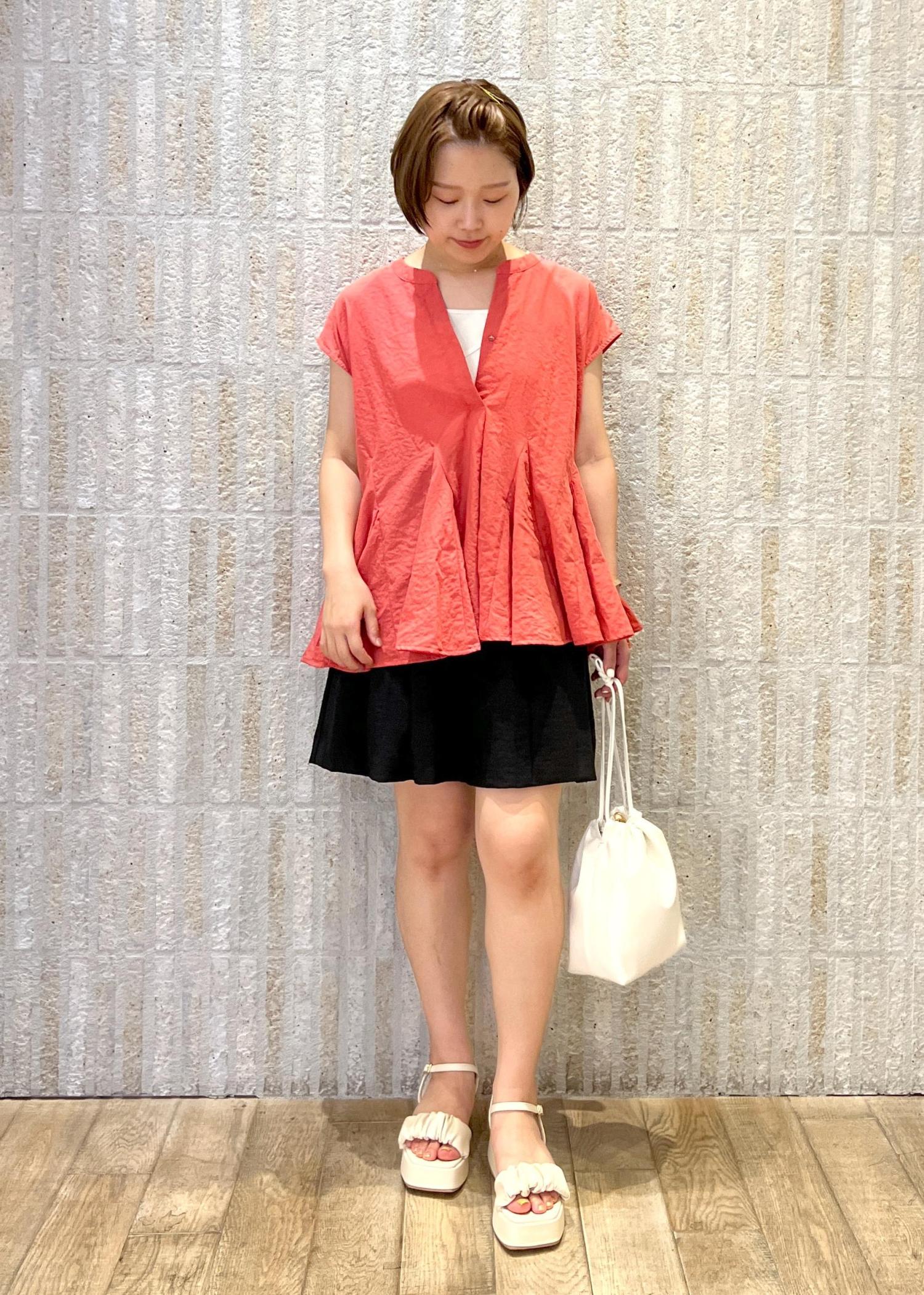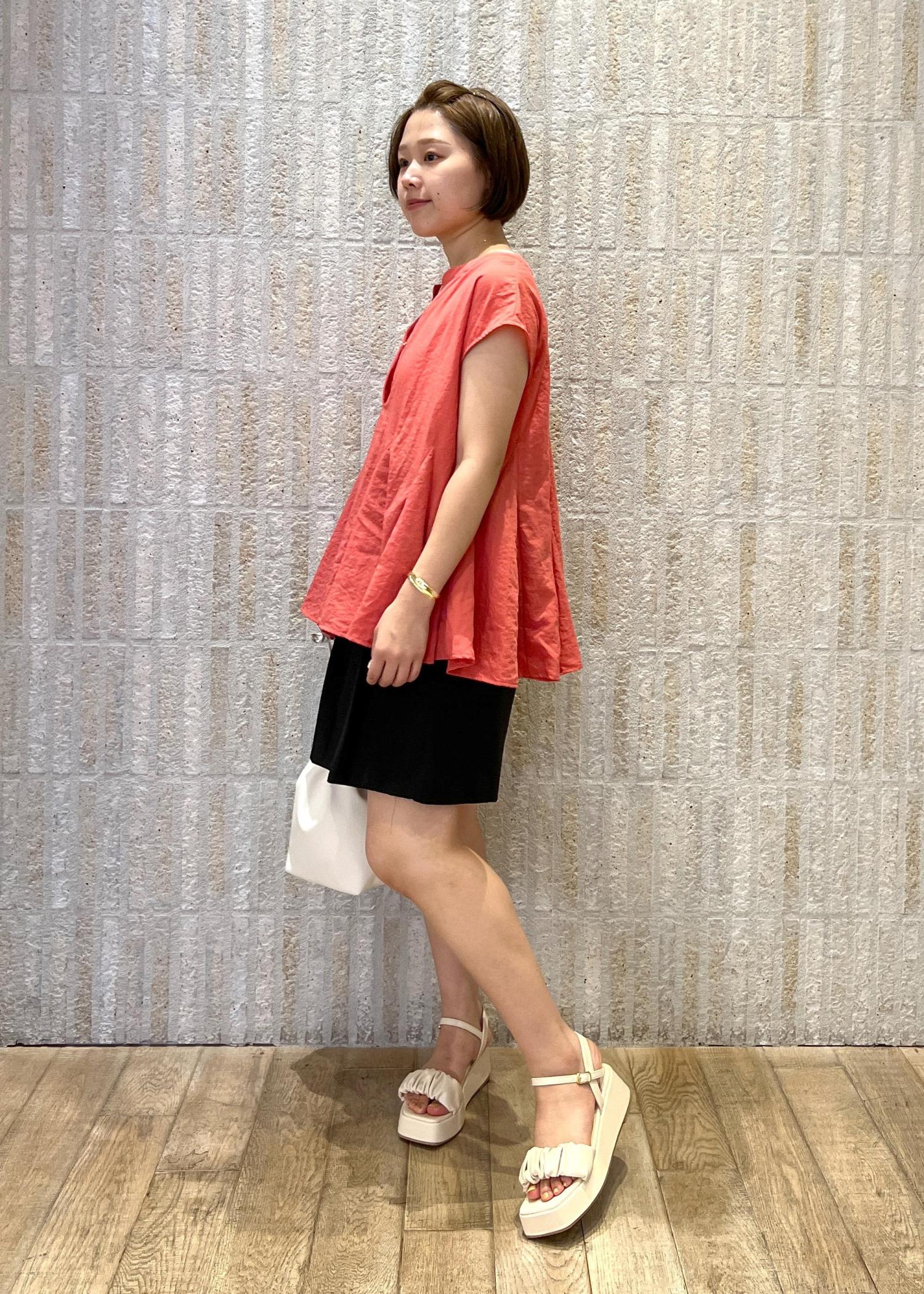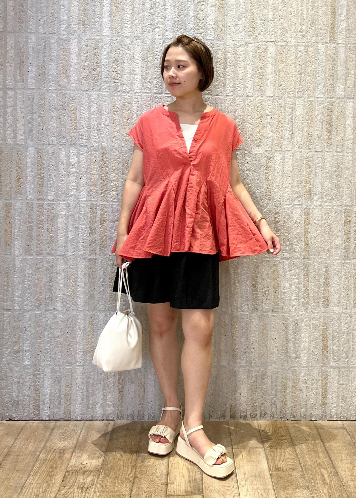 ビタミンカラーとショートパンツでカジュアルな雰囲気ですが、ブラウスのフリルや足元で女性らしさも取り入れています!