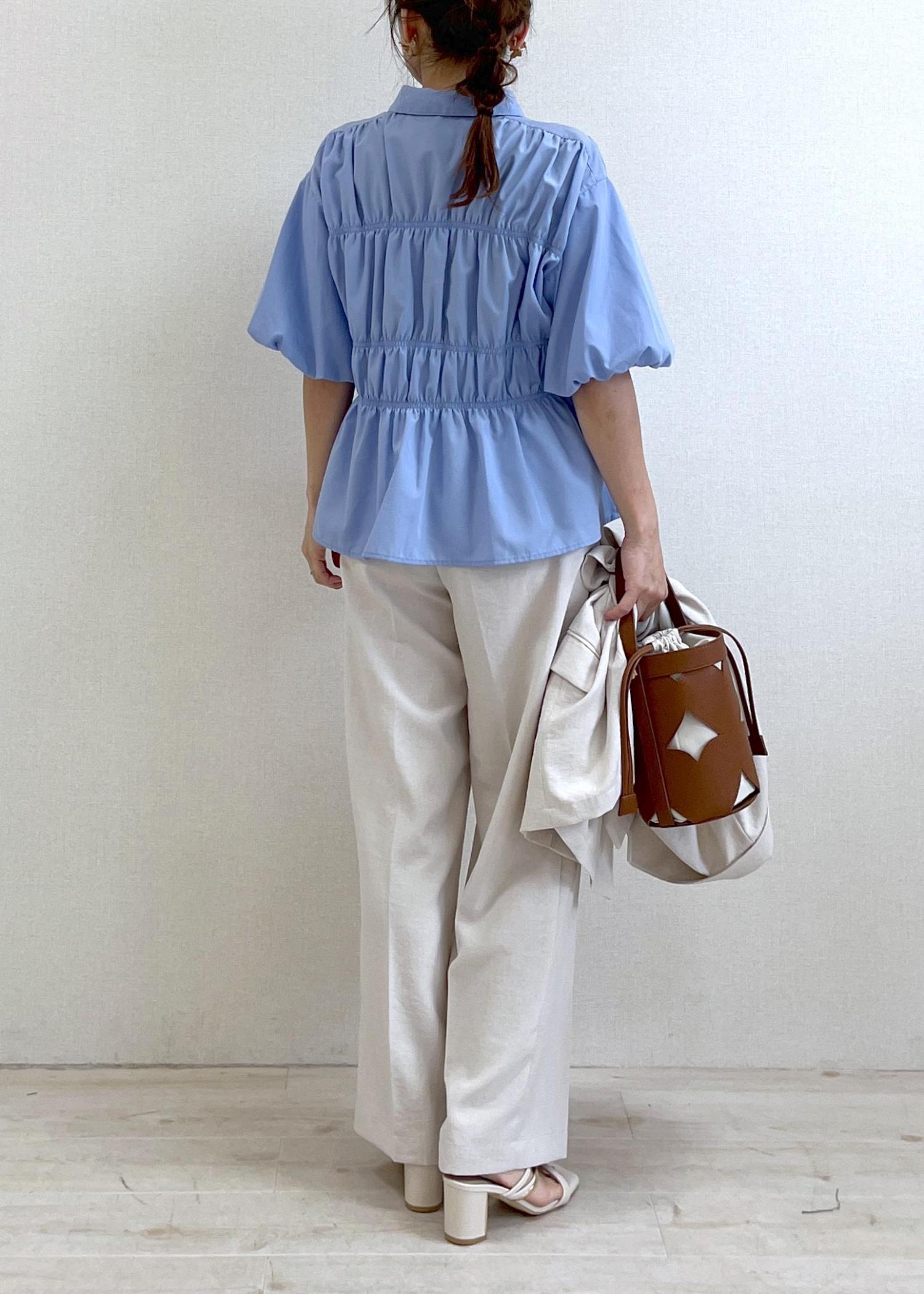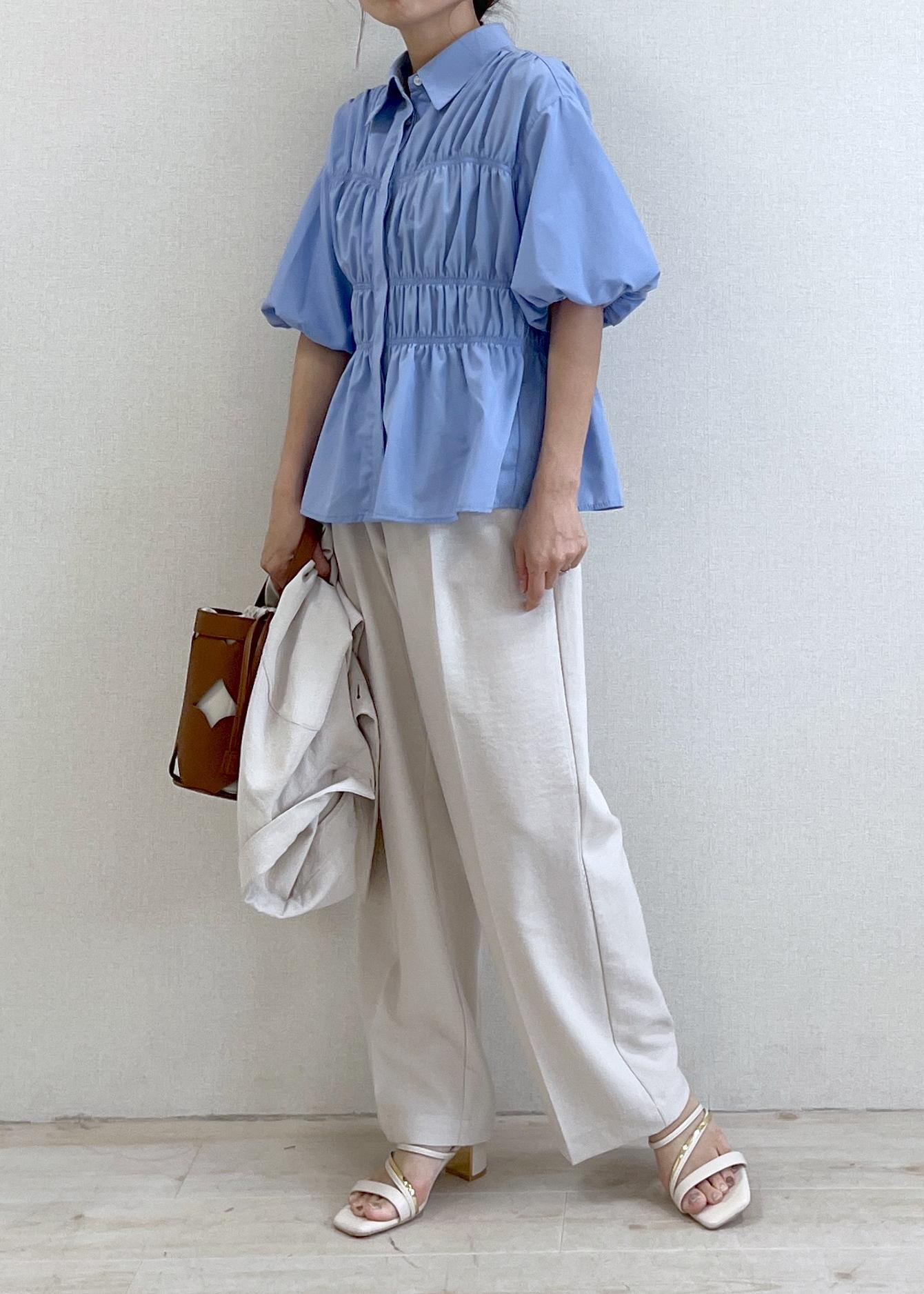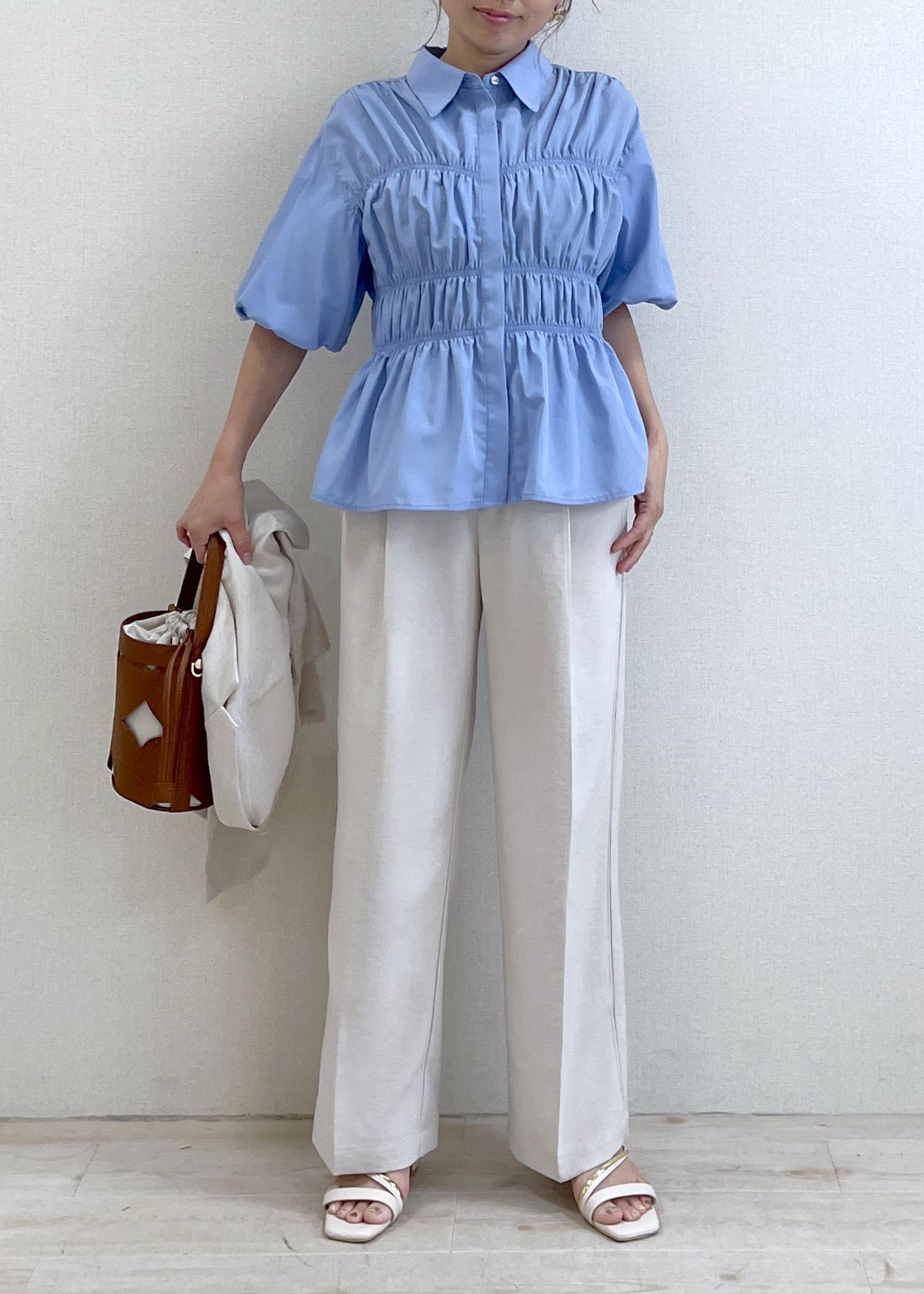 ギャザーが美しいブルーシャツに、ナチュラルな白パンツを合わせて。シルエットは華やかに、着心地は軽やかに。オンにもオフにも活躍する、きちんと感とリラックス感を両立した好印象スタイル。