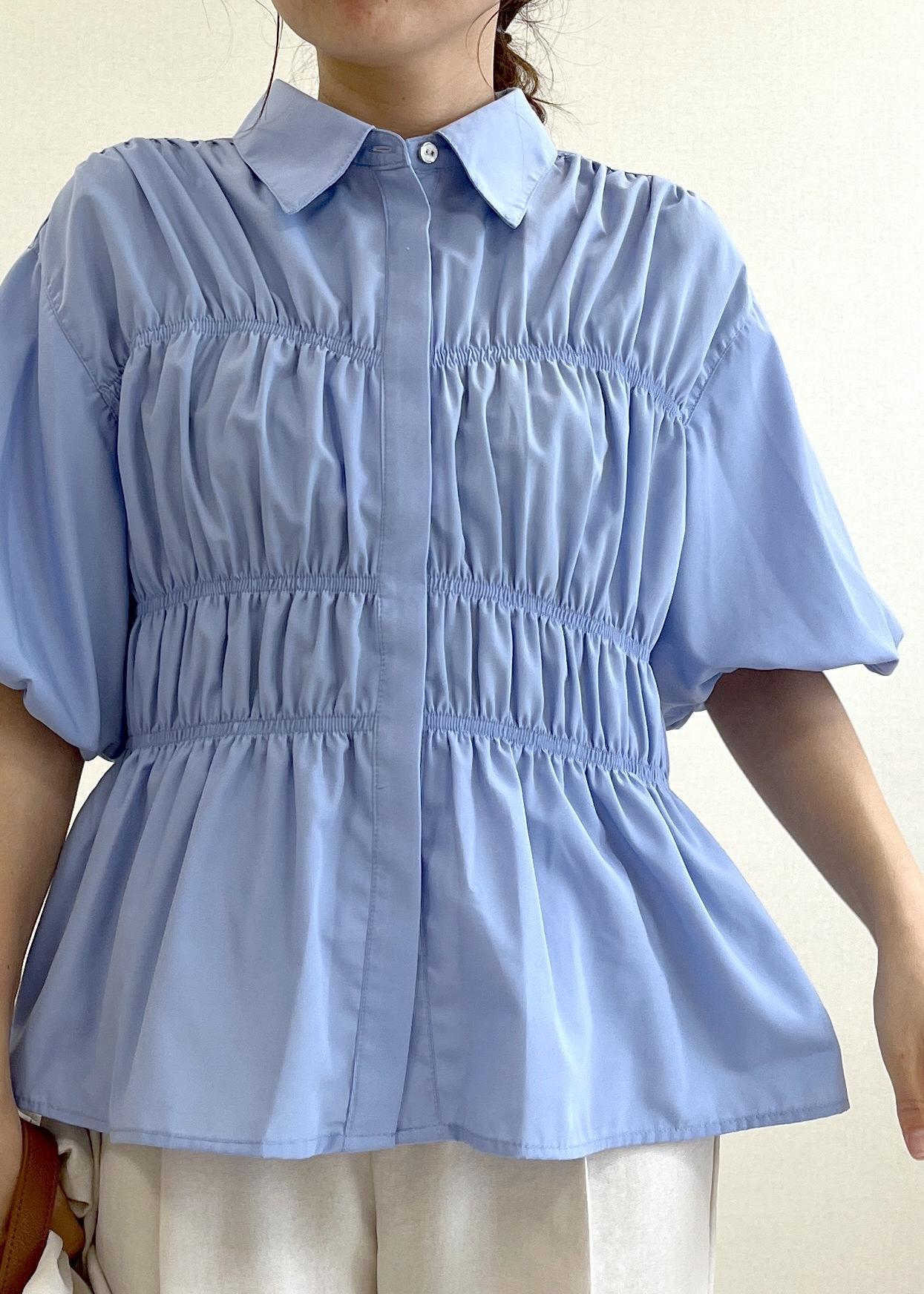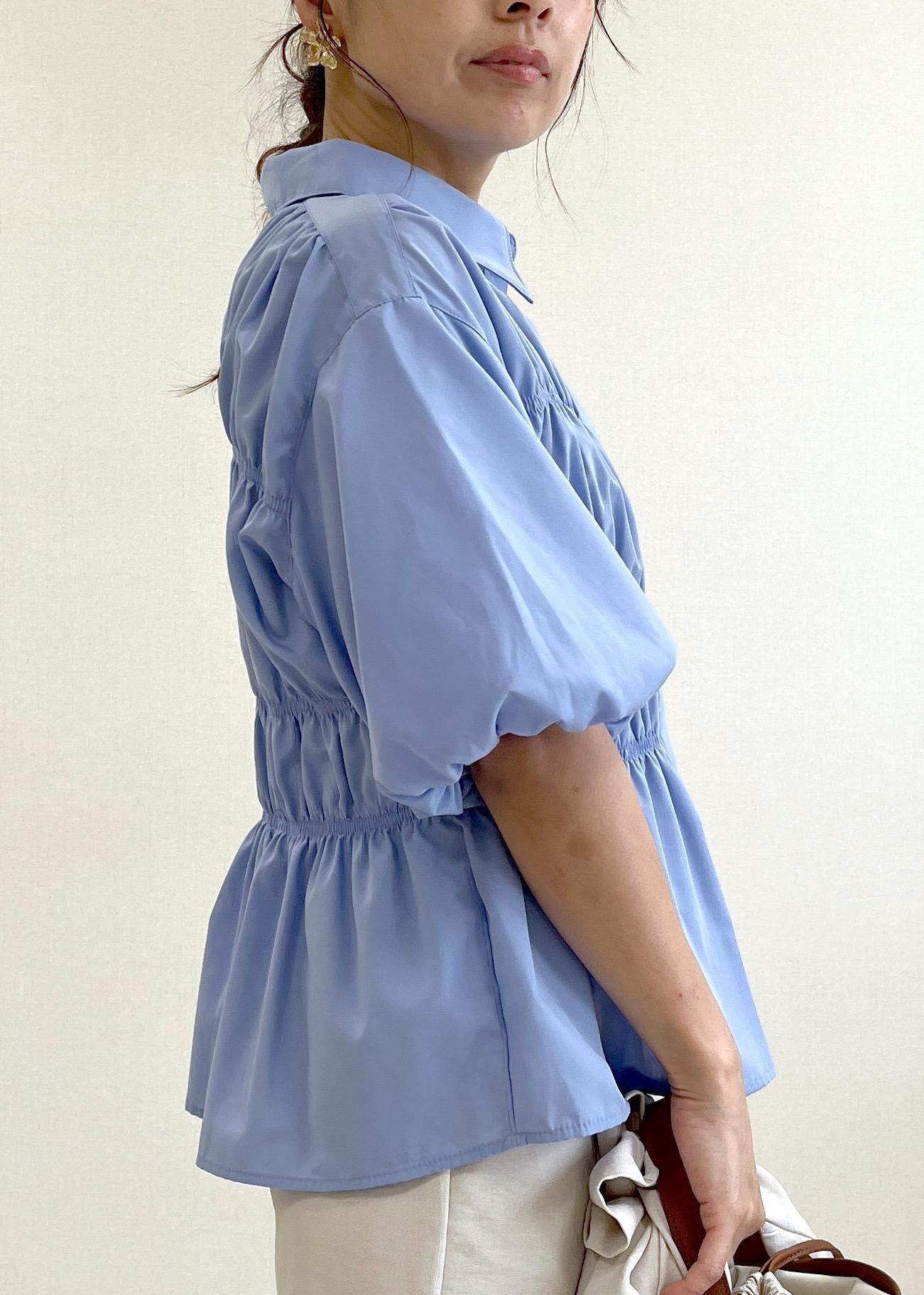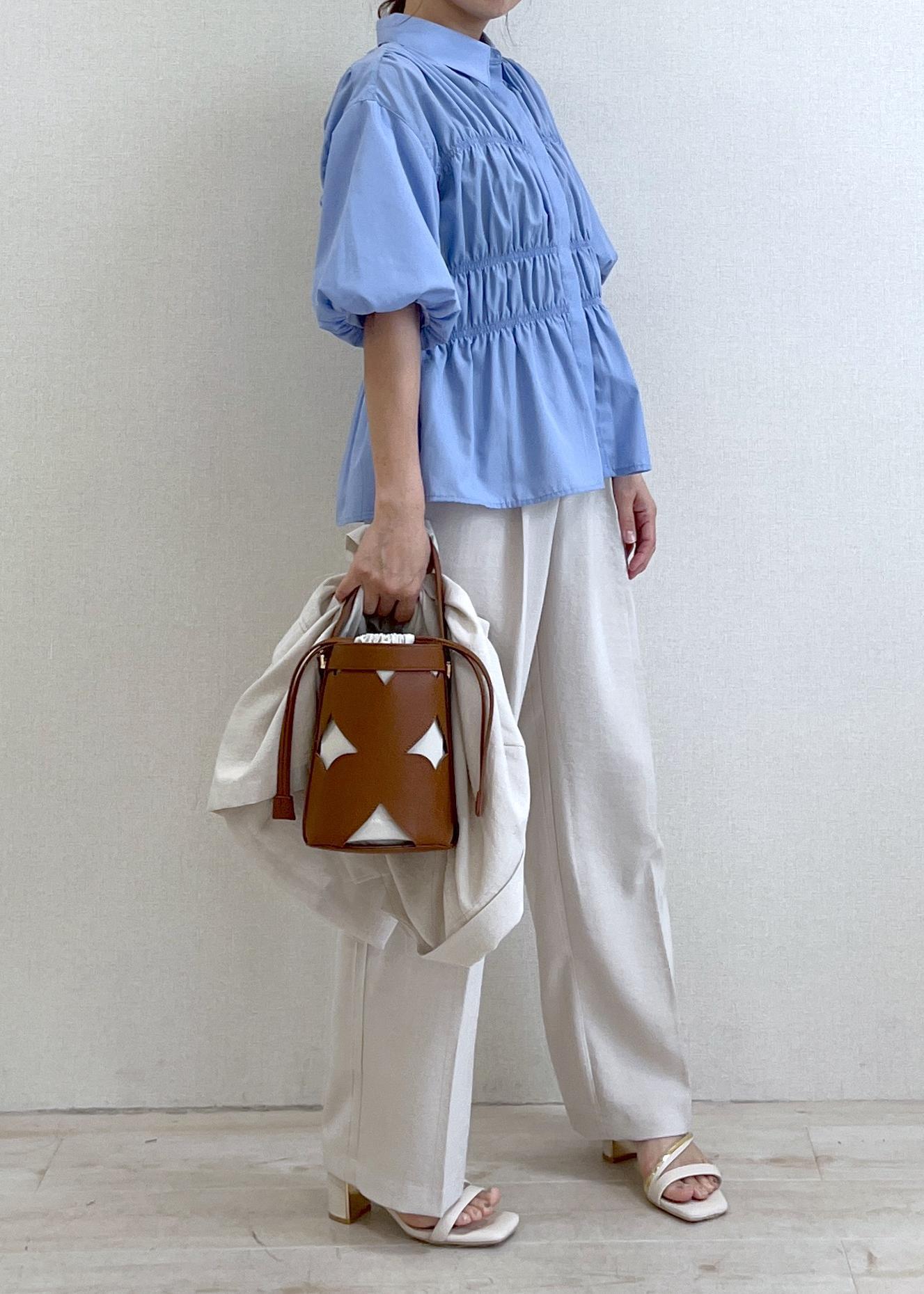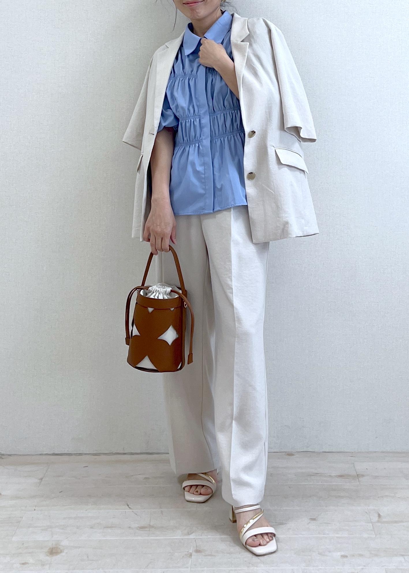 ギャザーが美しいブルーシャツに、ナチュラルな白パンツを合わせて。シルエットは華やかに、着心地は軽やかに。オンにもオフにも活躍する、きちんと感とリラックス感を両立した好印象スタイル。