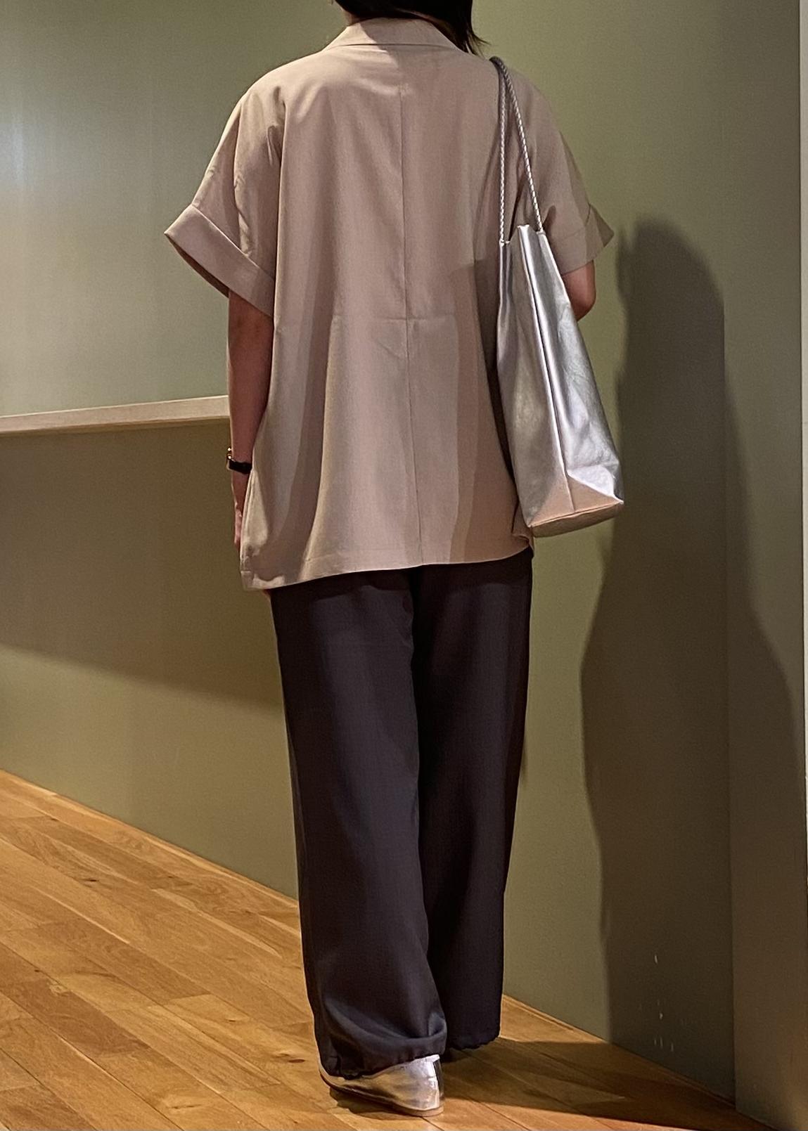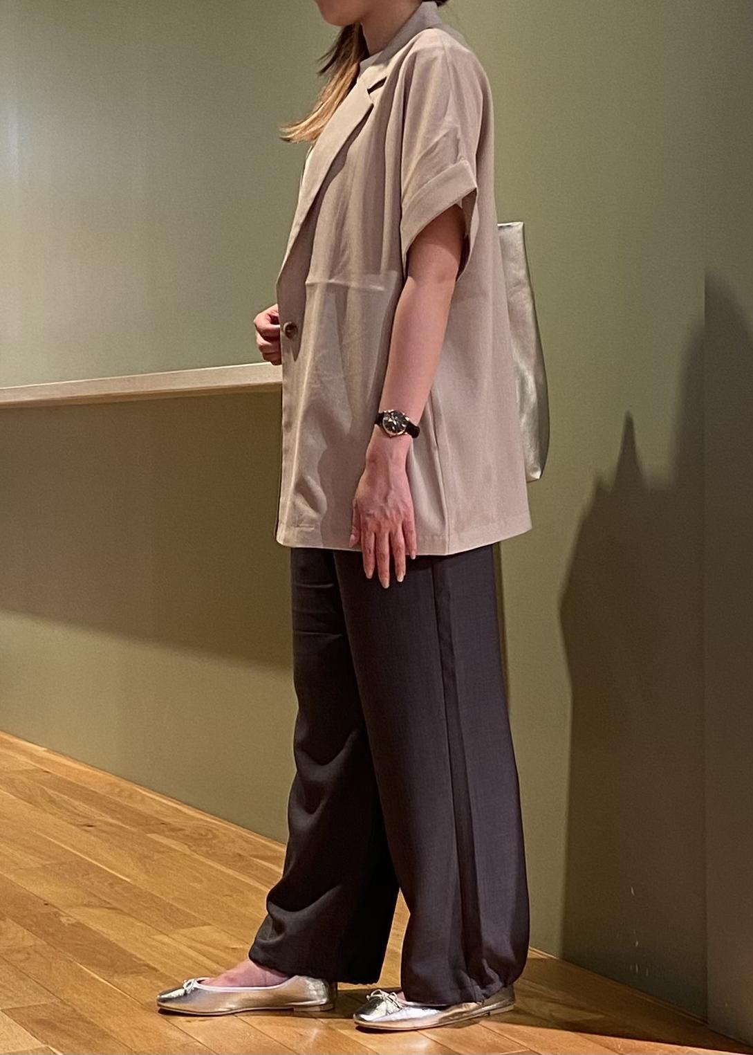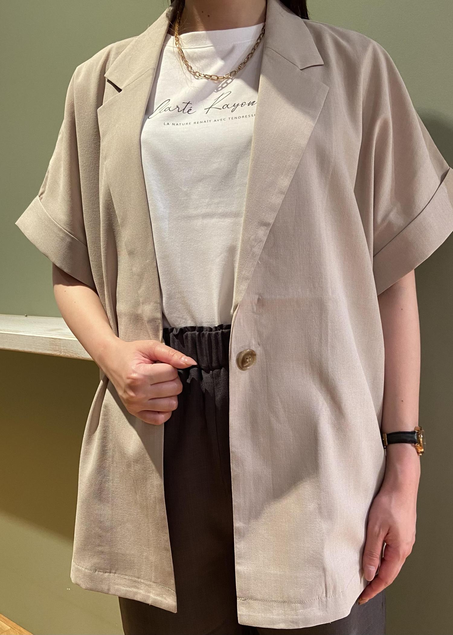ベージュのハーフスリーブジャケットにチャコールのパンツを合わせ色味を落ち着かせた大人らしいコーデにしました。