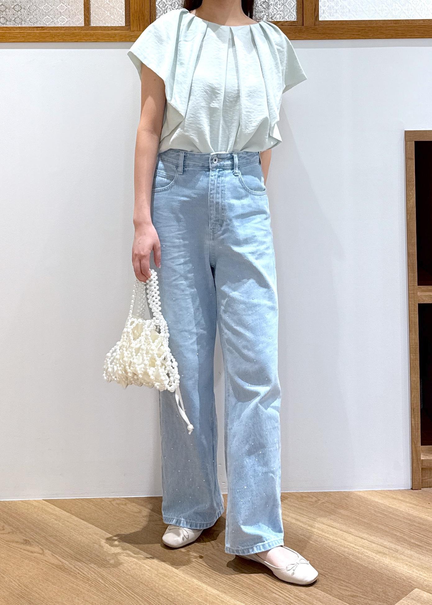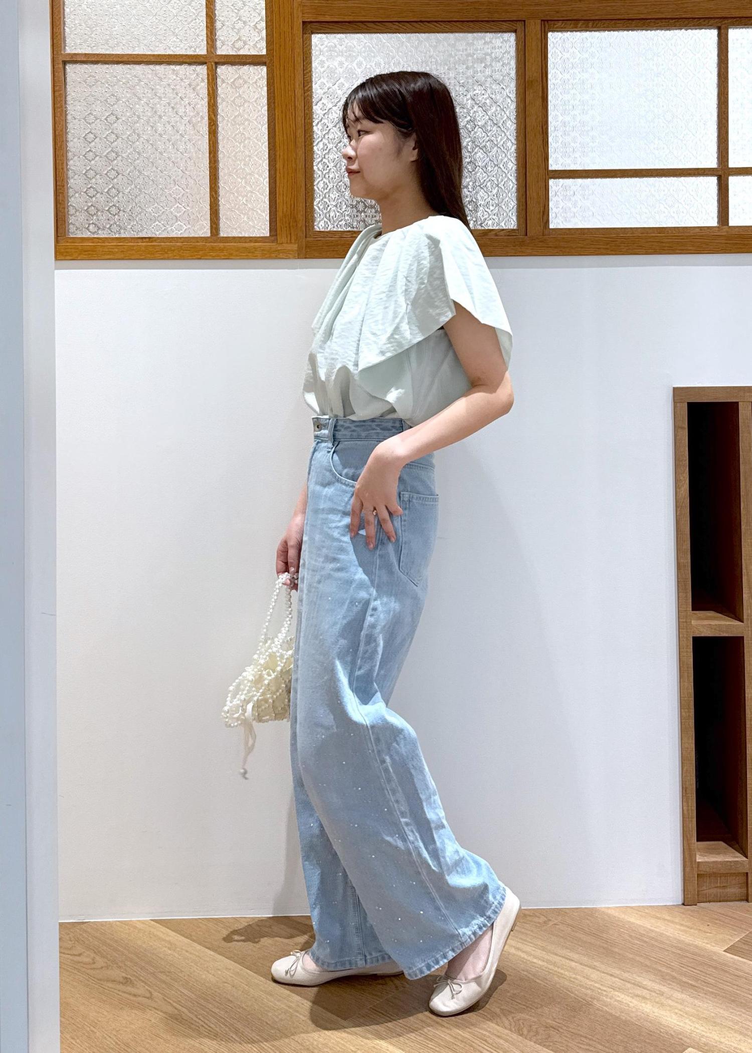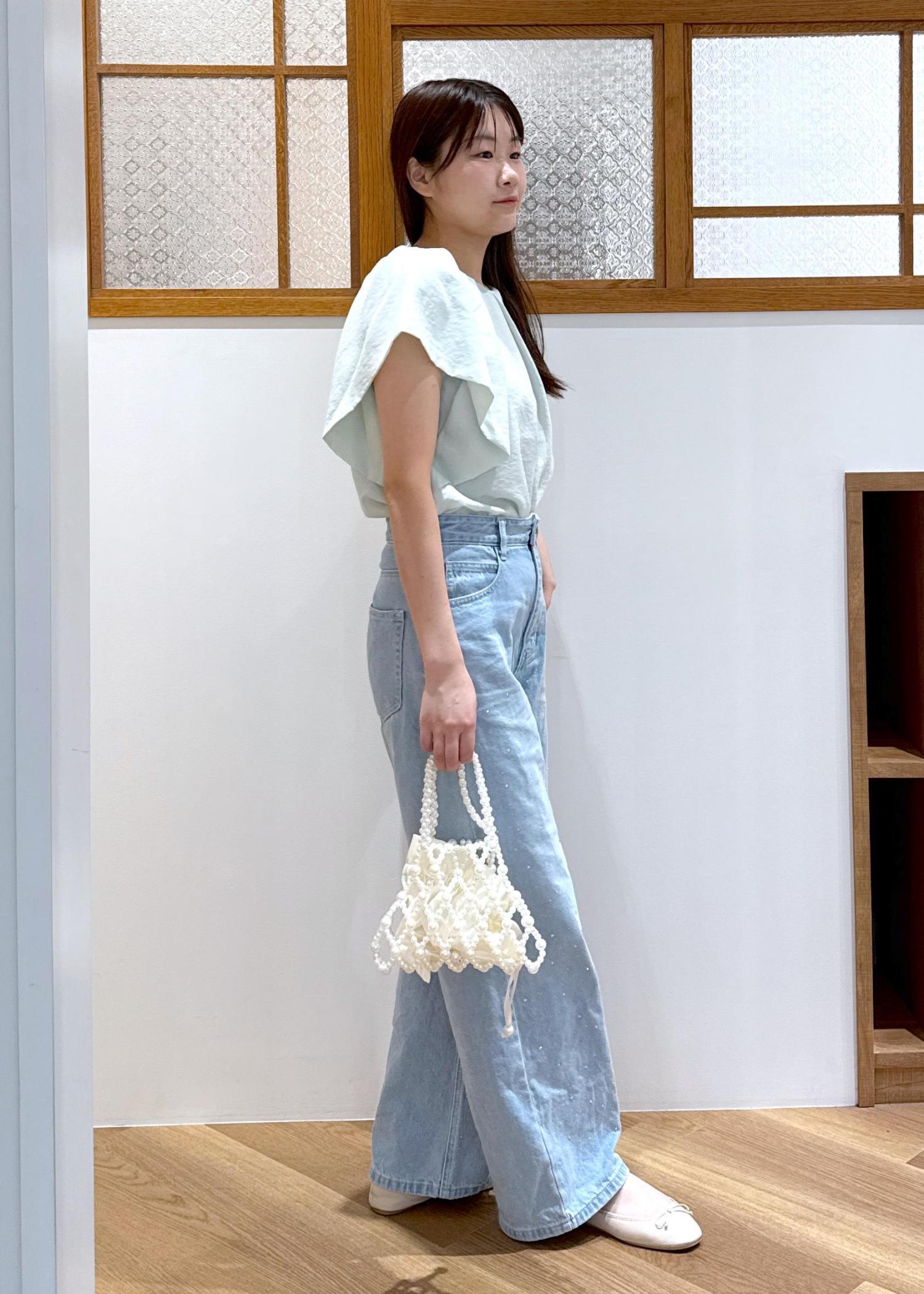 ライトグリーンの爽やかな色味のブラウスを主役に、デニムを合わせたカジュアルなコーディネートを組みました。