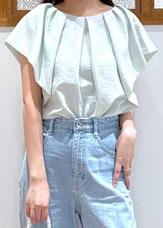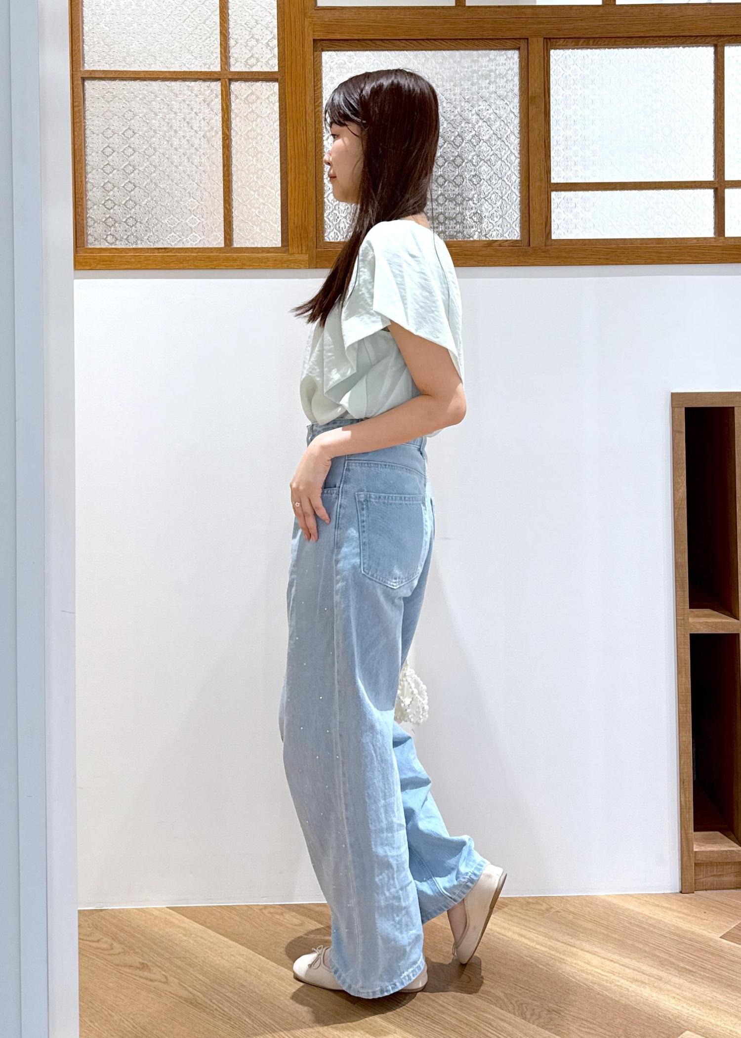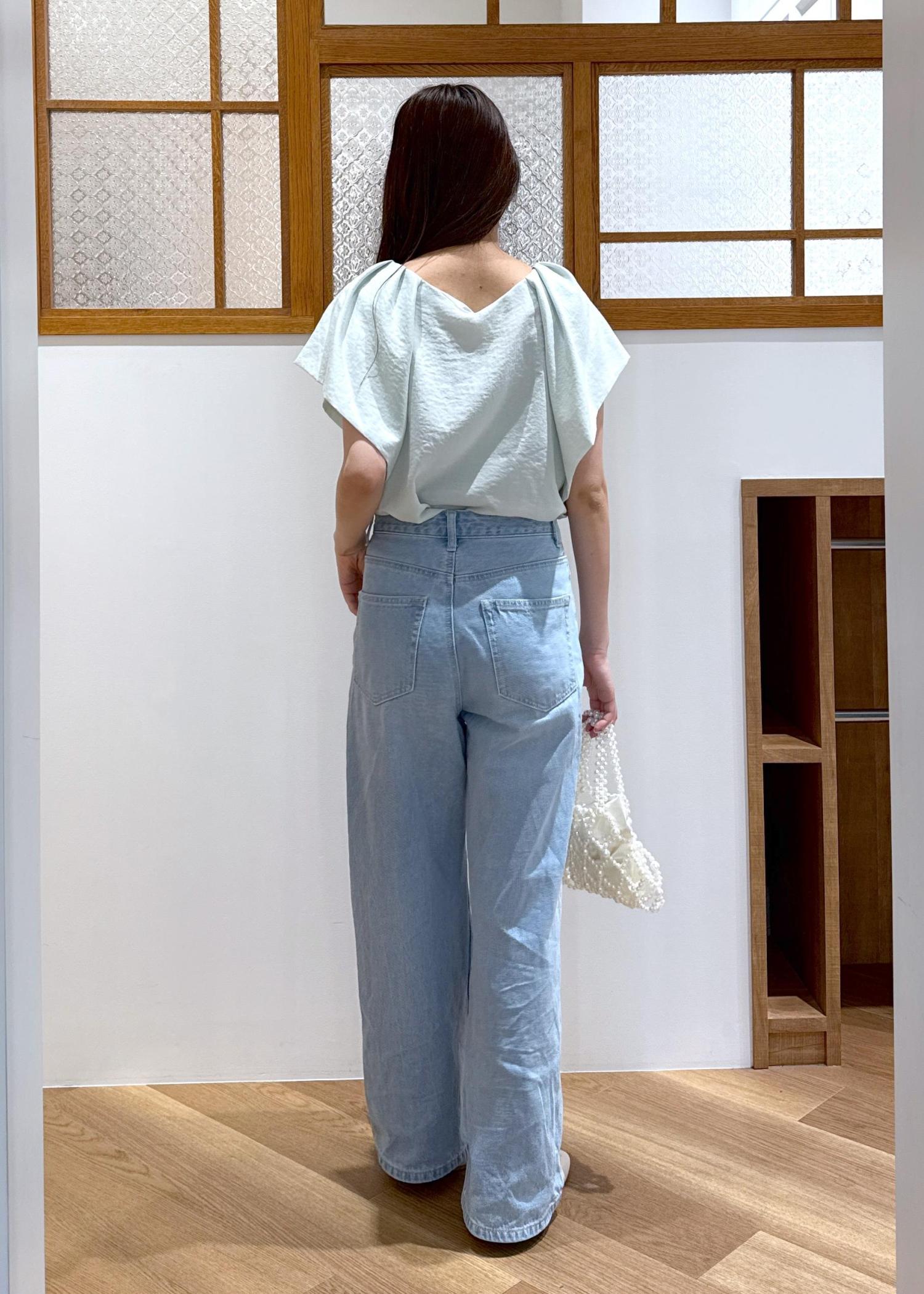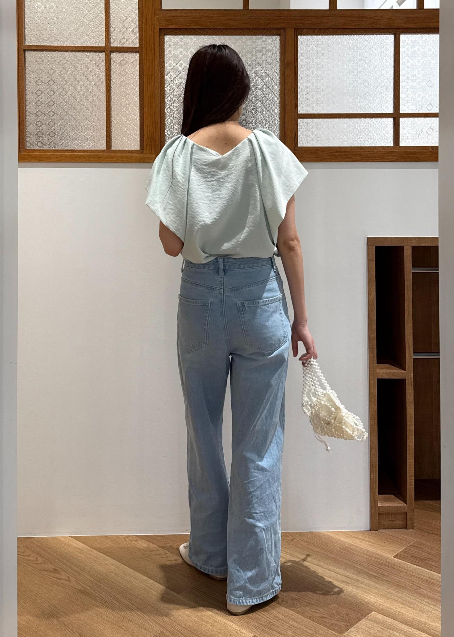 ライトグリーンの爽やかな色味のブラウスを主役に、デニムを合わせたカジュアルなコーディネートを組みました。