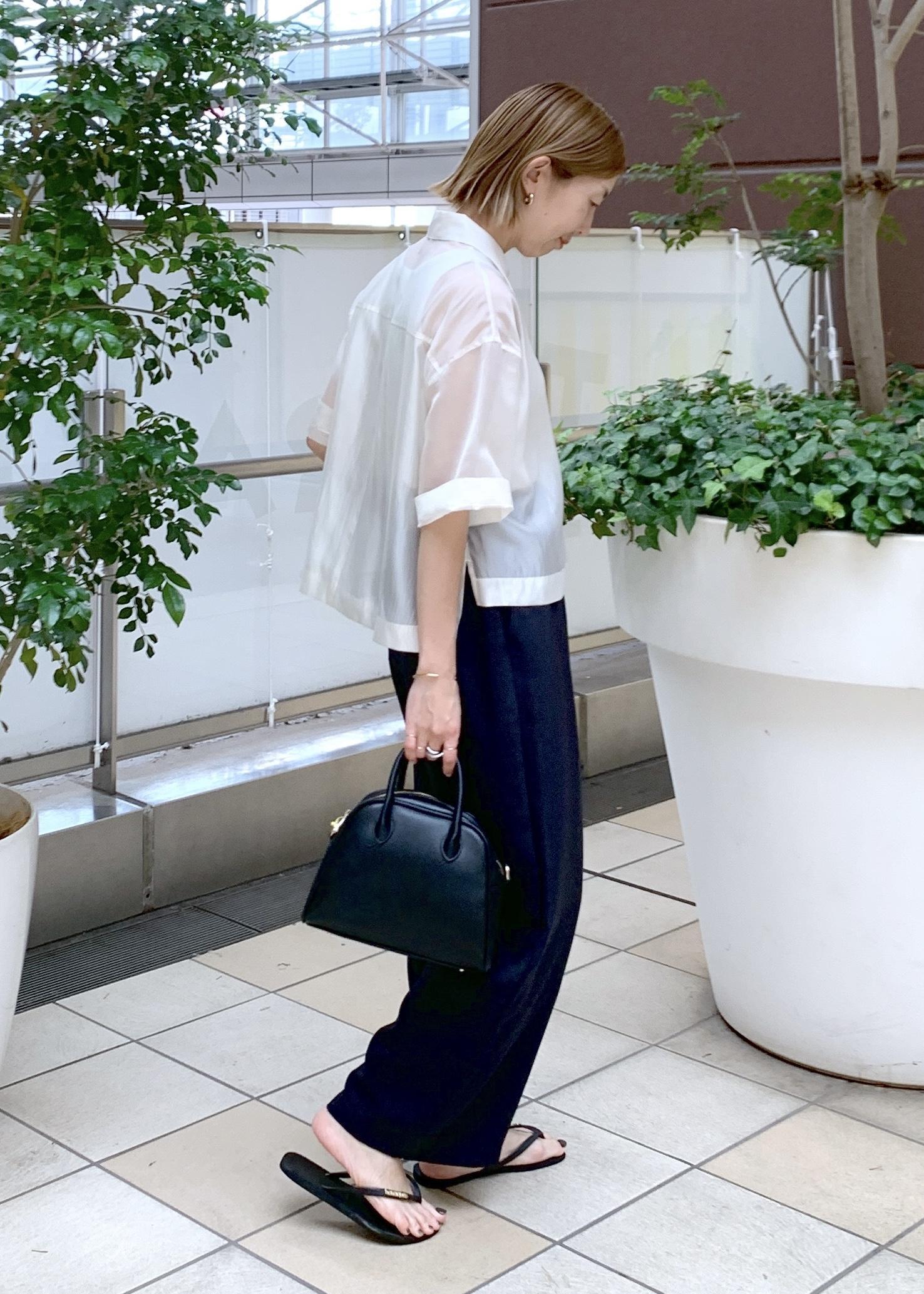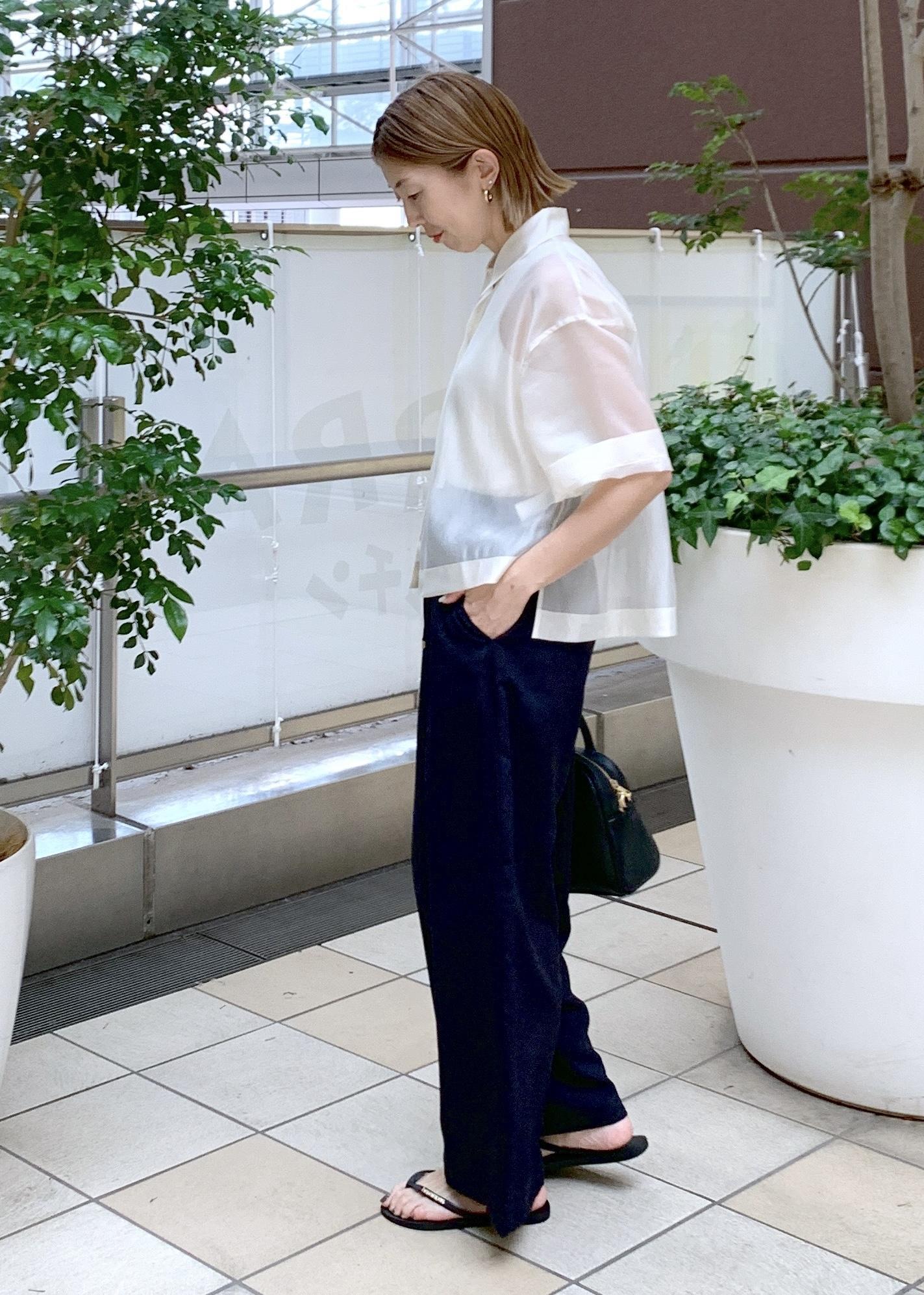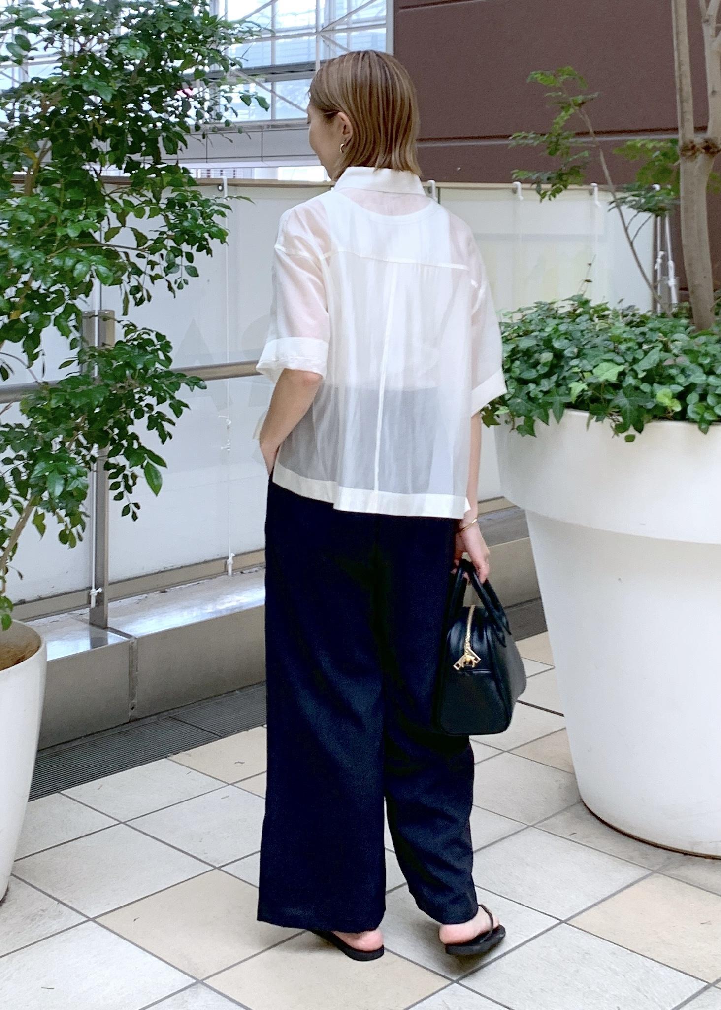 ハリのあるシアー素材で光沢感のある大人なシアーシャツ。