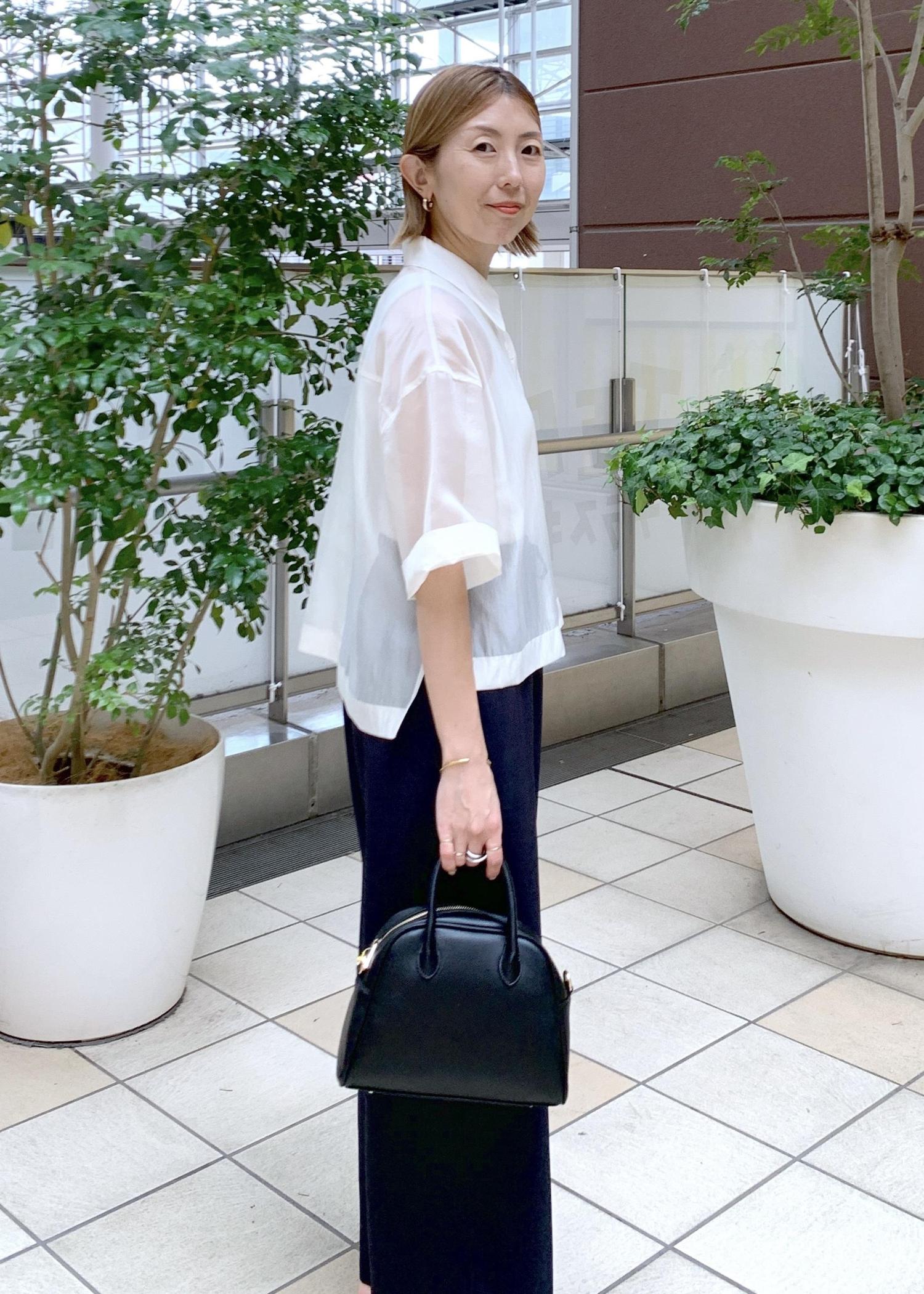 オンオフどちらのスタイリングにも持てるシンプルなバッグ。