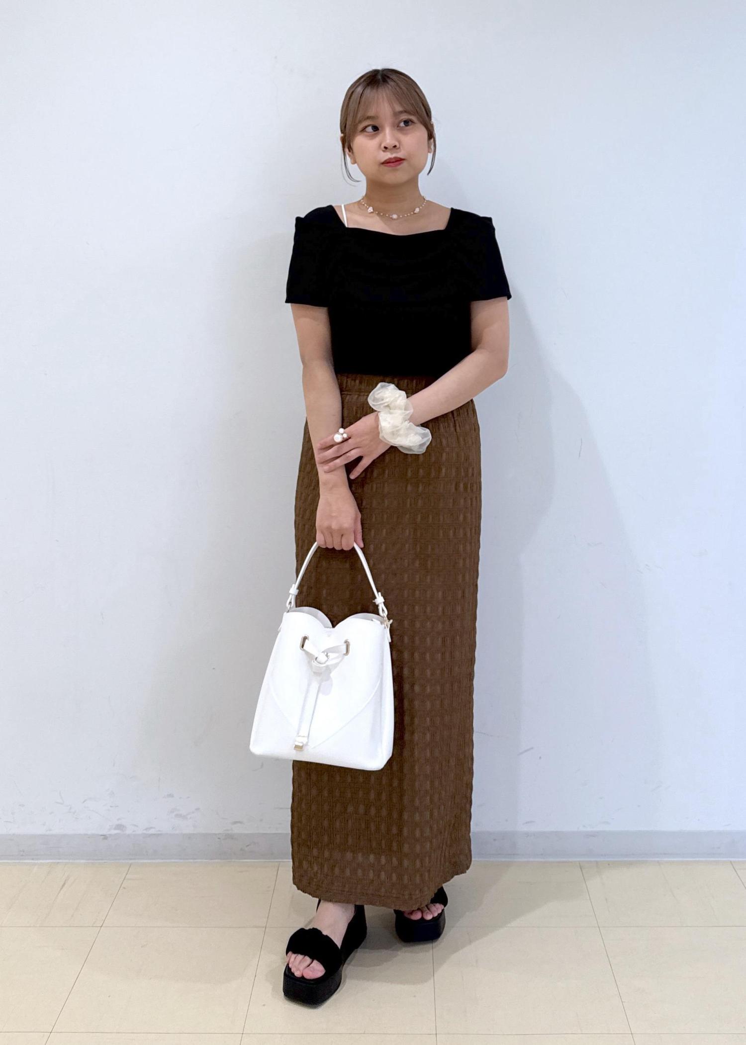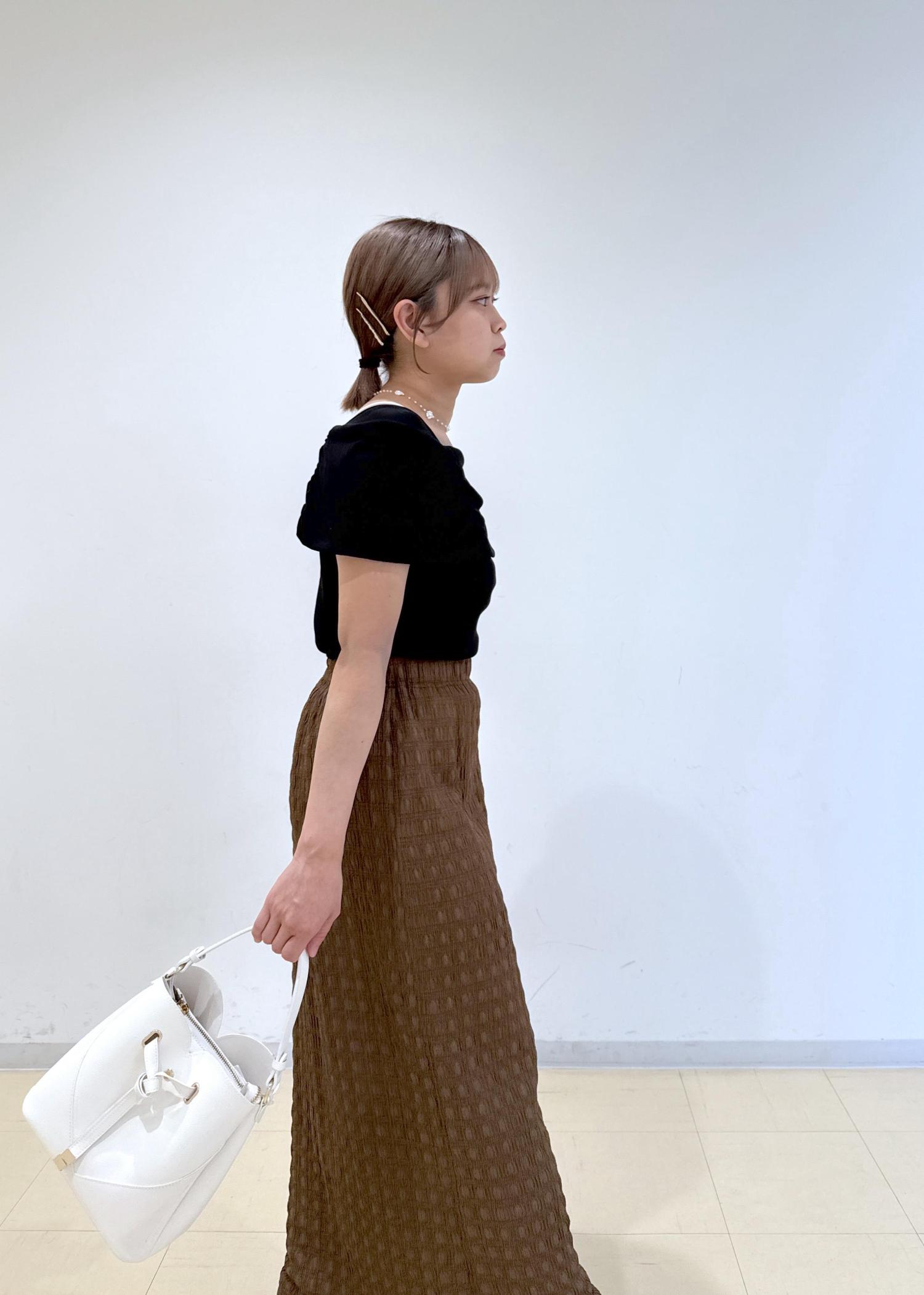 全体的に落ち着いた色味のコーデなのでバッグを明るい白色にし、ポイントになるようにしました!