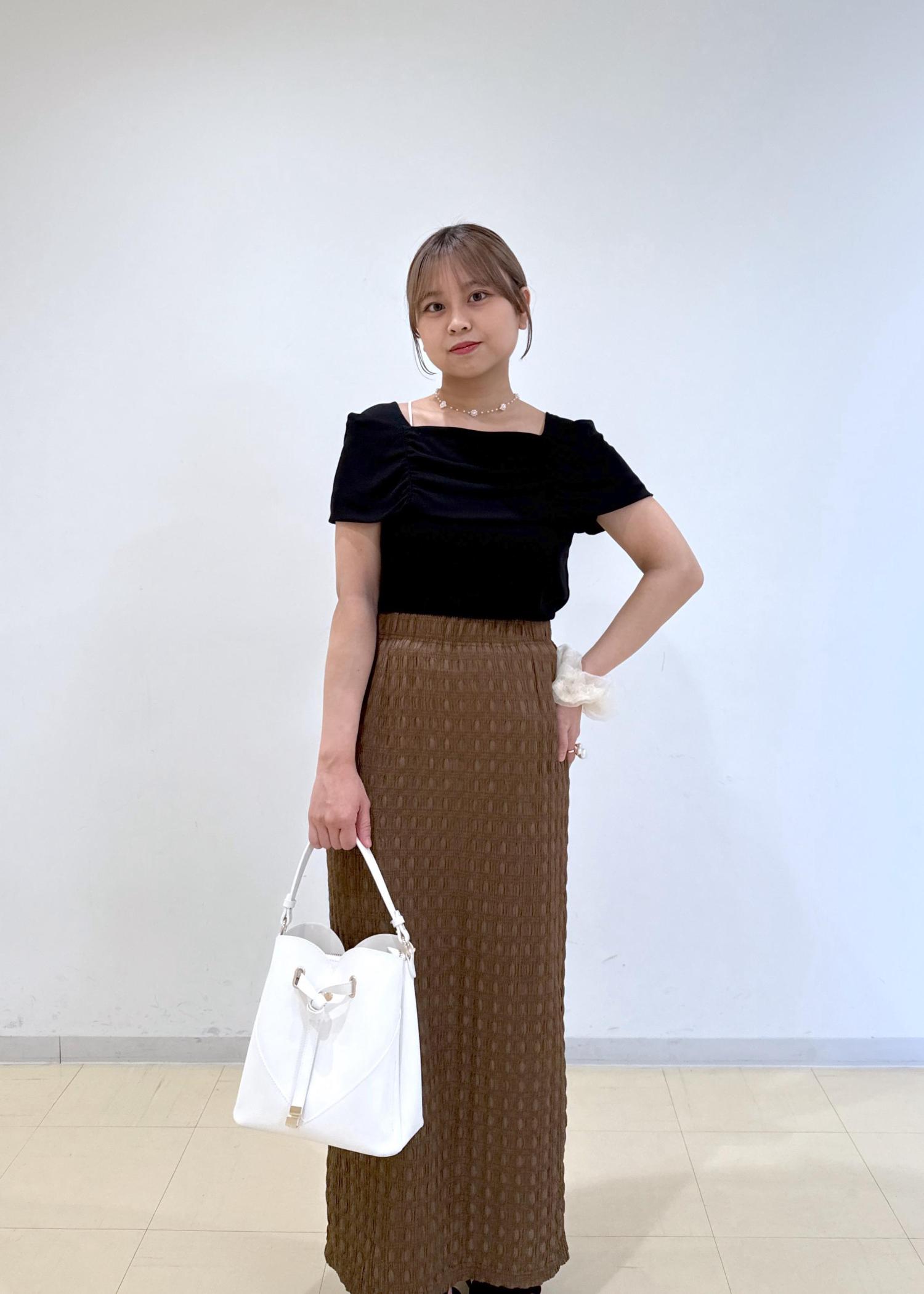 タイトスカートに、オフィショルのトップスを合わせた女性らしい大人のコーディネートにしました♪