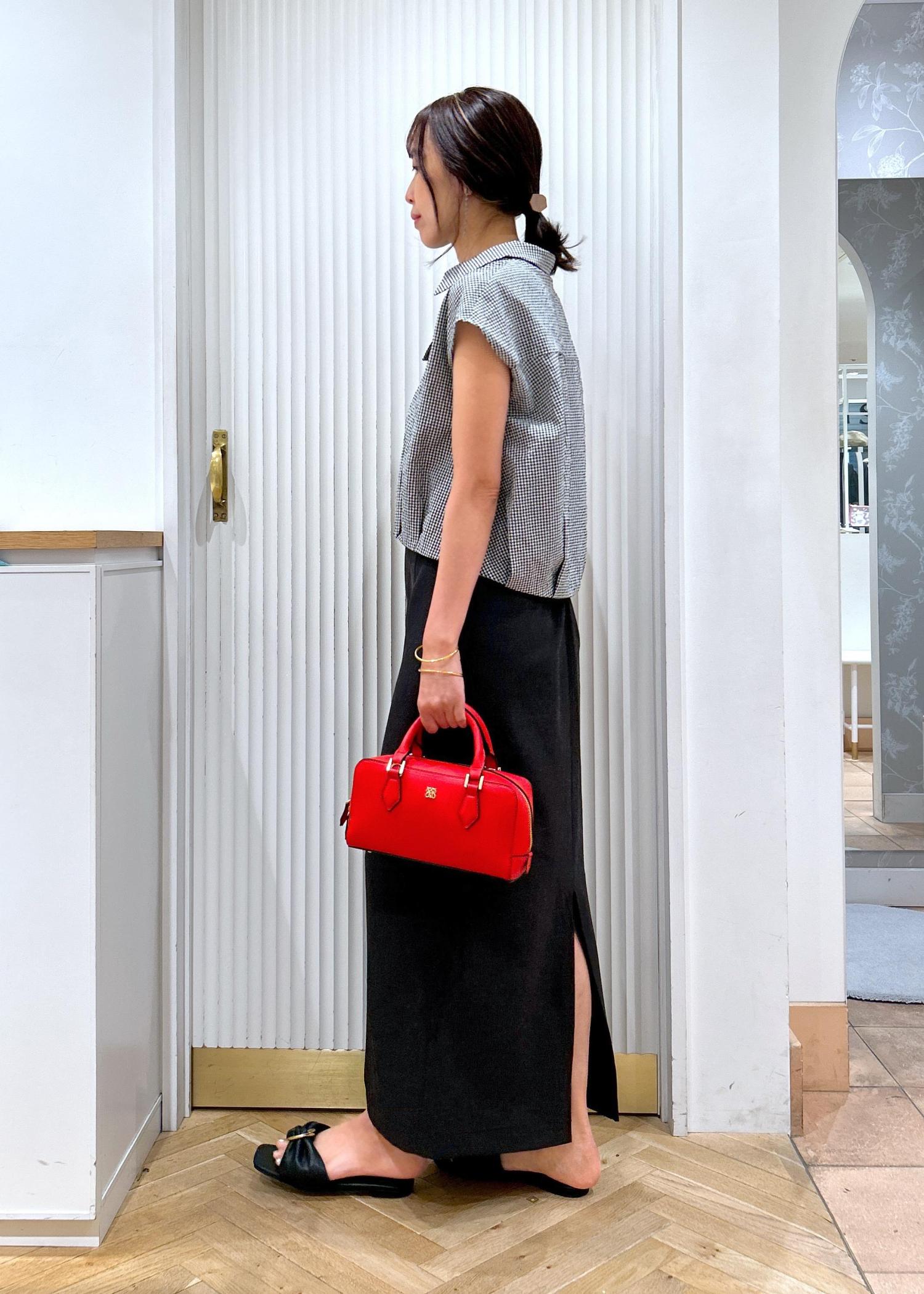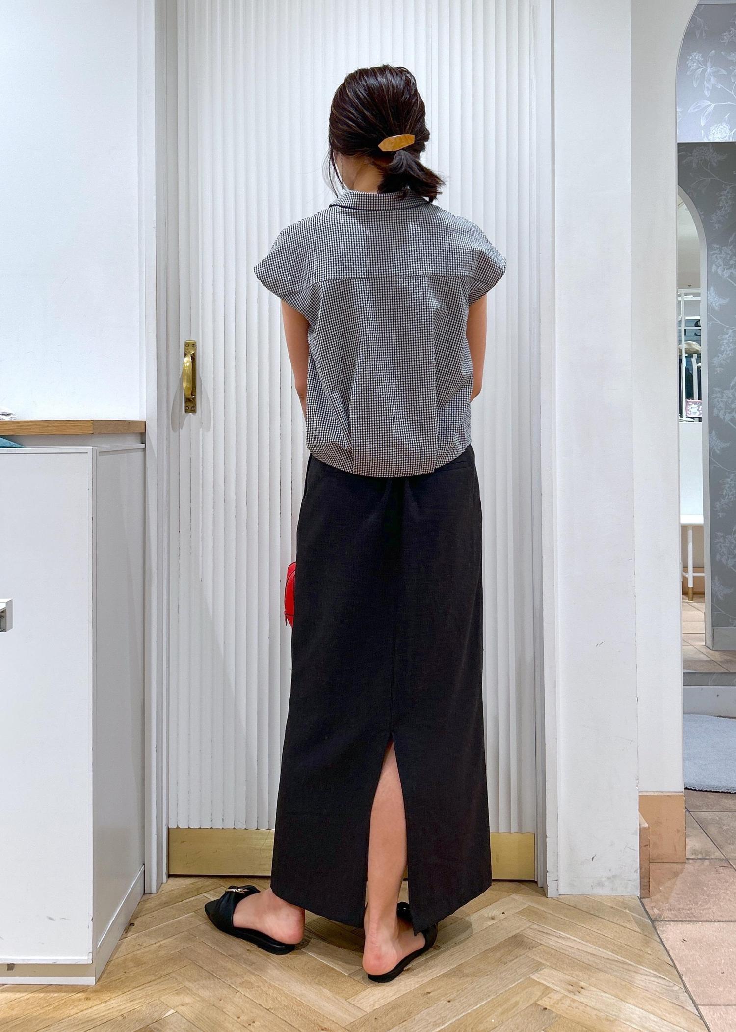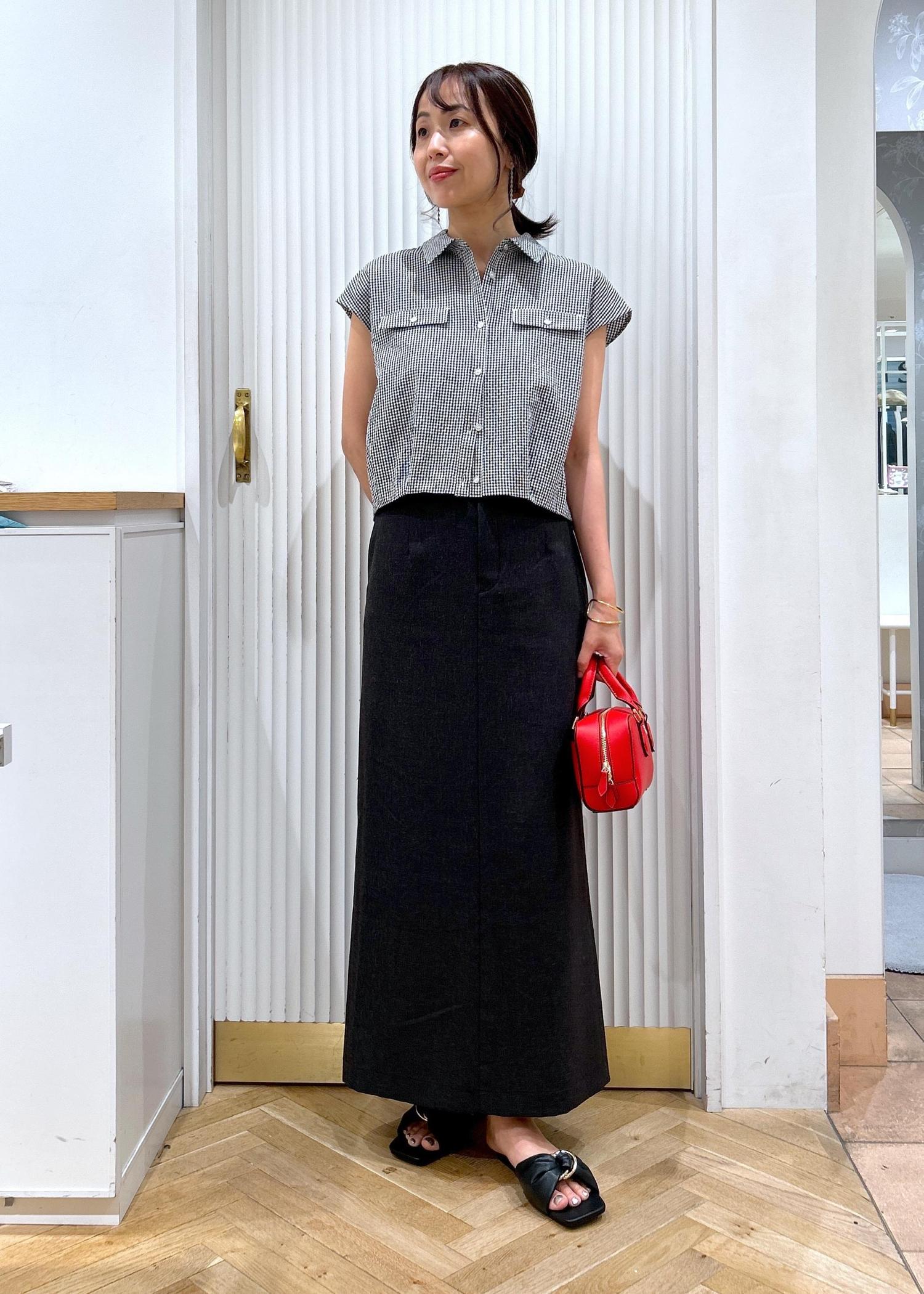ギンガムチェックのサッカーシャツにタイトスカートを合わせた、Iラインスタイリングです。