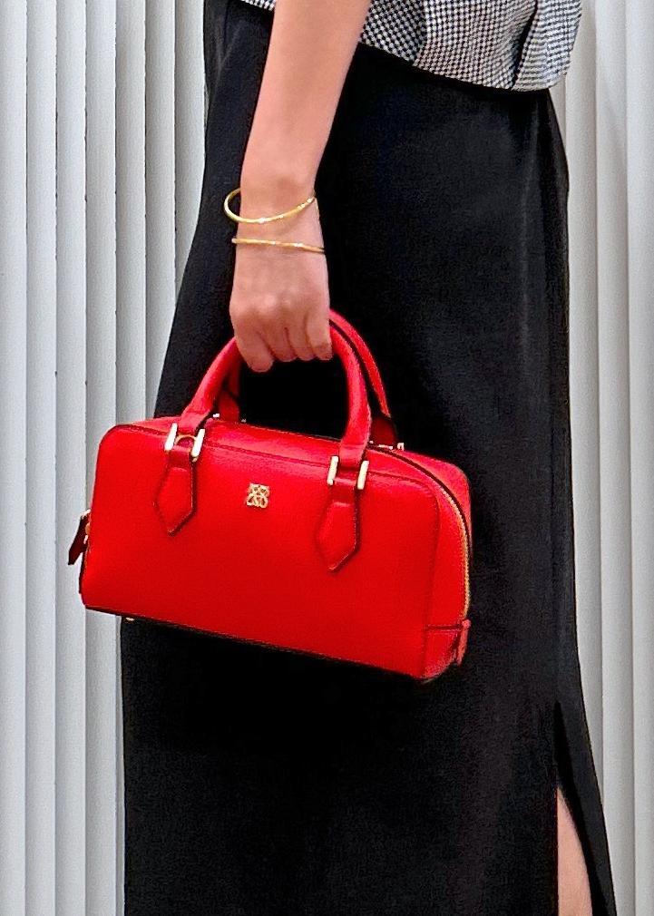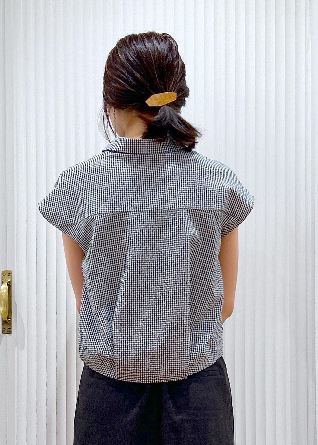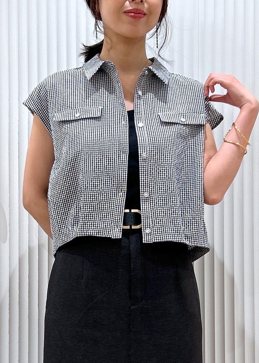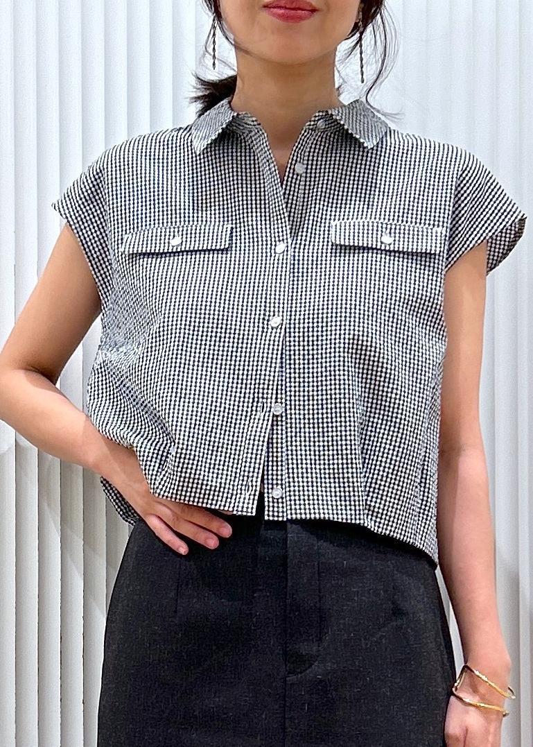 ギンガムチェックのサッカーシャツにタイトスカートを合わせた、Iラインスタイリングです。