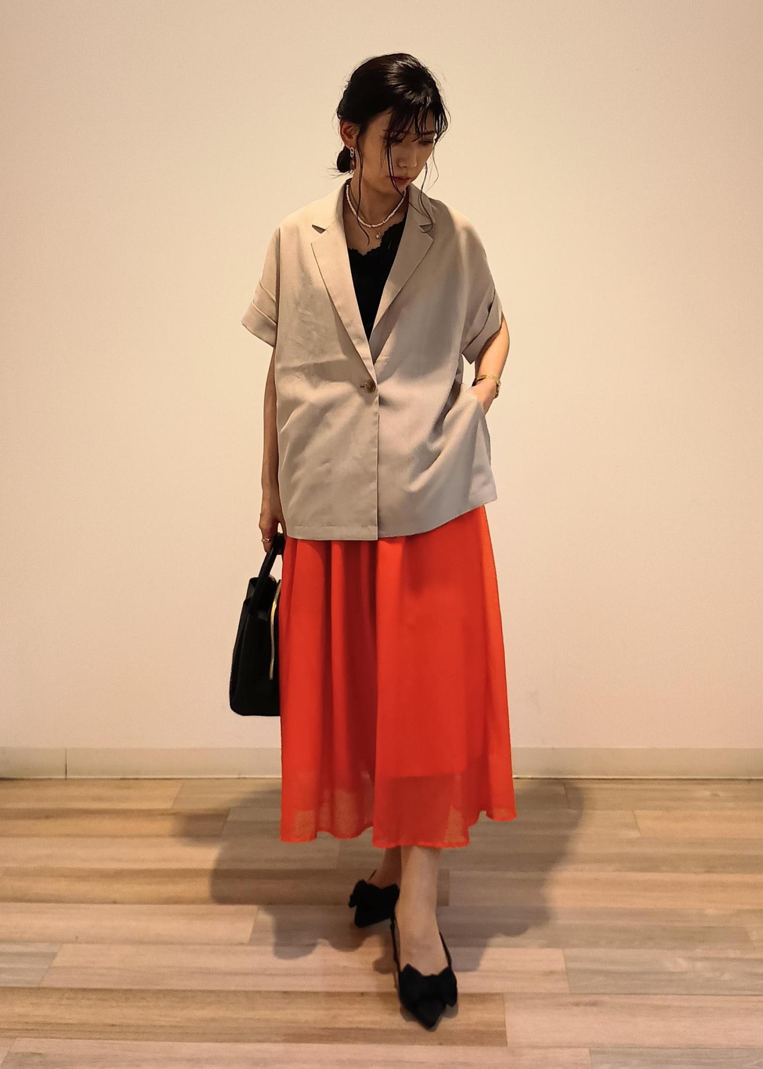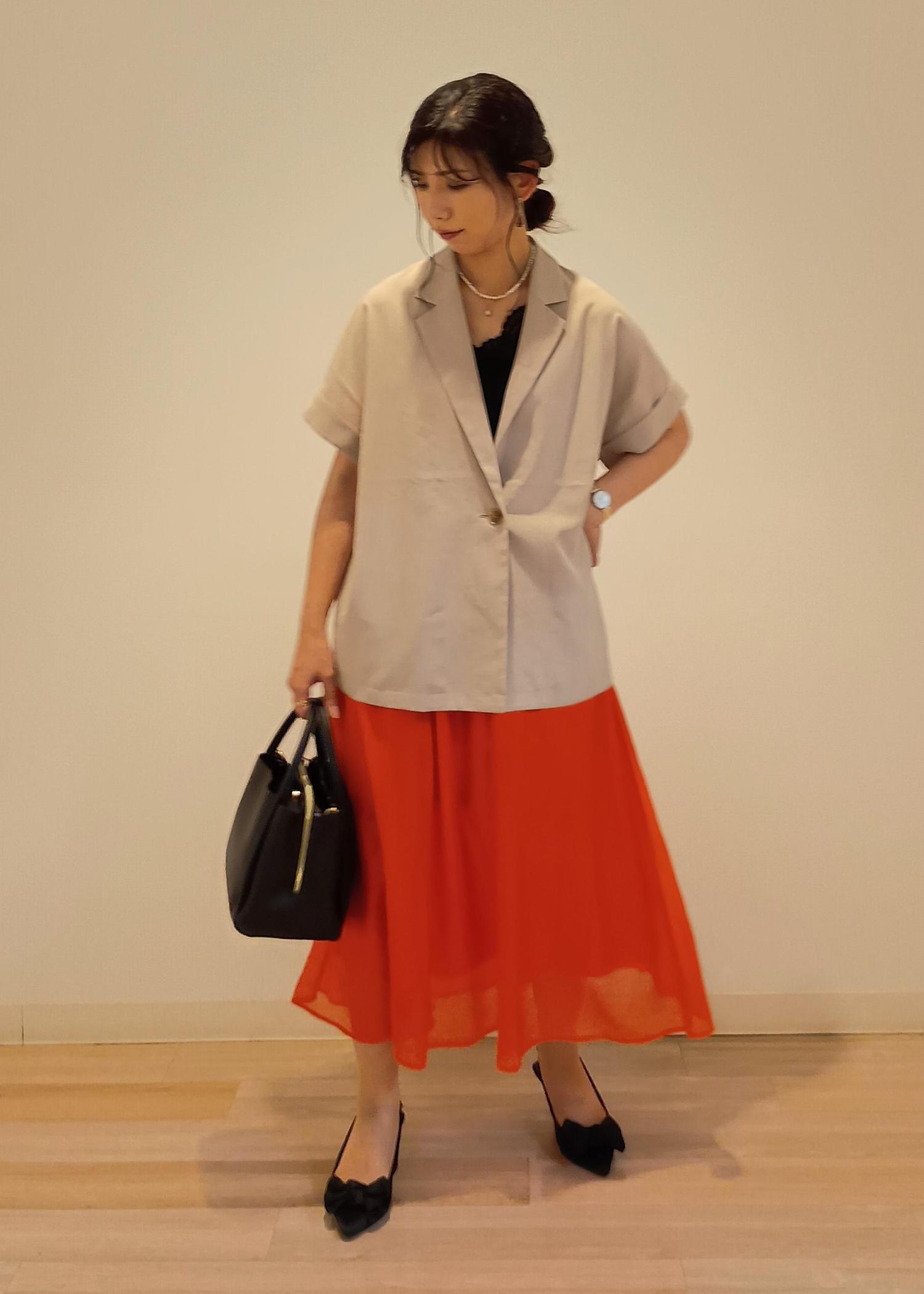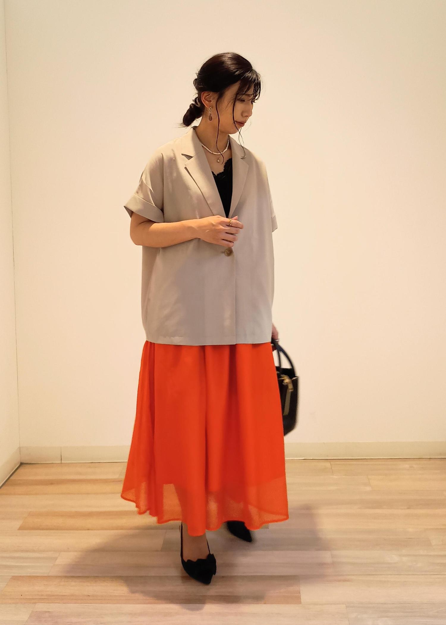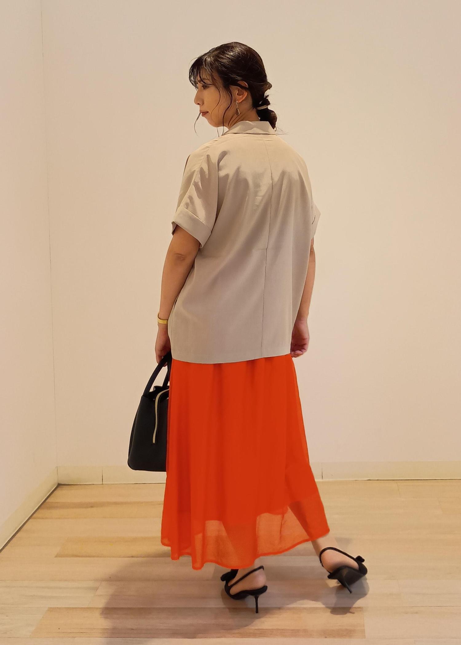 鮮やかなオレンジが映える大人っぽさのあるきれいめカジュアルコーデ。軽く涼しく着心地の良さにもこだわったスタイリングになっています。夏場のお出かけに、おすすめのコーディネートです。