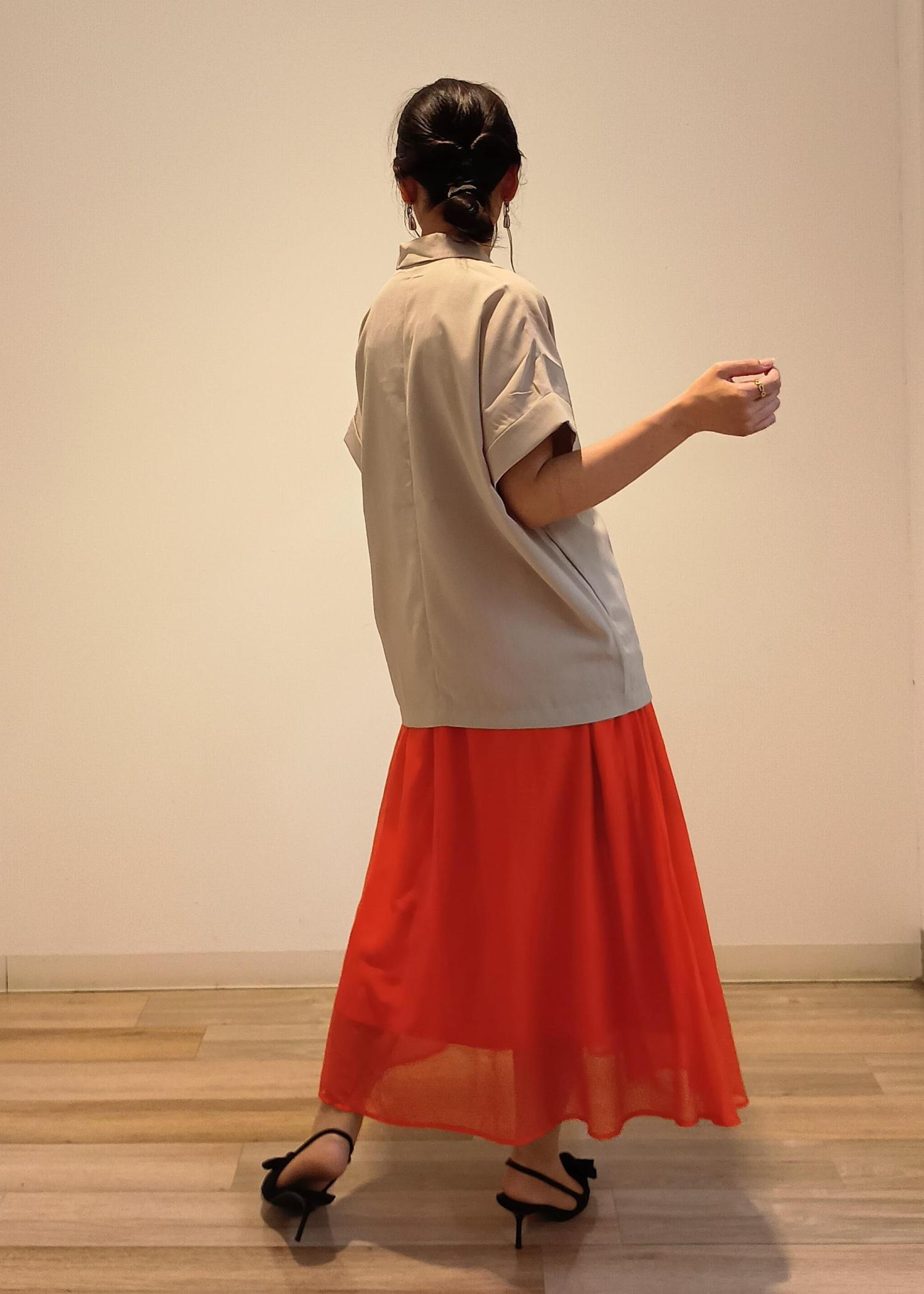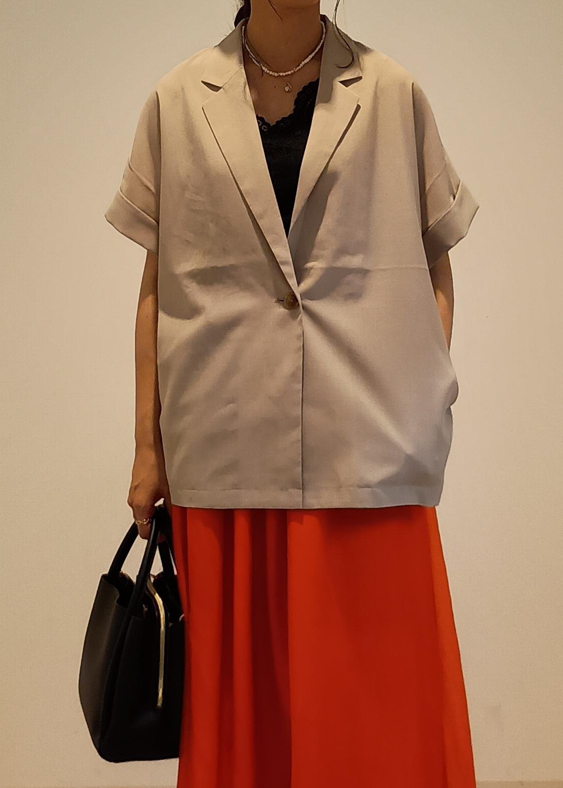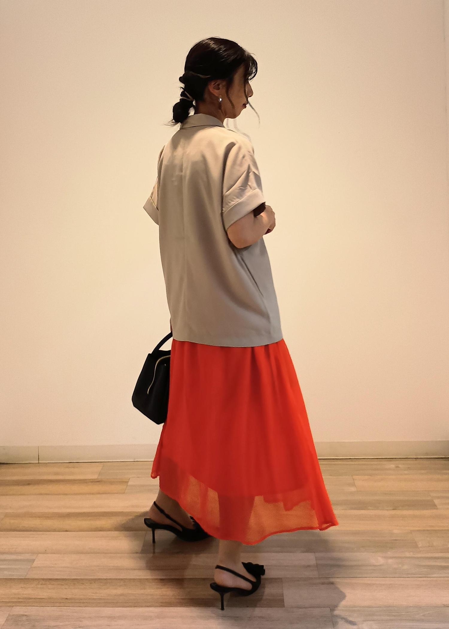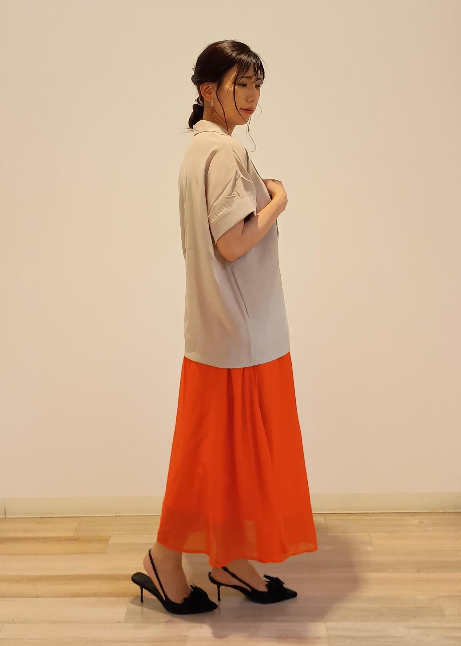 鮮やかなオレンジが映える大人っぽさのあるきれいめカジュアルコーデ。軽く涼しく着心地の良さにもこだわったスタイリングになっています。夏場のお出かけに、おすすめのコーディネートです。