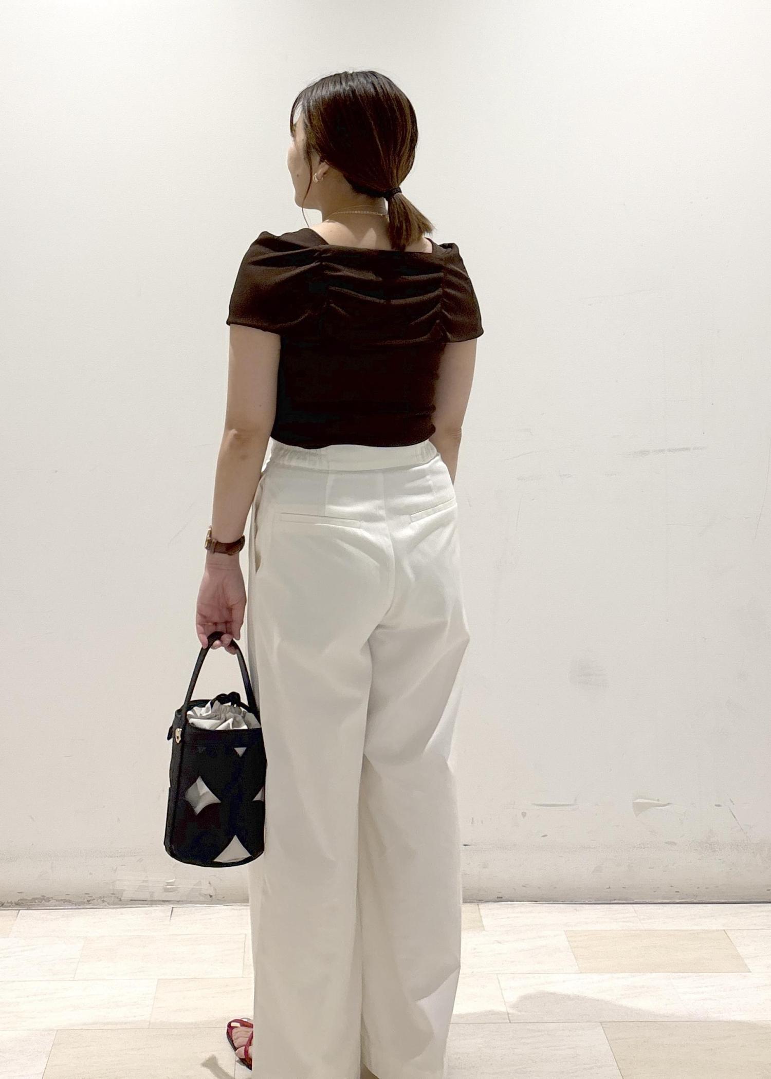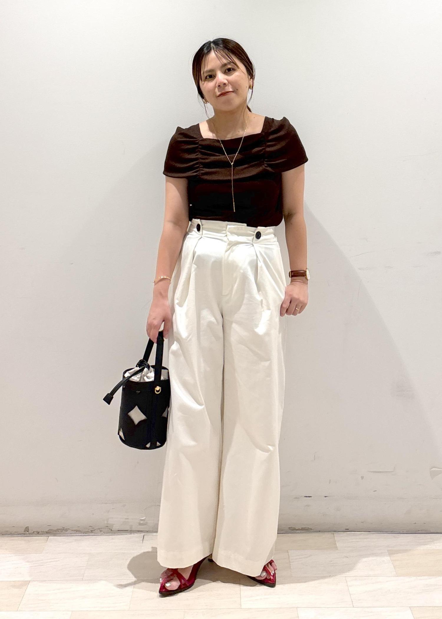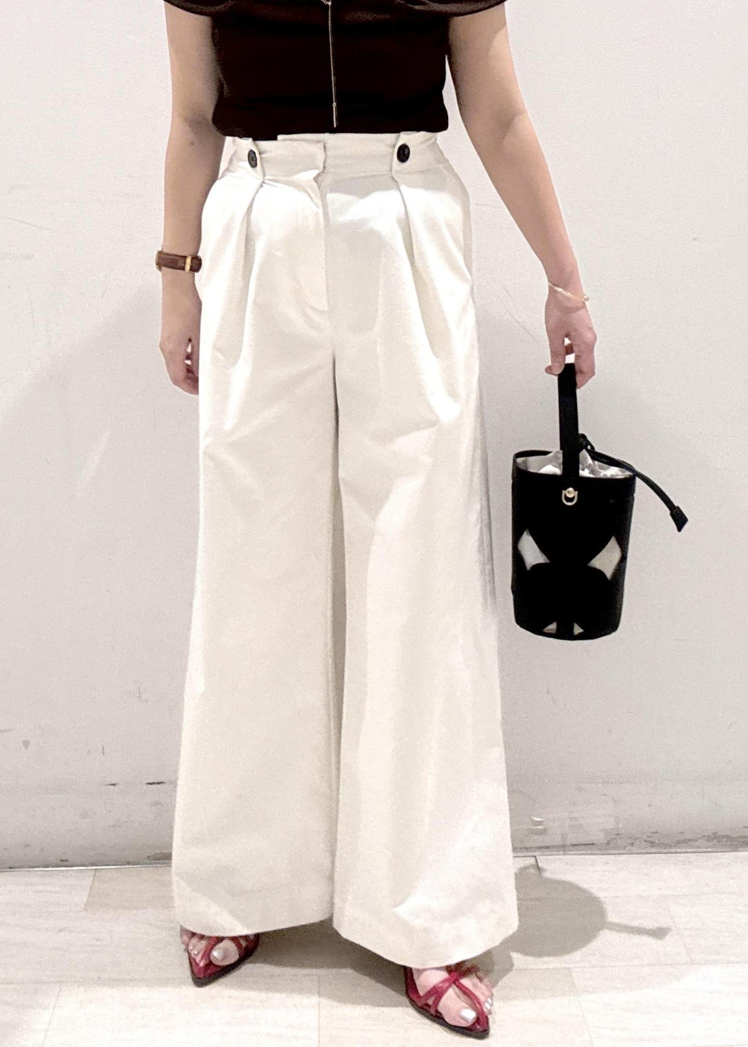 フロントボタンのマリンテイストなパンツはカジュアルにもキレイめにも合わせやすい素材です。