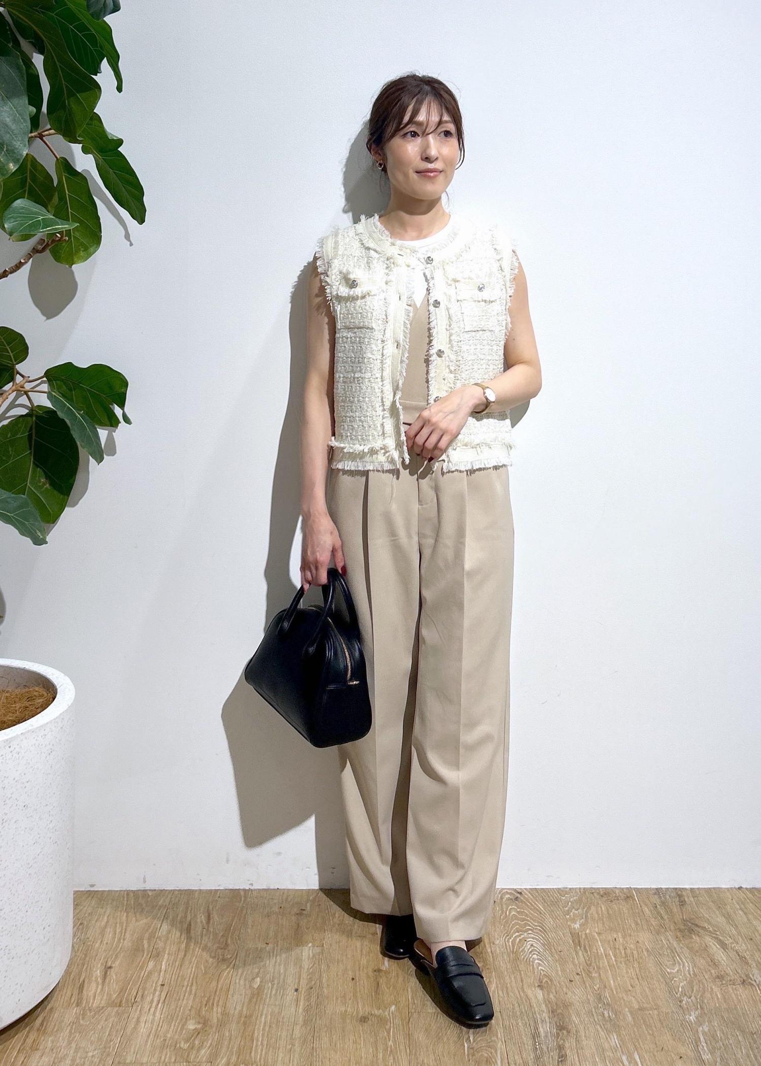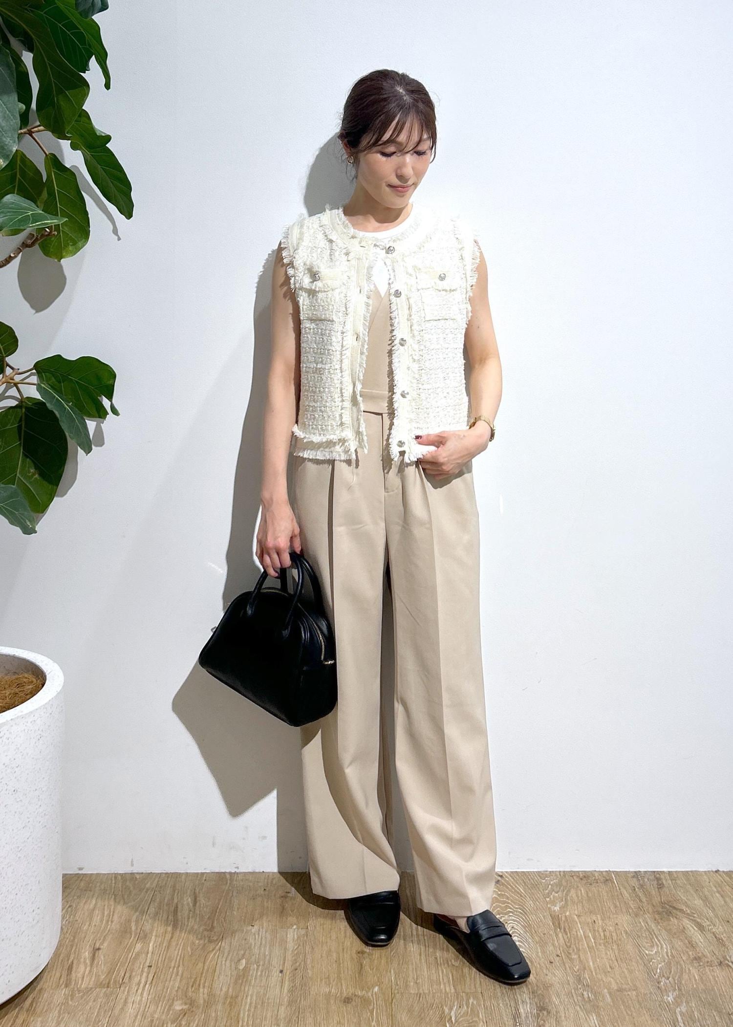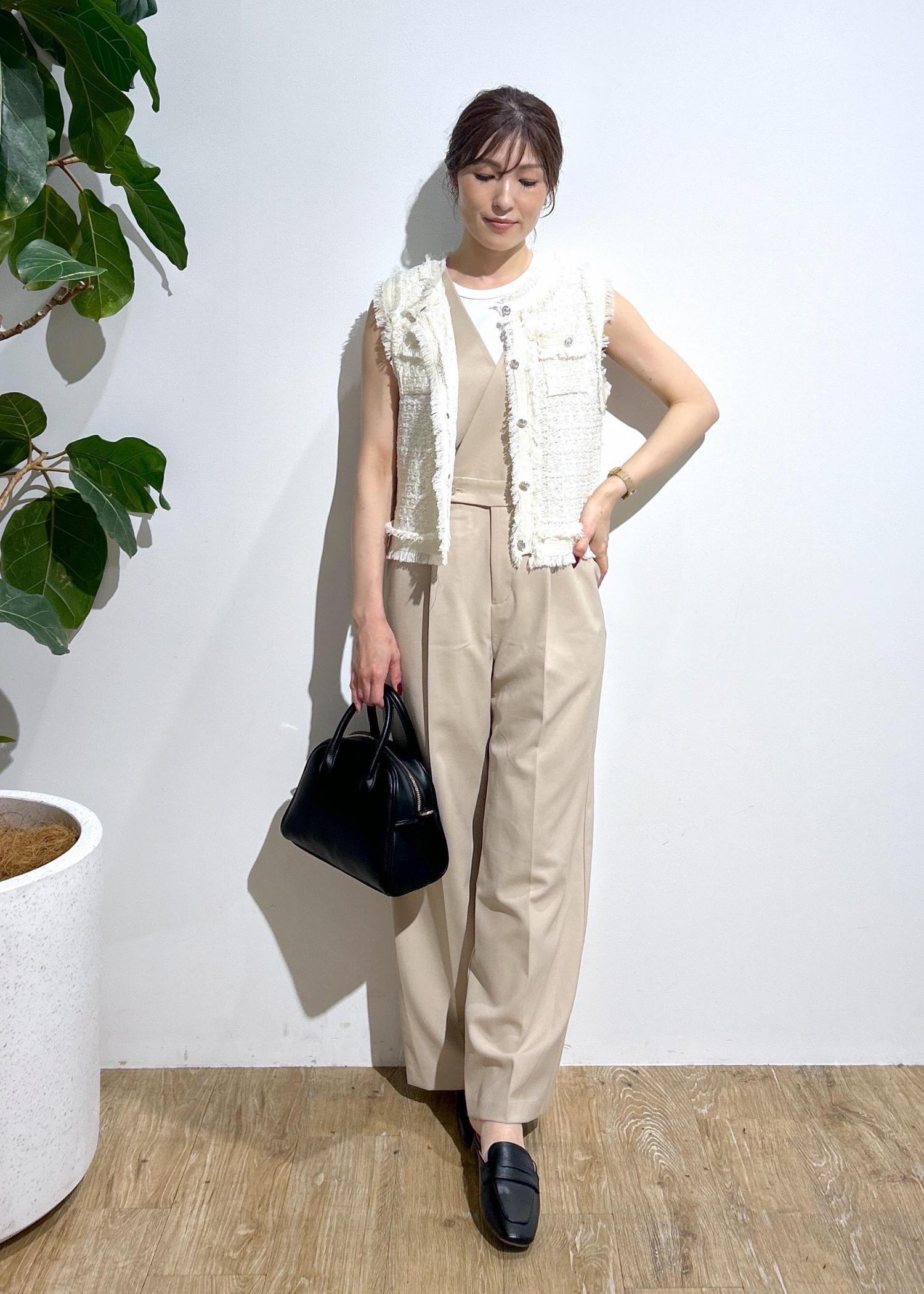 シンプルなオールインワンにツイードジレを羽織りキレイめにコーディネートしました。