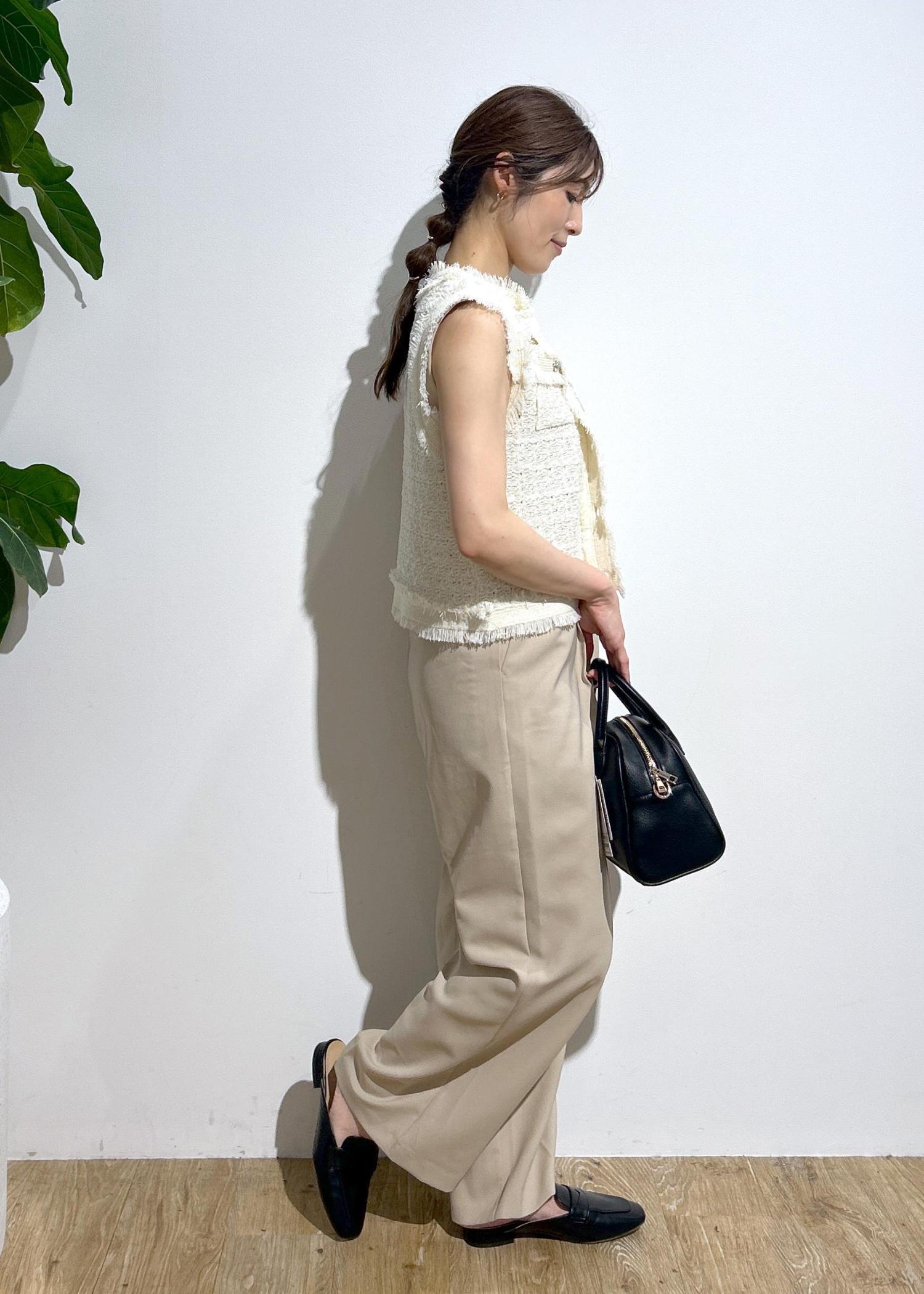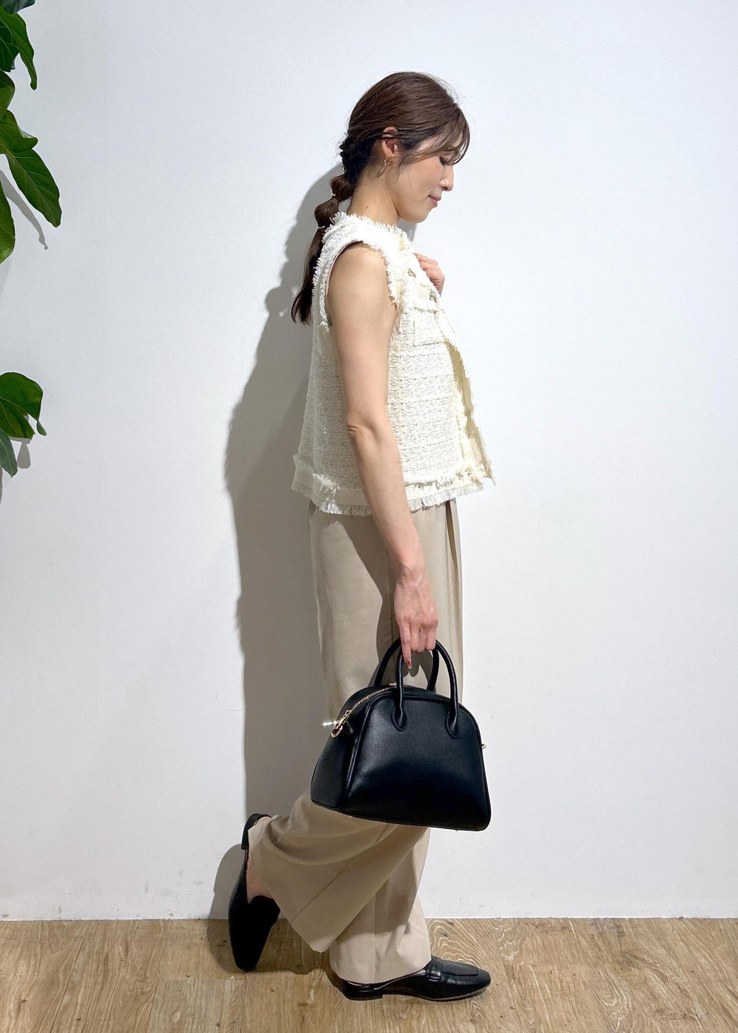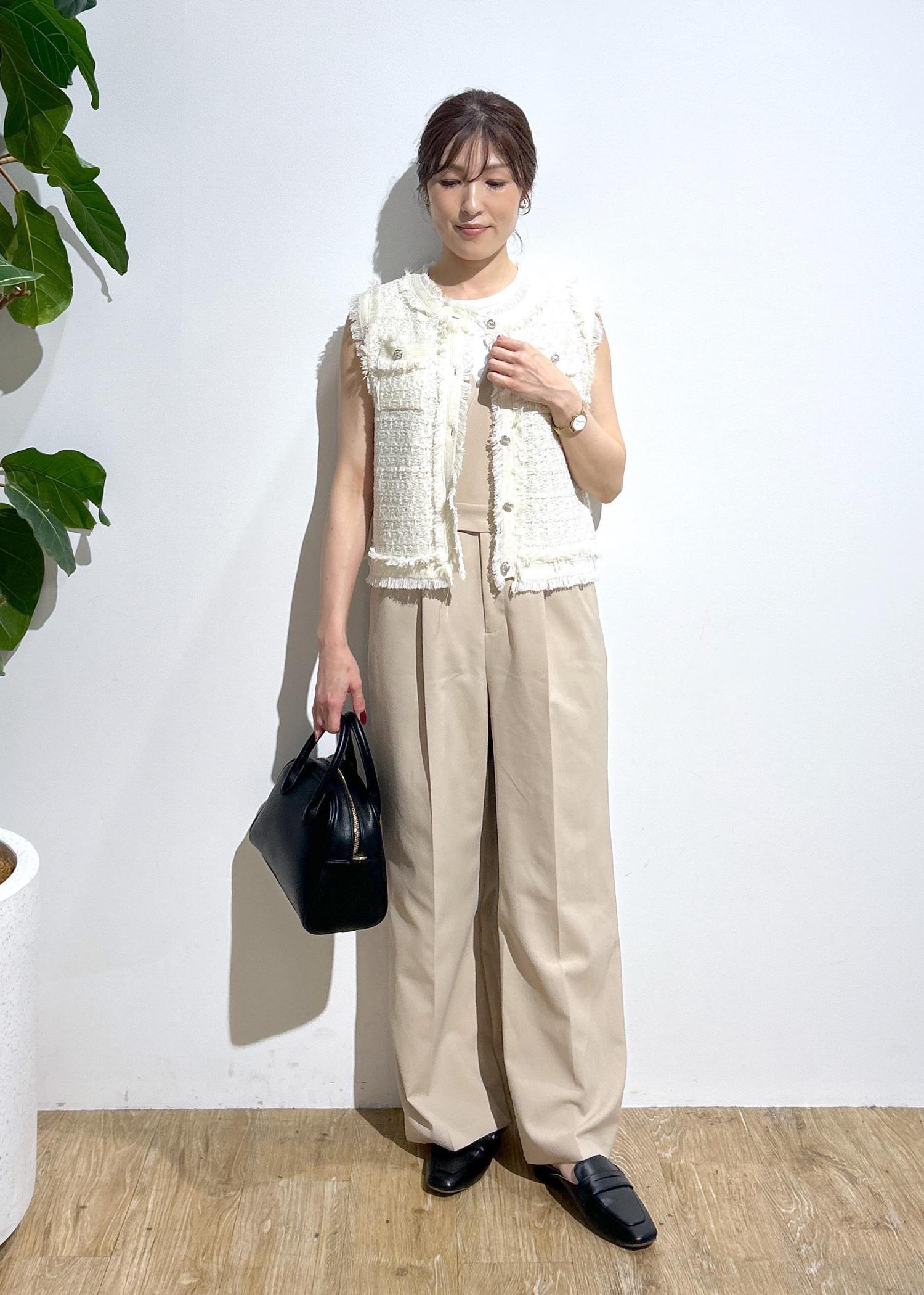 シンプルなオールインワンにツイードジレを羽織りキレイめにコーディネートしました。