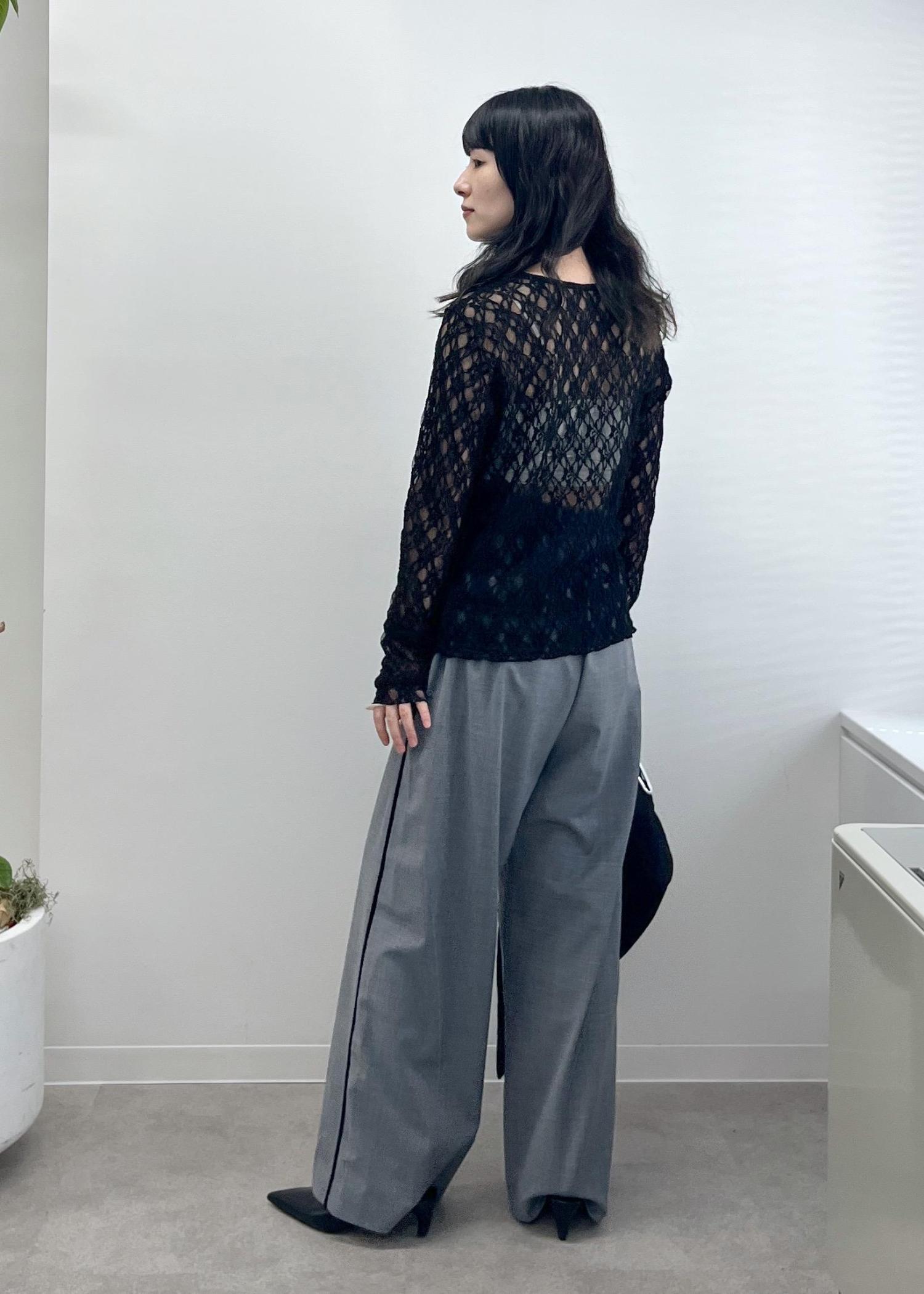 ベロア素材のサイドラインがスポーティーさを兼ね備えつつ、機能性ある素材のパンツです。きちんと感のあるスタイルにも合います◎