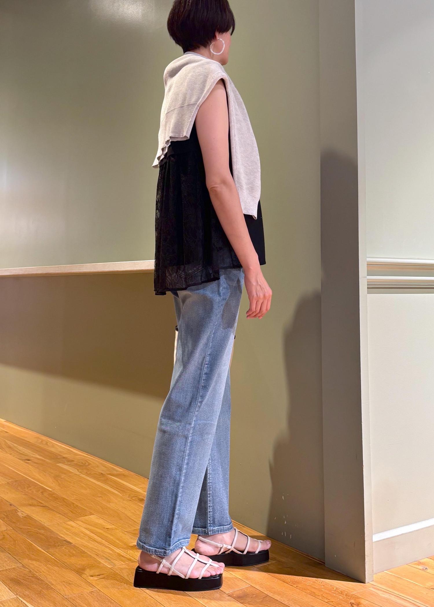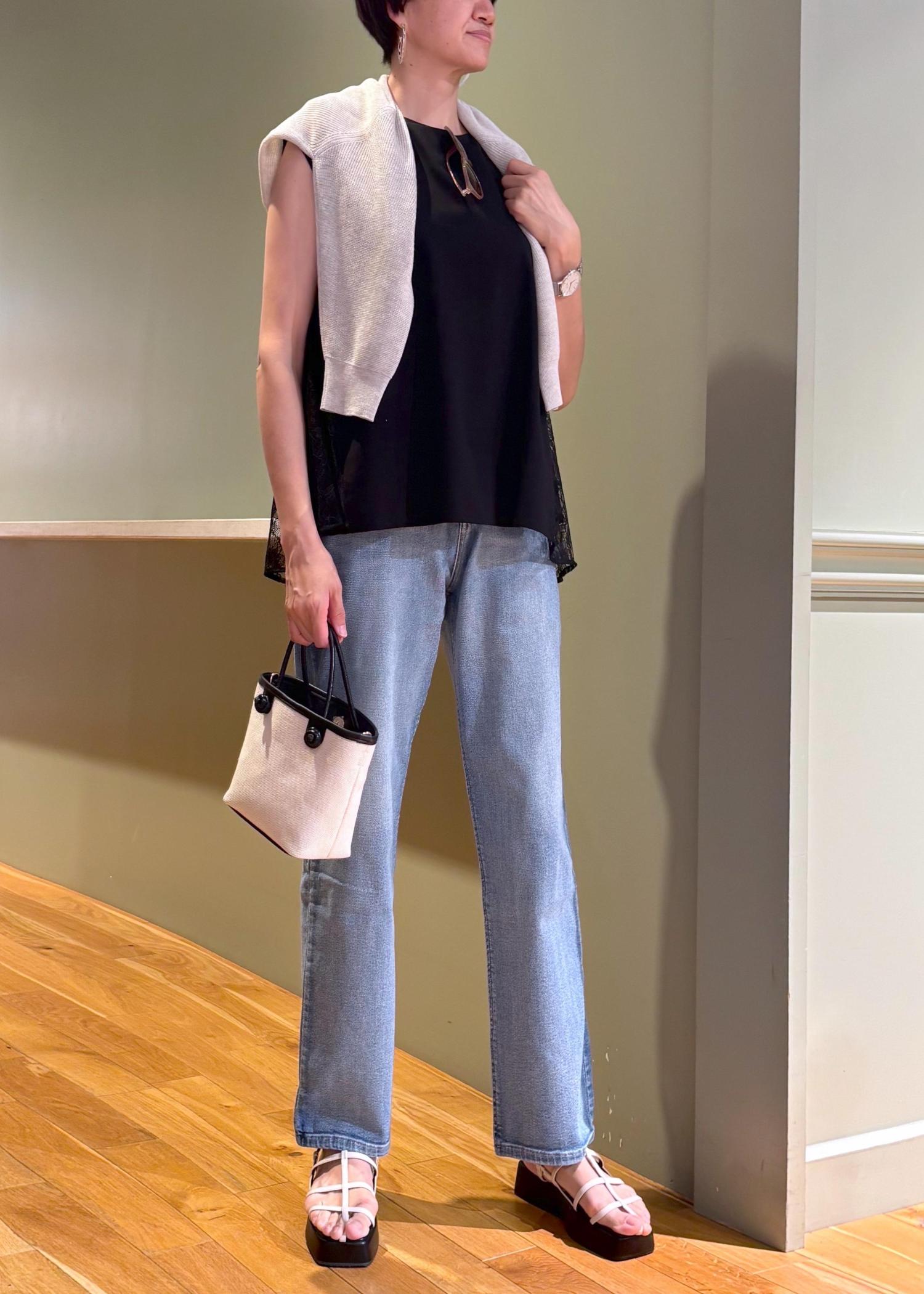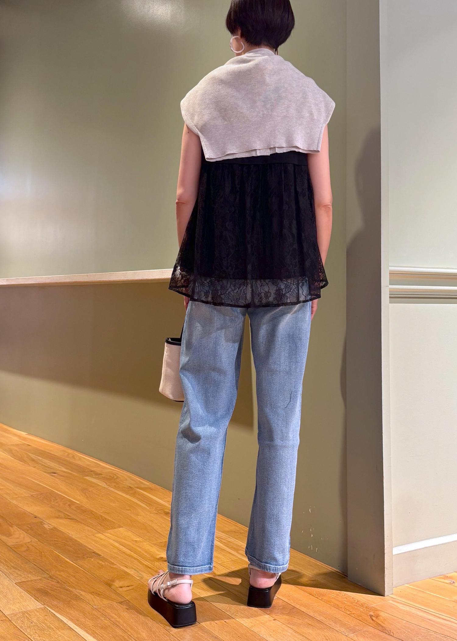 後ろ姿がポイントのバックレースカットソーは、ゆったりしたシルエットで丈が長めなので、パンツスタイルはもちろん、ロングのタイトスカートを合わせても素敵です。
