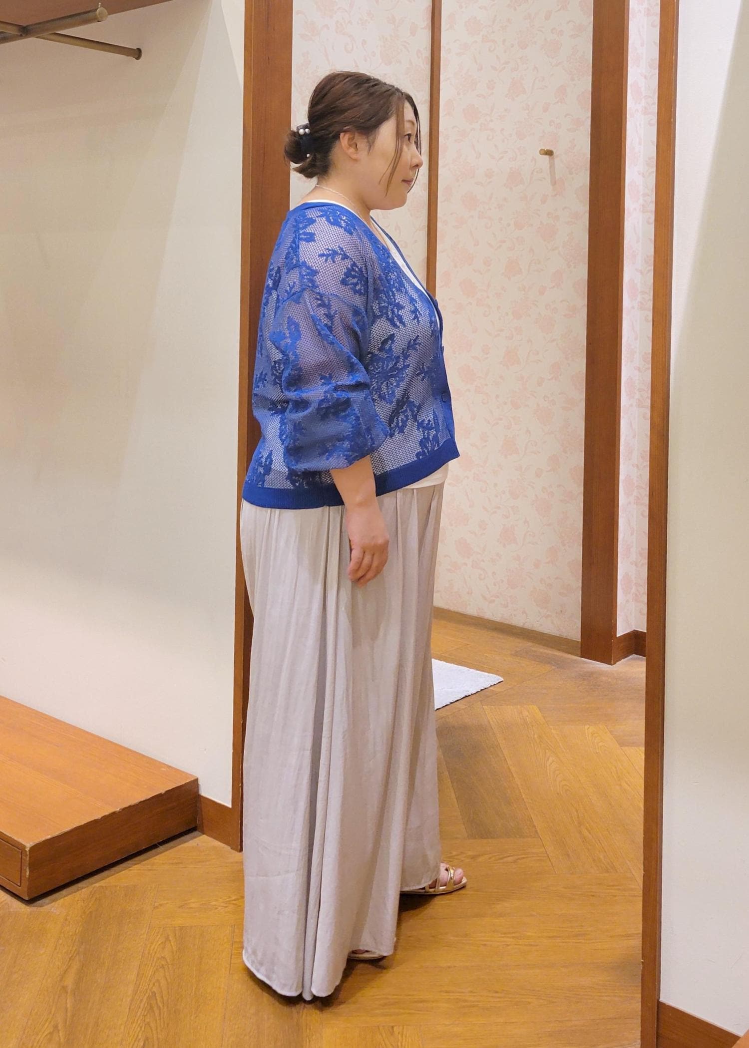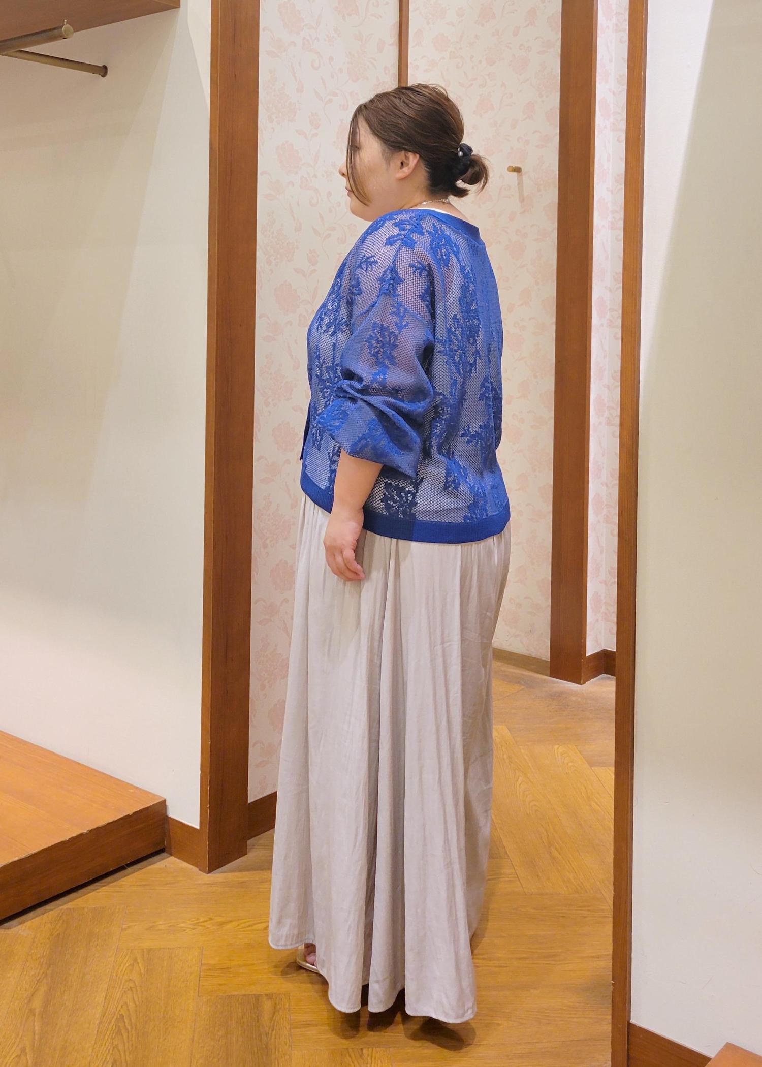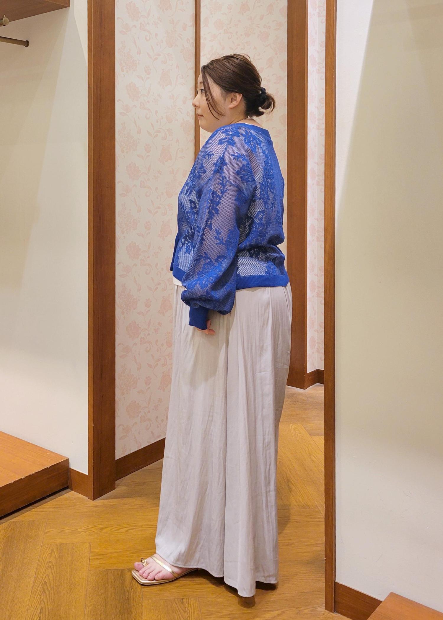 透け感のあるカーディガンをスカーチョで合わせたカジュアルコーデです。きれいなブルーが映えるので他のアイテムはシンプルにしました。