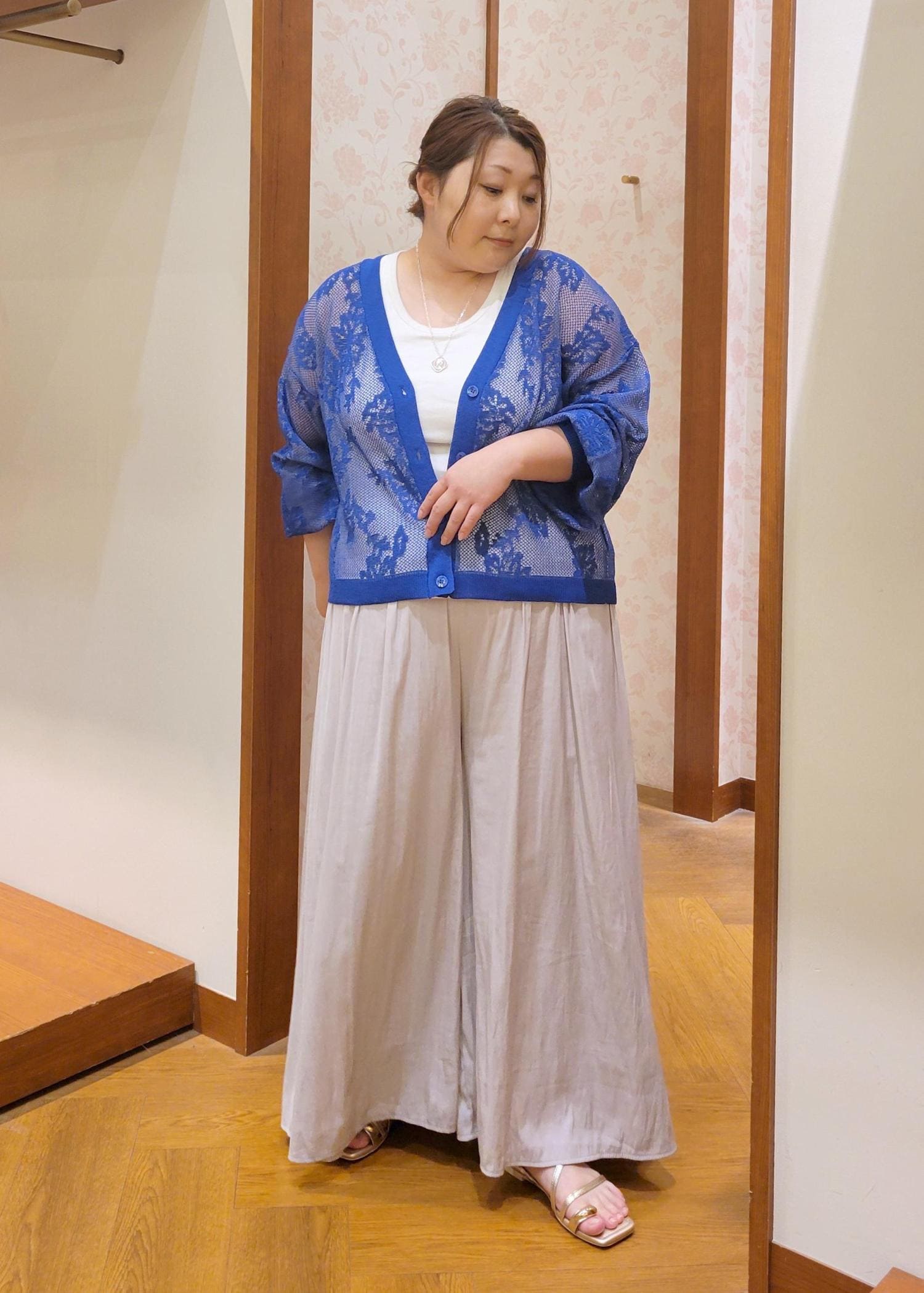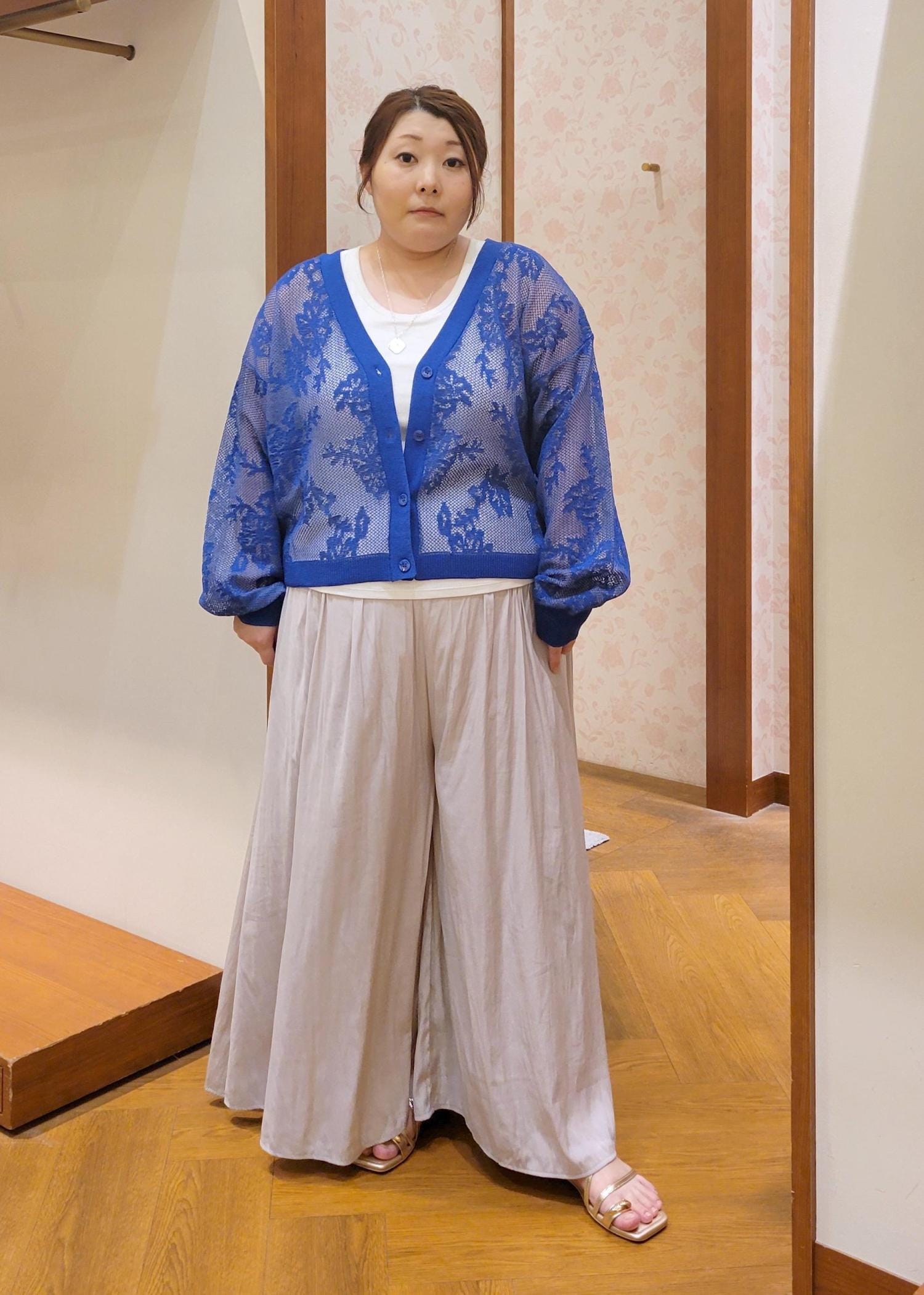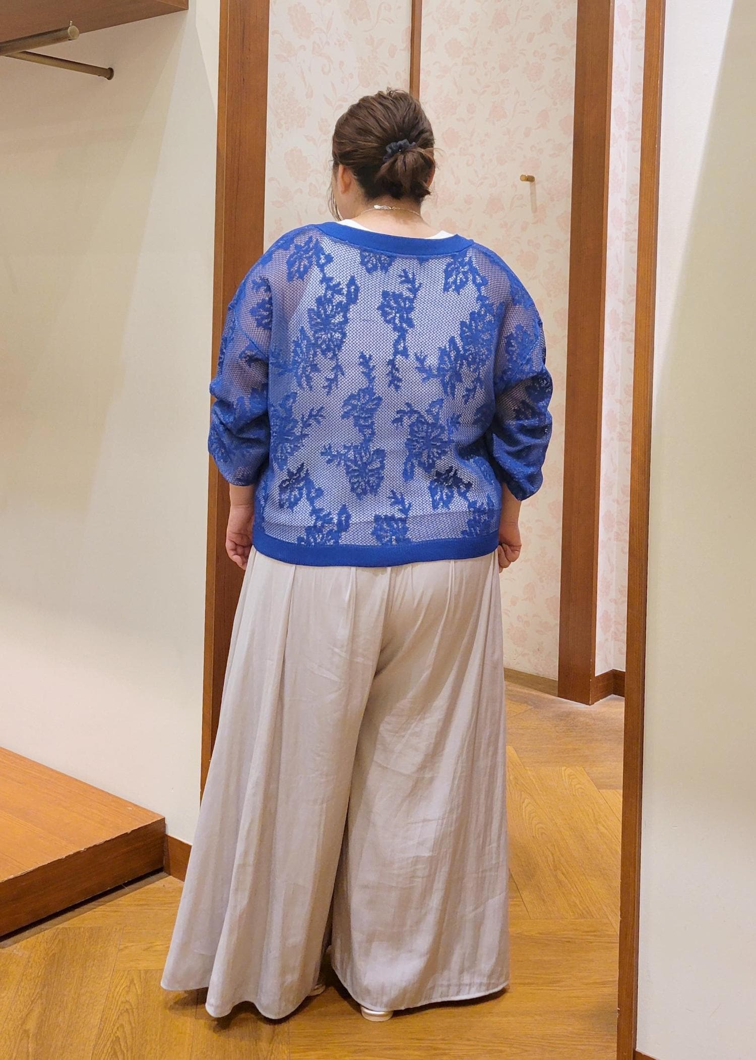 透け感のあるカーディガンをスカーチョで合わせたカジュアルコーデです。きれいなブルーが映えるので他のアイテムはシンプルにしました。