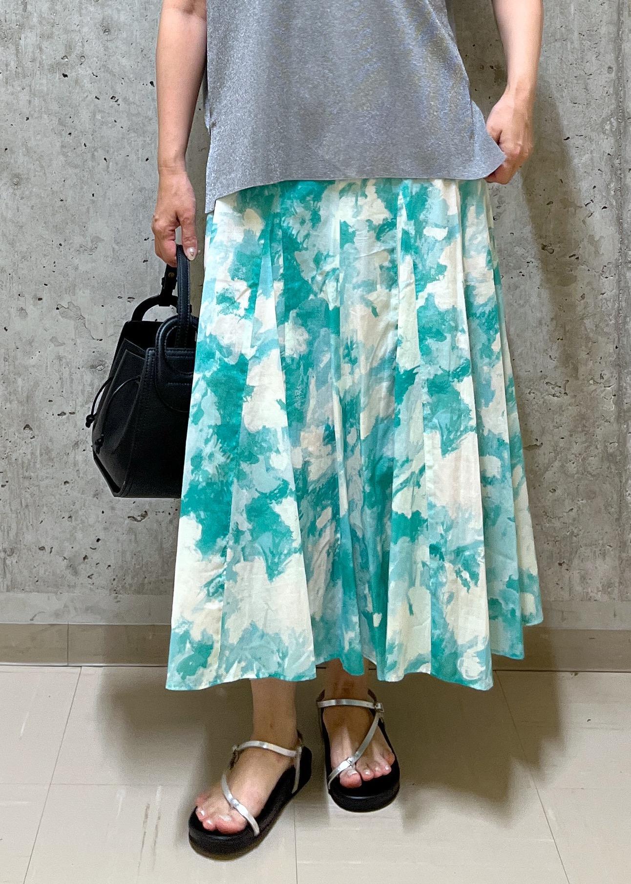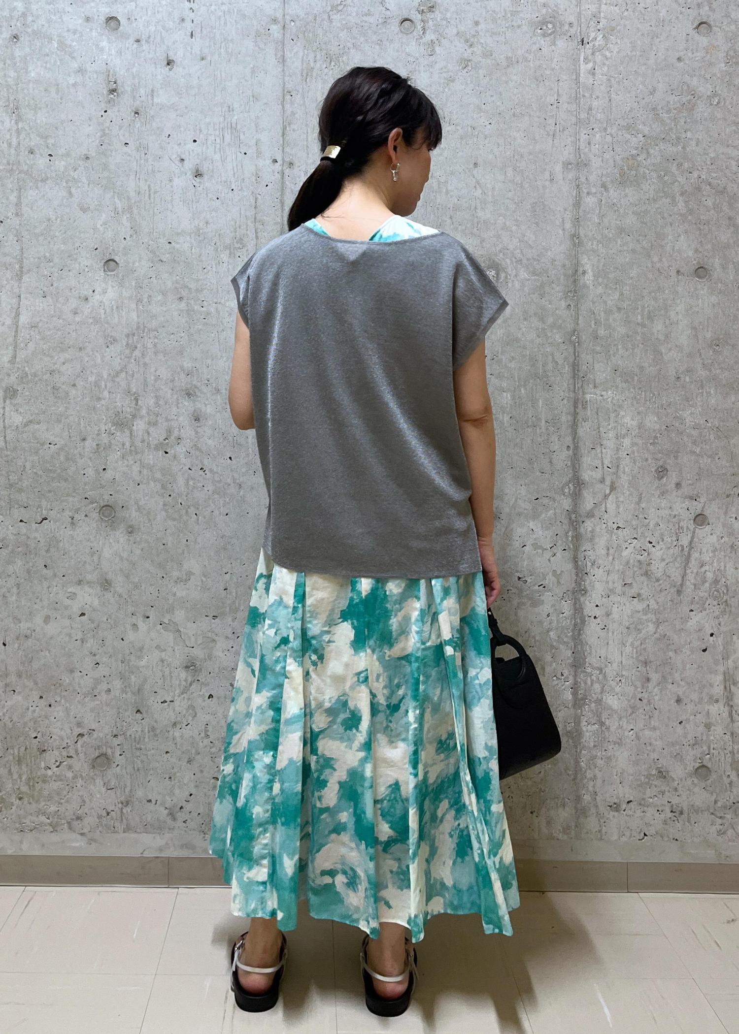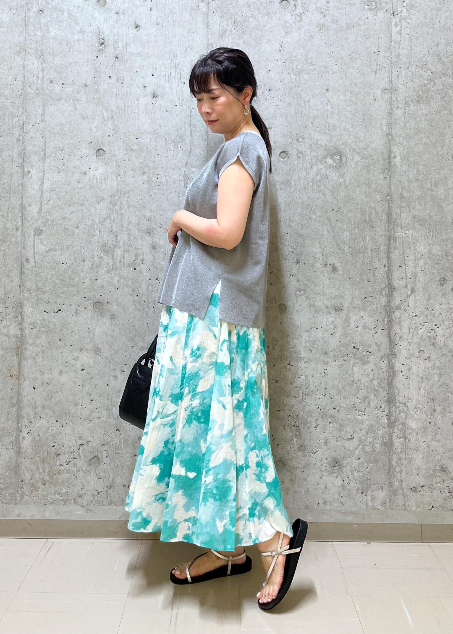 爽やかな柄のワンピースにシャイニーなニットを合わせて、夏らしい涼し気な感じにしました。