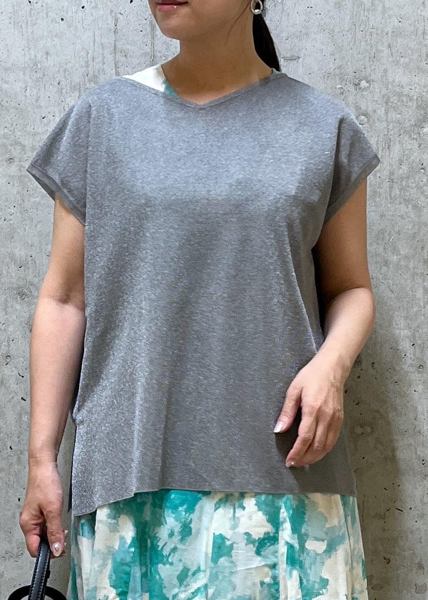 深すぎないVネックがデコルテをキレイに見せてくるデザインです。